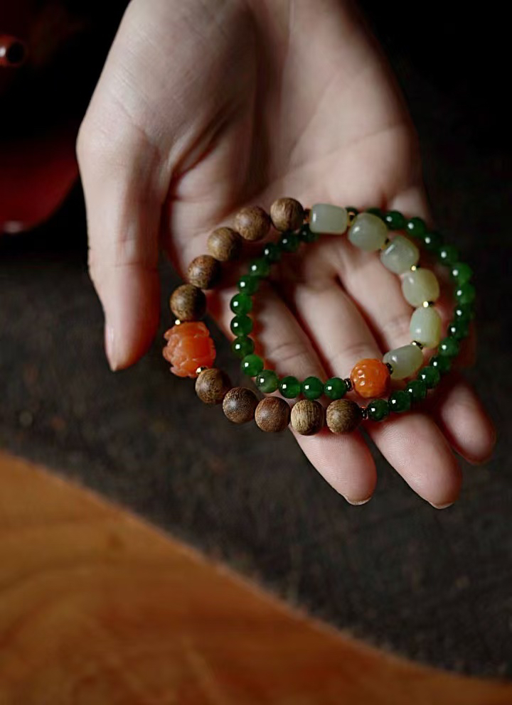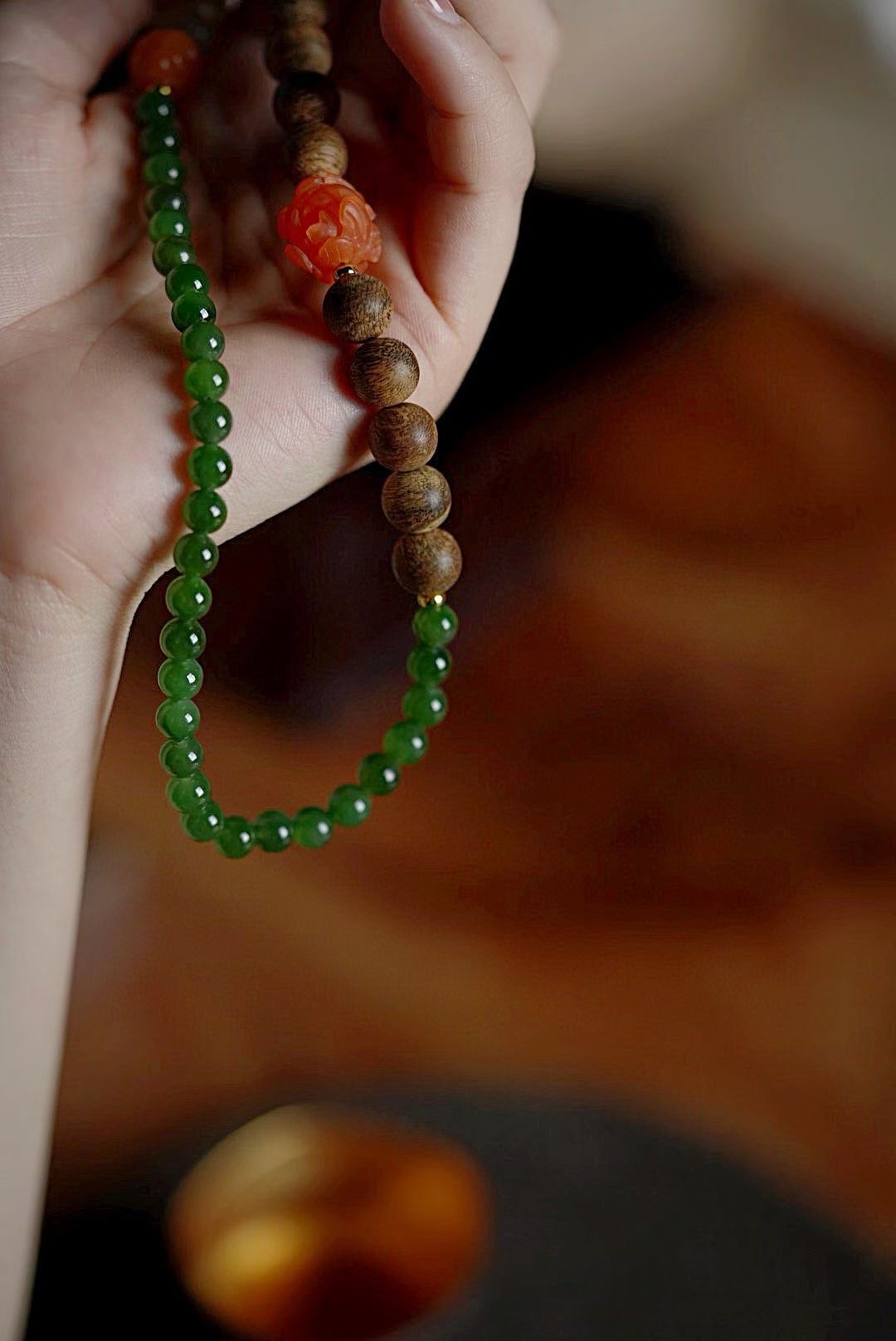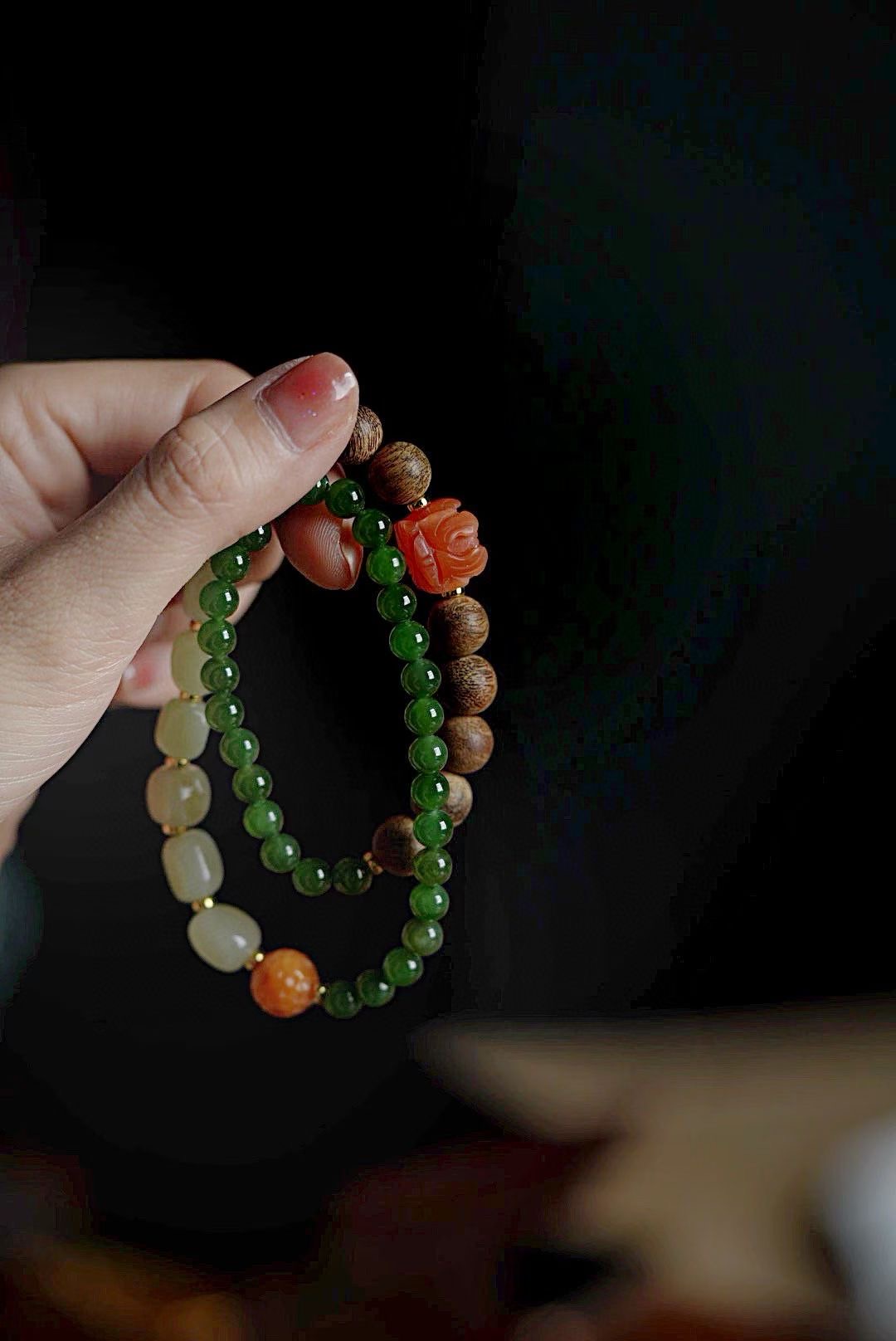 配饰:南红花、碧玉、和田玉随形珠、缅黄锤纹珠。
