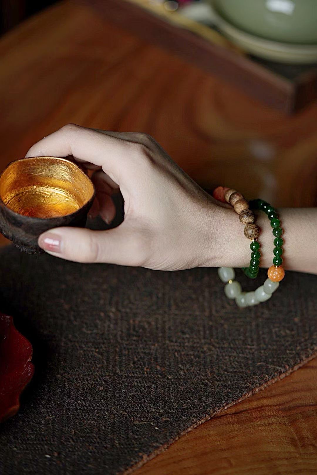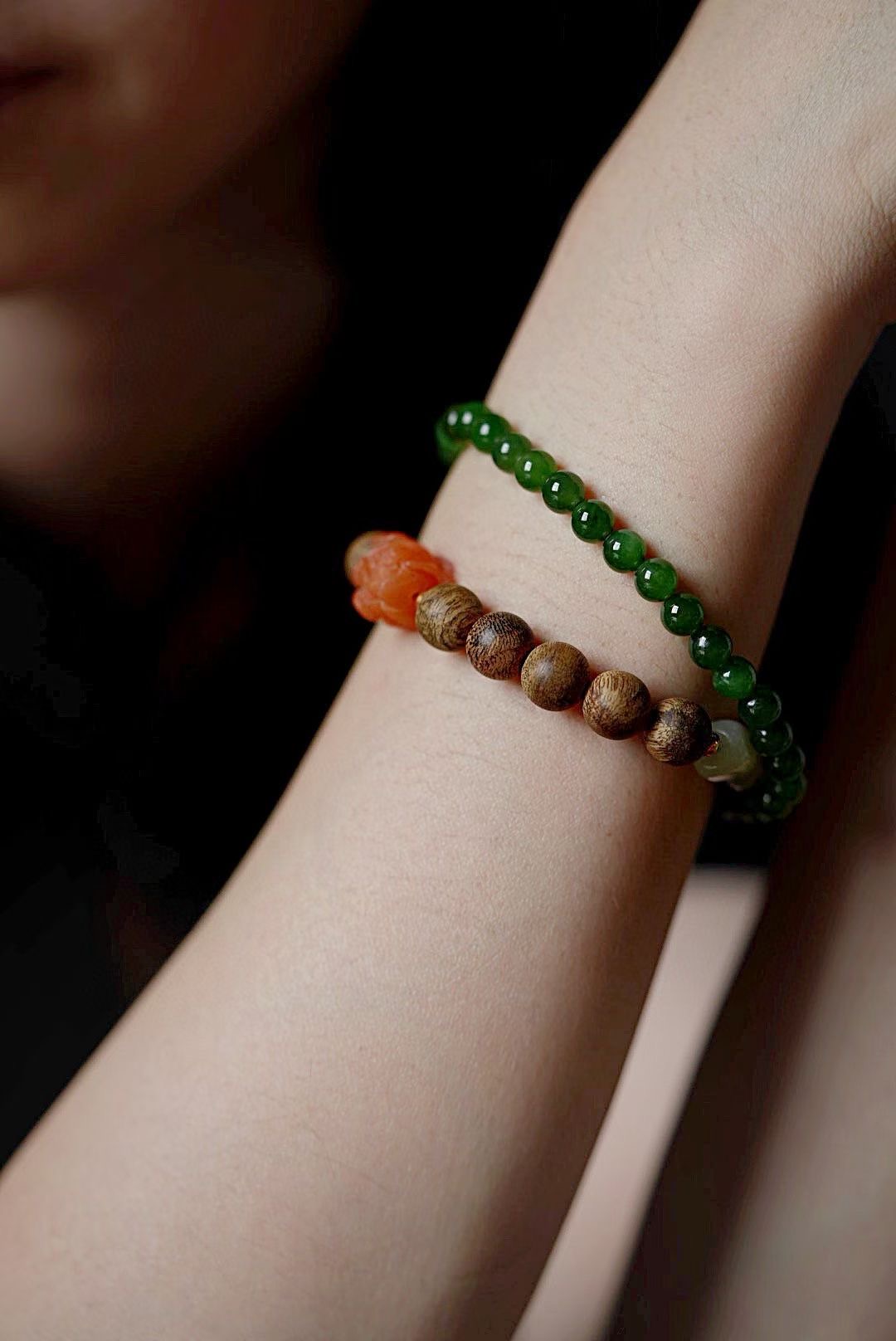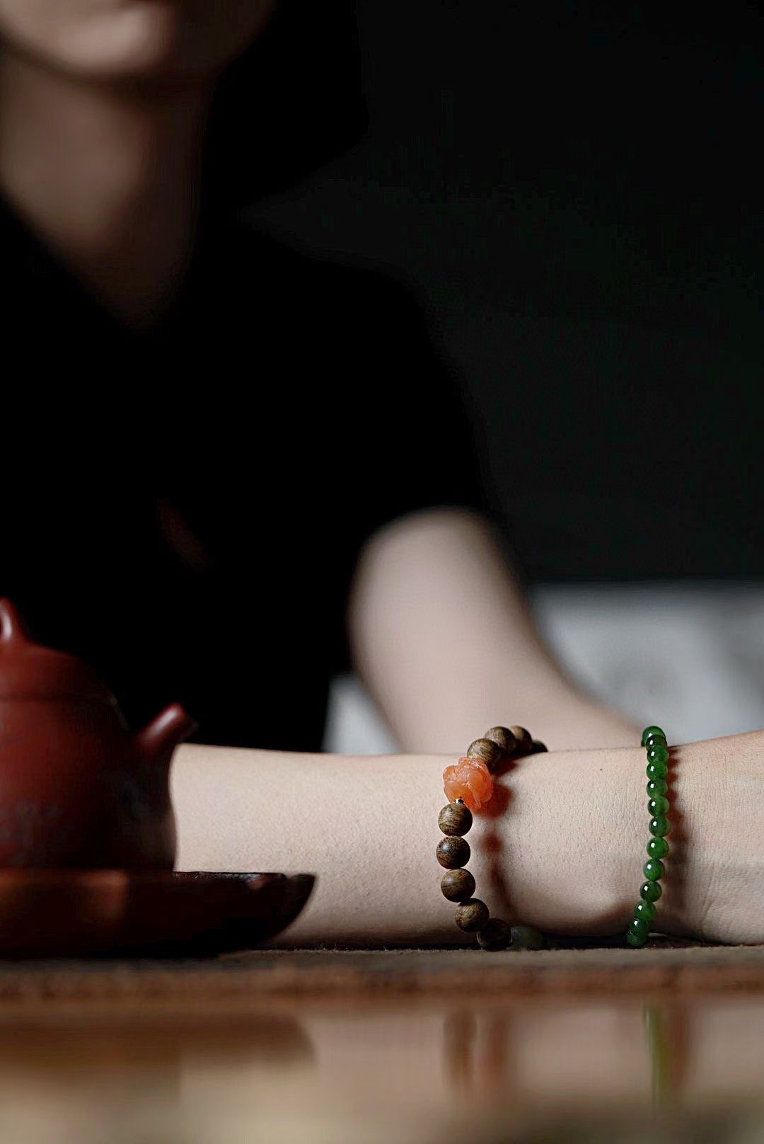 配饰:南红花、碧玉、和田玉随形珠、缅黄锤纹珠。