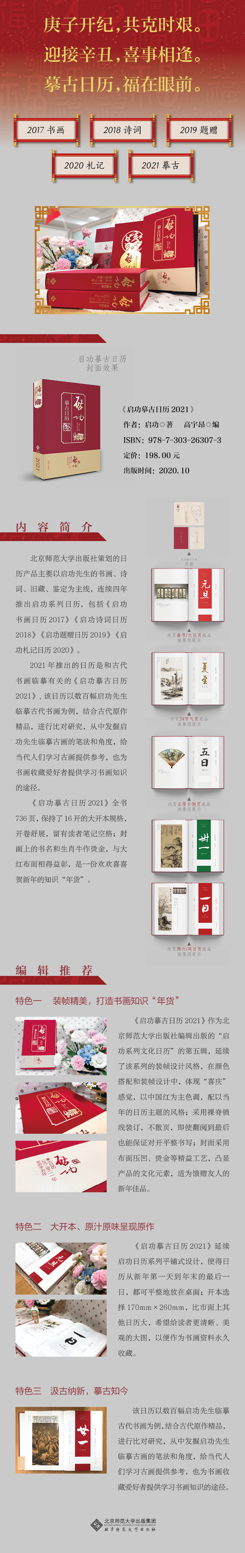 《启功摹古日历2021》作为北京师范大学出版社编辑出版的“启功系列文化日历”的第五辑,延续了该系列的装帧设计风格,在颜色搭配和装帧设计中,体现“喜庆”感觉,以中国红为主色调,配以当年的日历主题的风格;采用裸脊锁线装订,不散页,即使翻阅到最后也能保证对开平整书写;封面采用布面压凹、烫金等精益工艺,凸显产品的文化元素,作为馈赠友人的新年佳品。