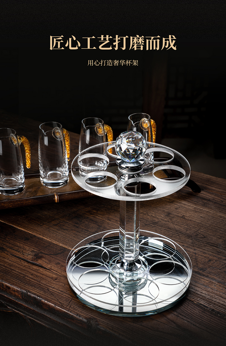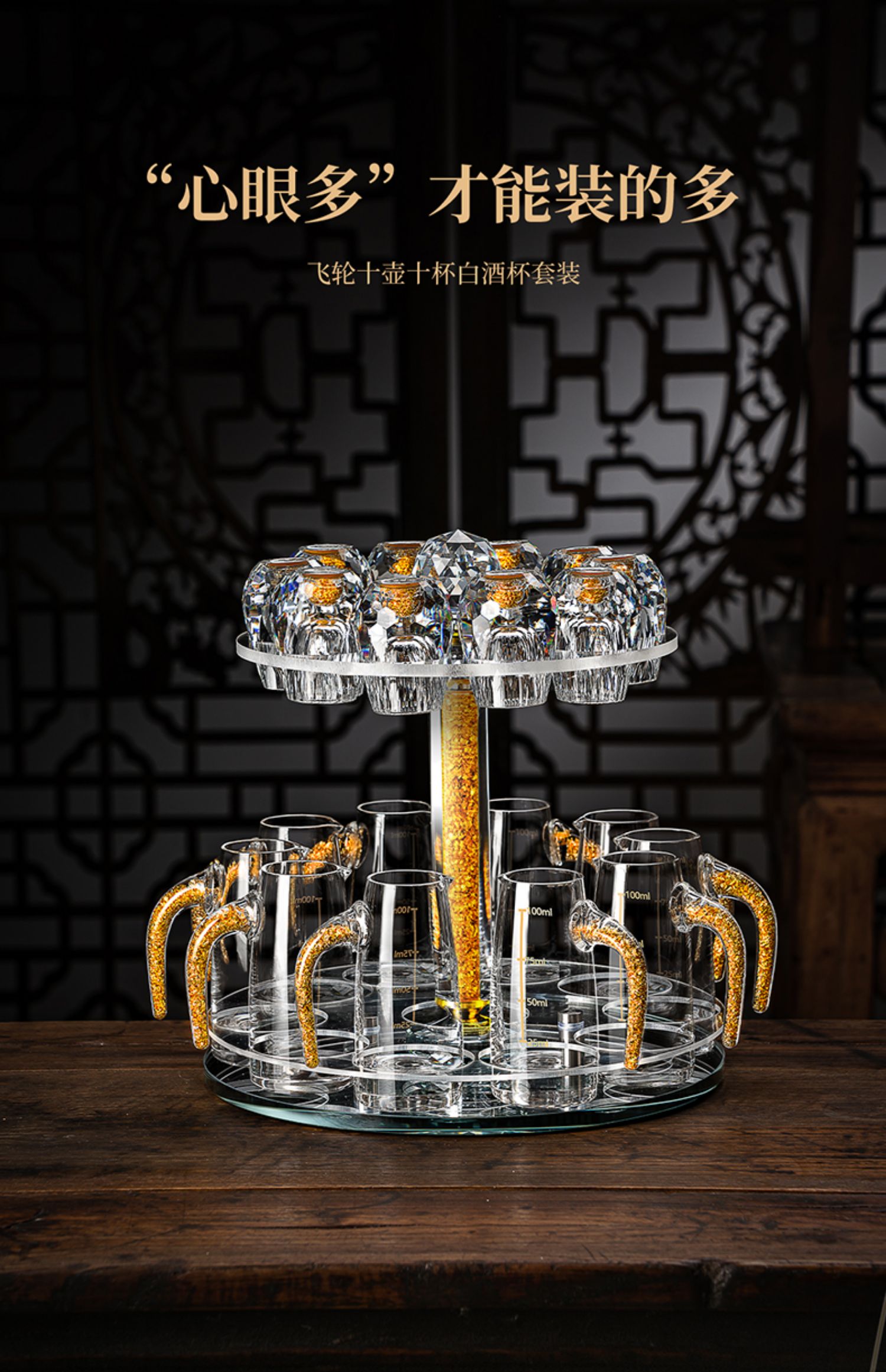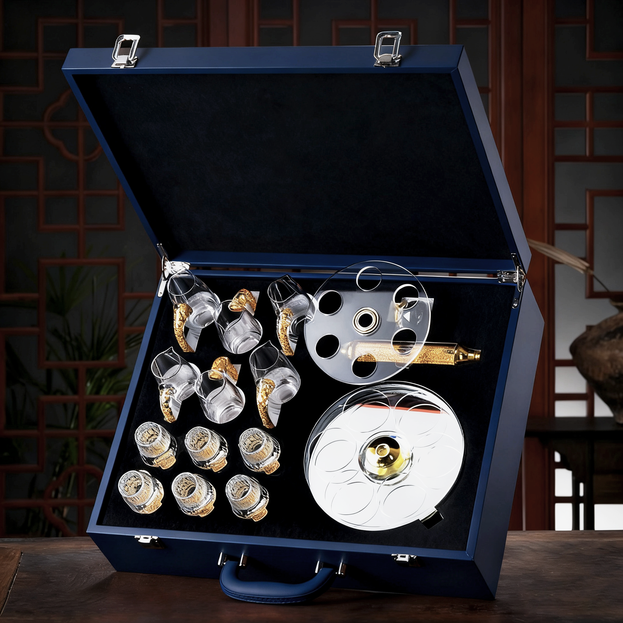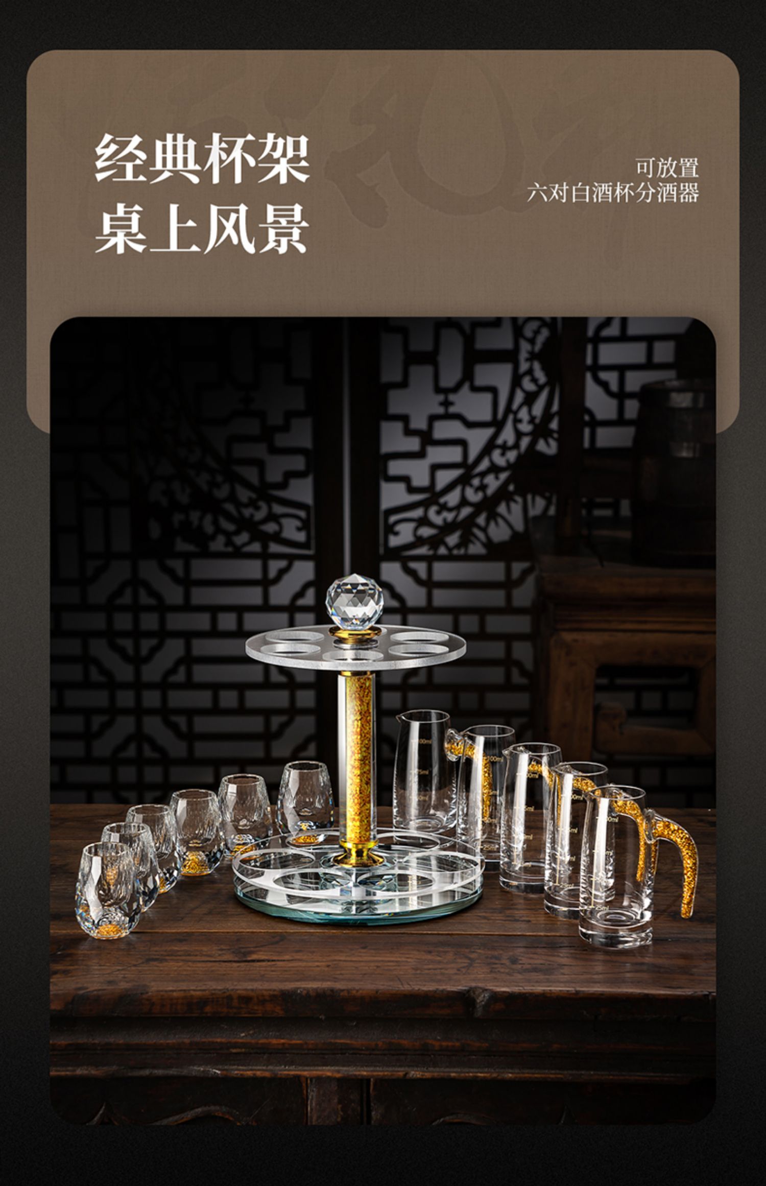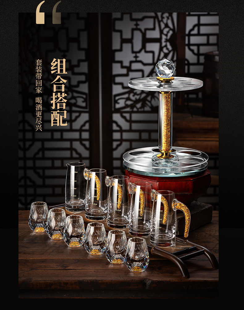 【特惠6折,仅1套,无货退款】玻璃白酒杯分酒器家用小酒杯一口杯高档酒具礼盒皮箱装送人乔迁生活本色金箔白酒具6杯6壶套装(带旋转杯架)
