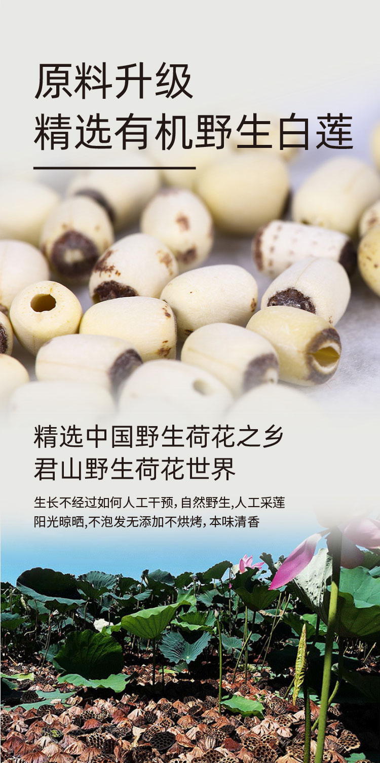 6.“10+1”原料升级。有机莲子:精选中国野生荷花之乡--君山野生荷花世界的野生有机莲子。生长不经过如何人工干预,自然野生,人工采莲,阳光晾晒,不泡发无条加不烘烤,本味清香。
