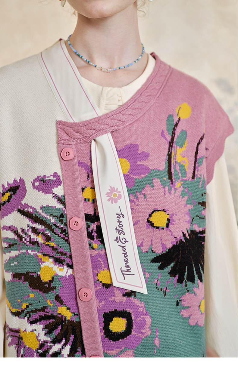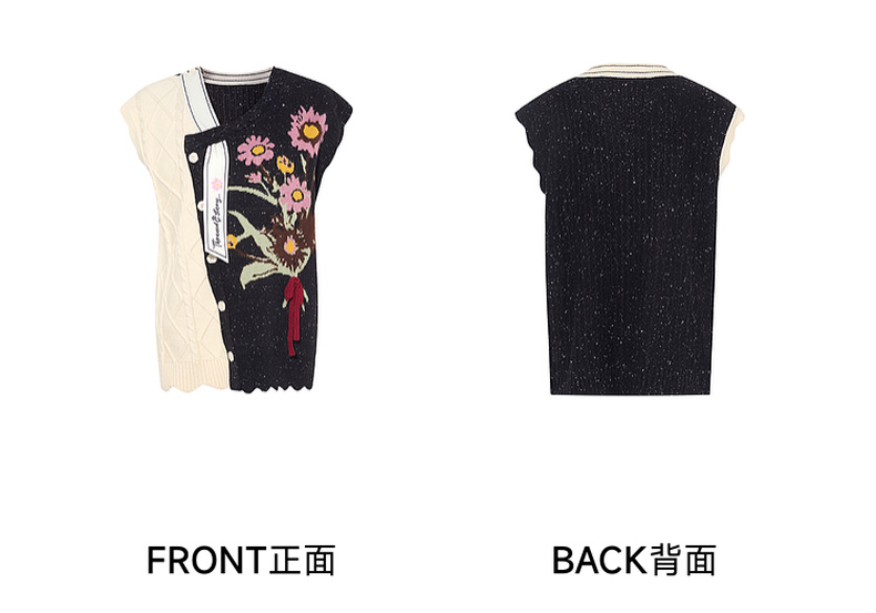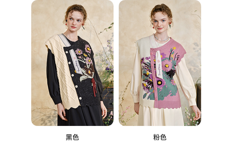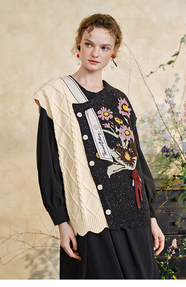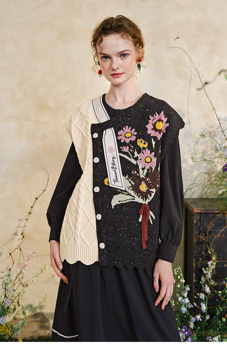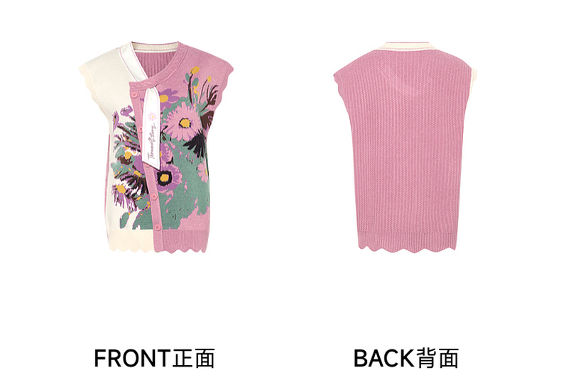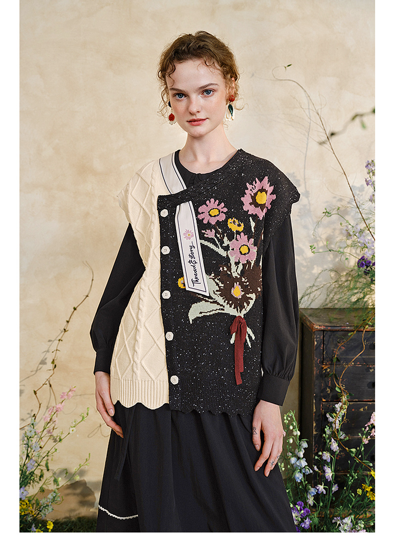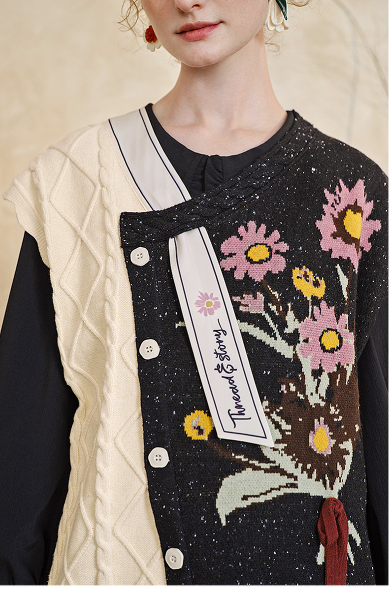 两三事 半梦花醒 2025春季新款拼色花卉图案领带装饰无袖针织衫女