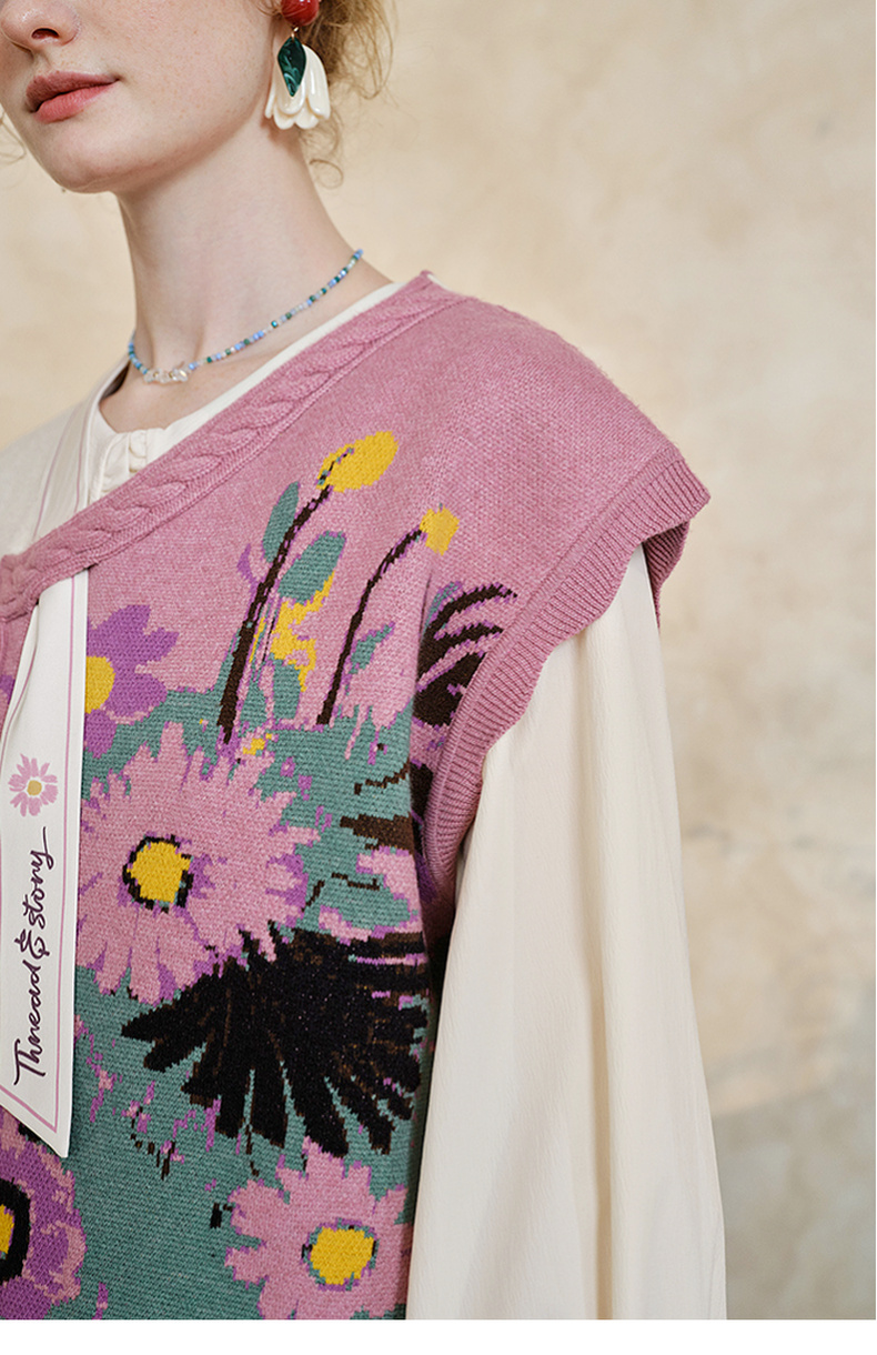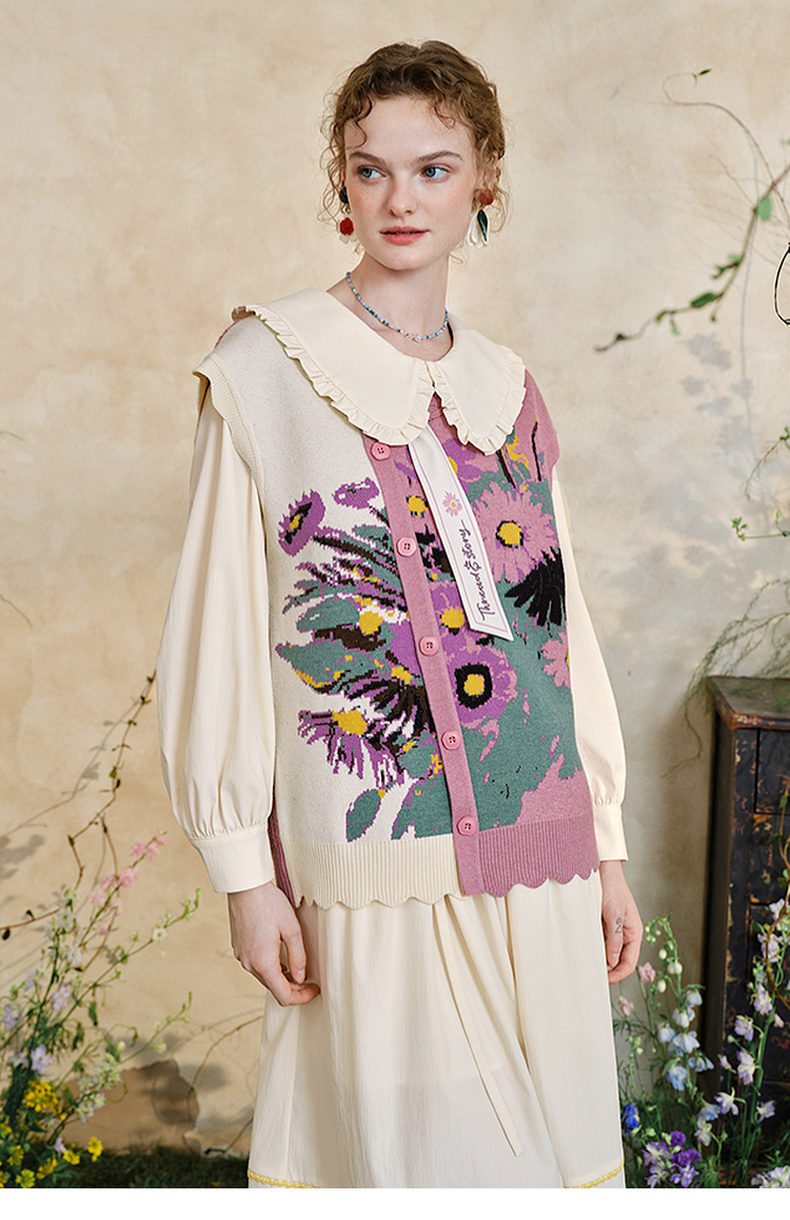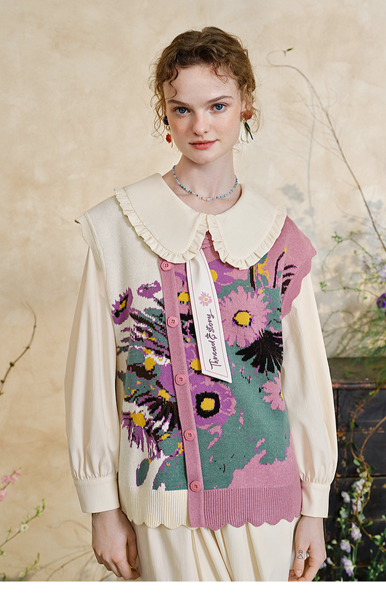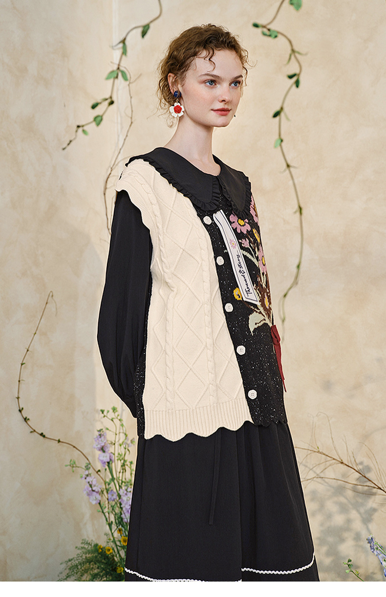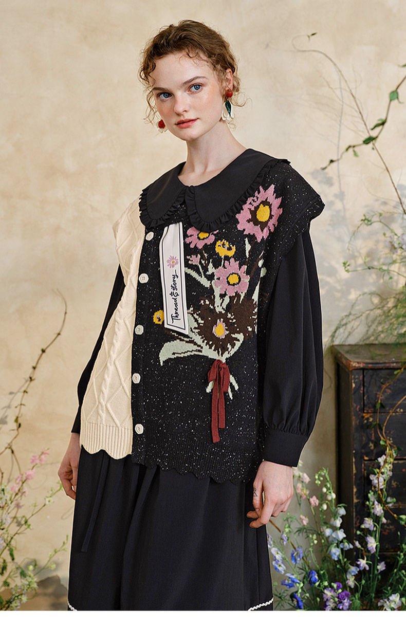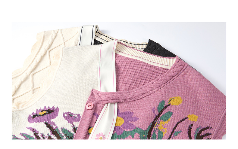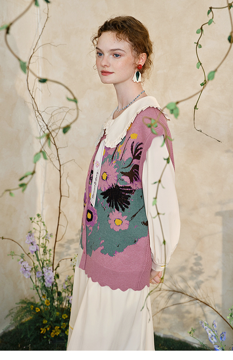 两三事 半梦花醒 2025春季新款拼色花卉图案领带装饰无袖针织衫女