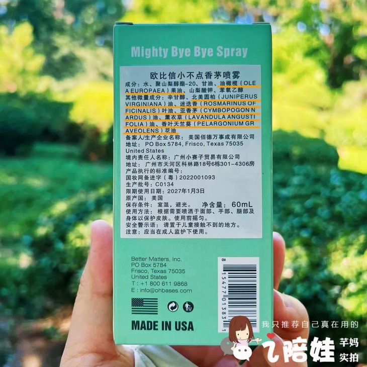 喷雾是植物配方,我通过孩子咬包的数量判断,在不是蚊子特别密集的地方,驱蚊效果和我之前入的差不多。