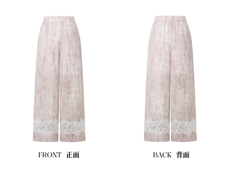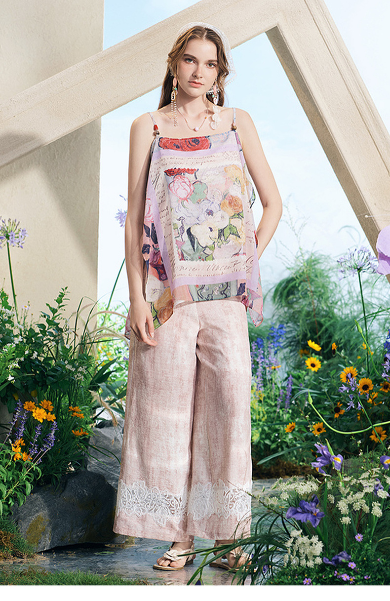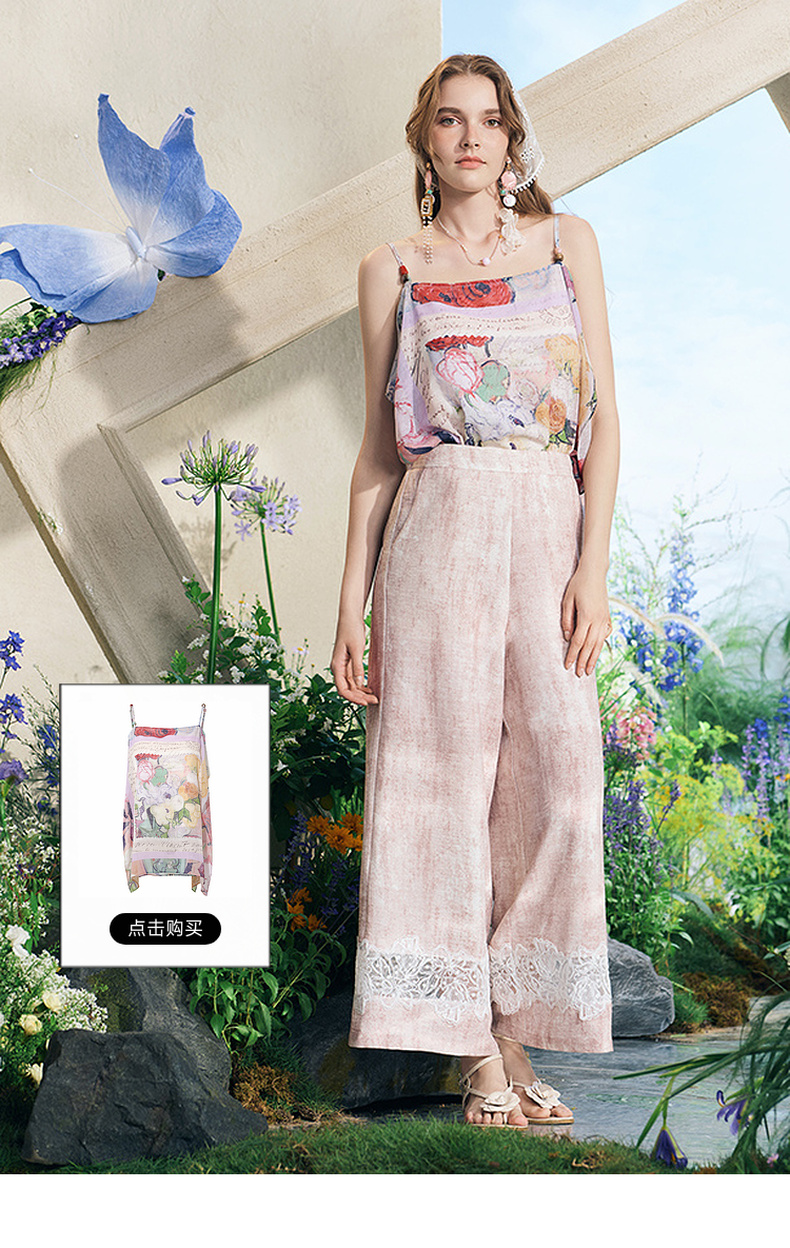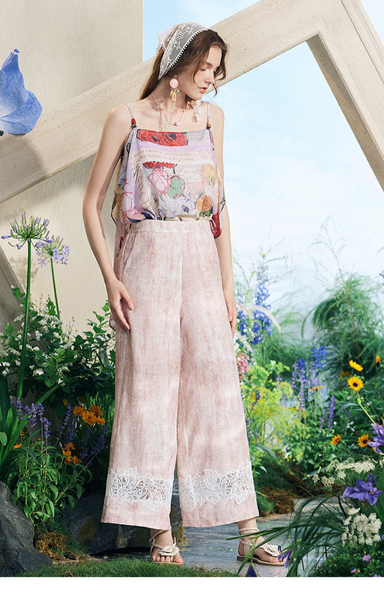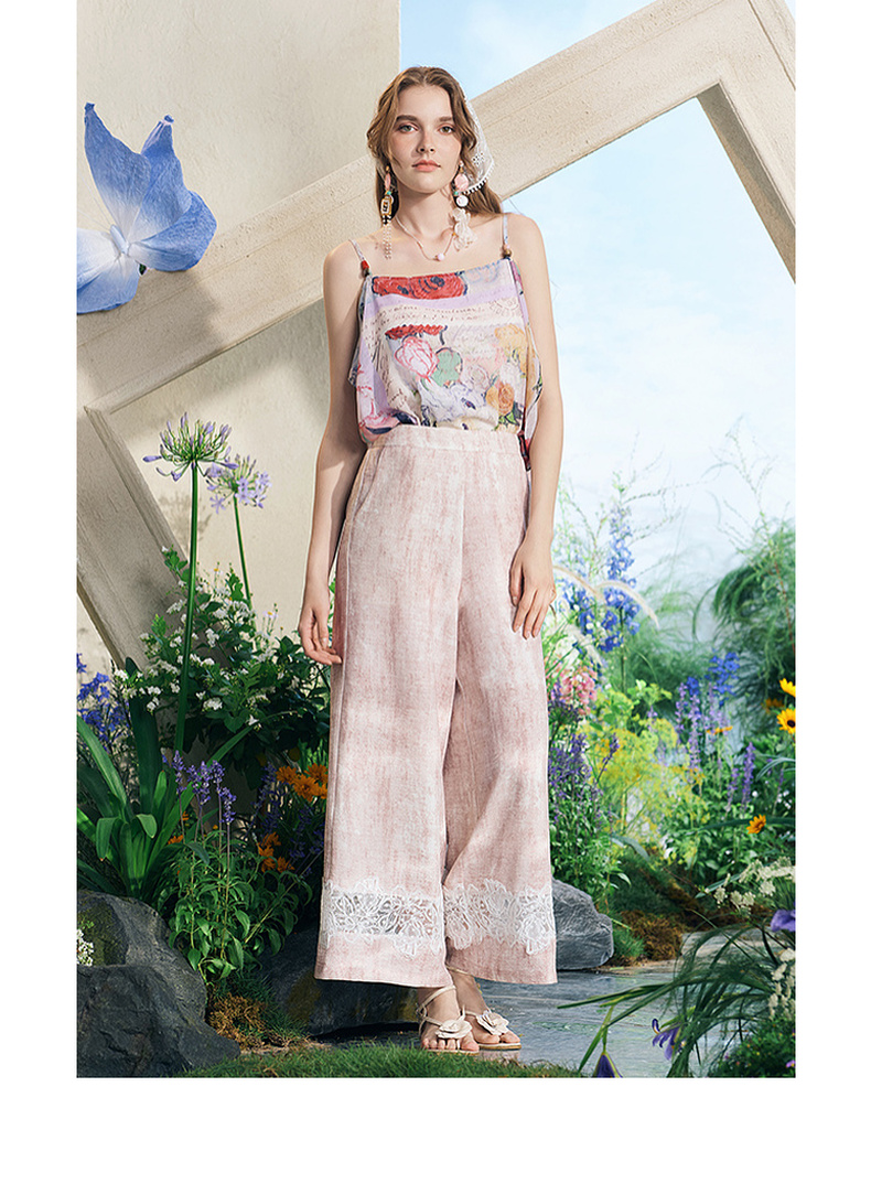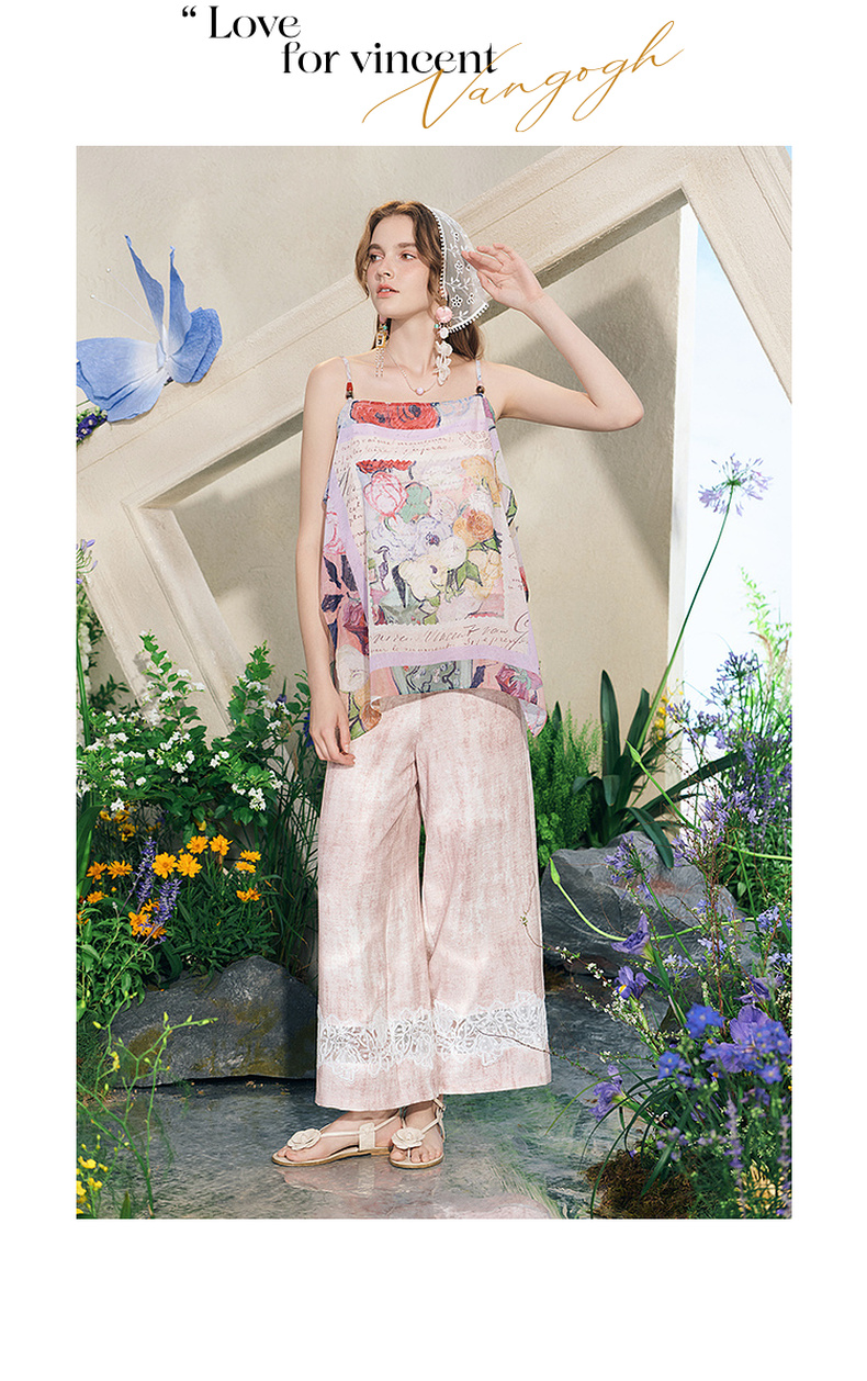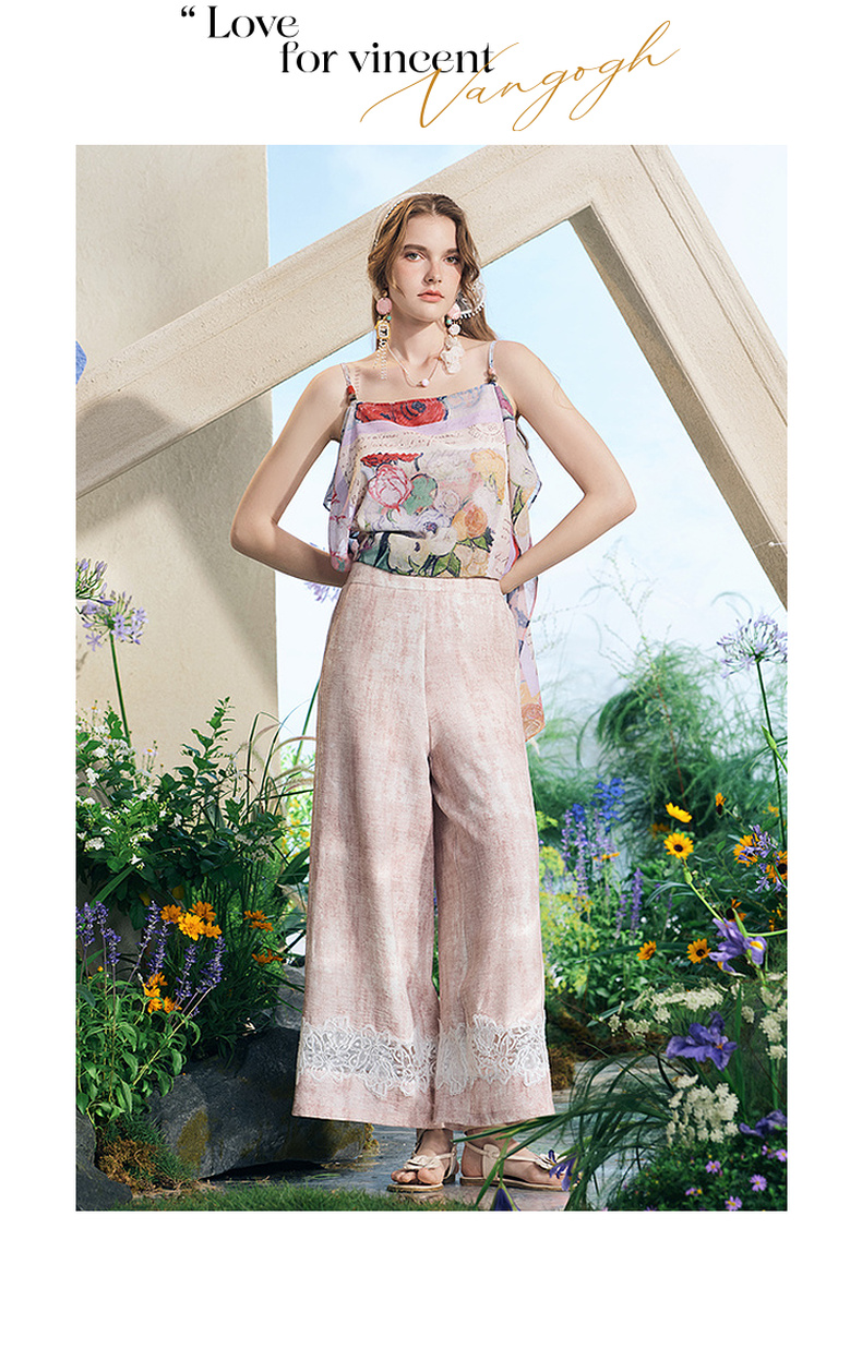 两三事梵高文艺粉墨晴雾2025夏新款复古蕾丝拼接印花阔腿休闲裤女
