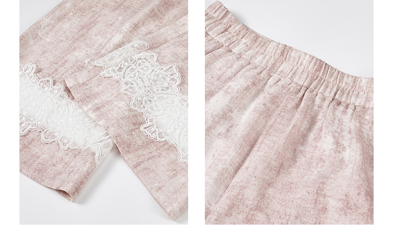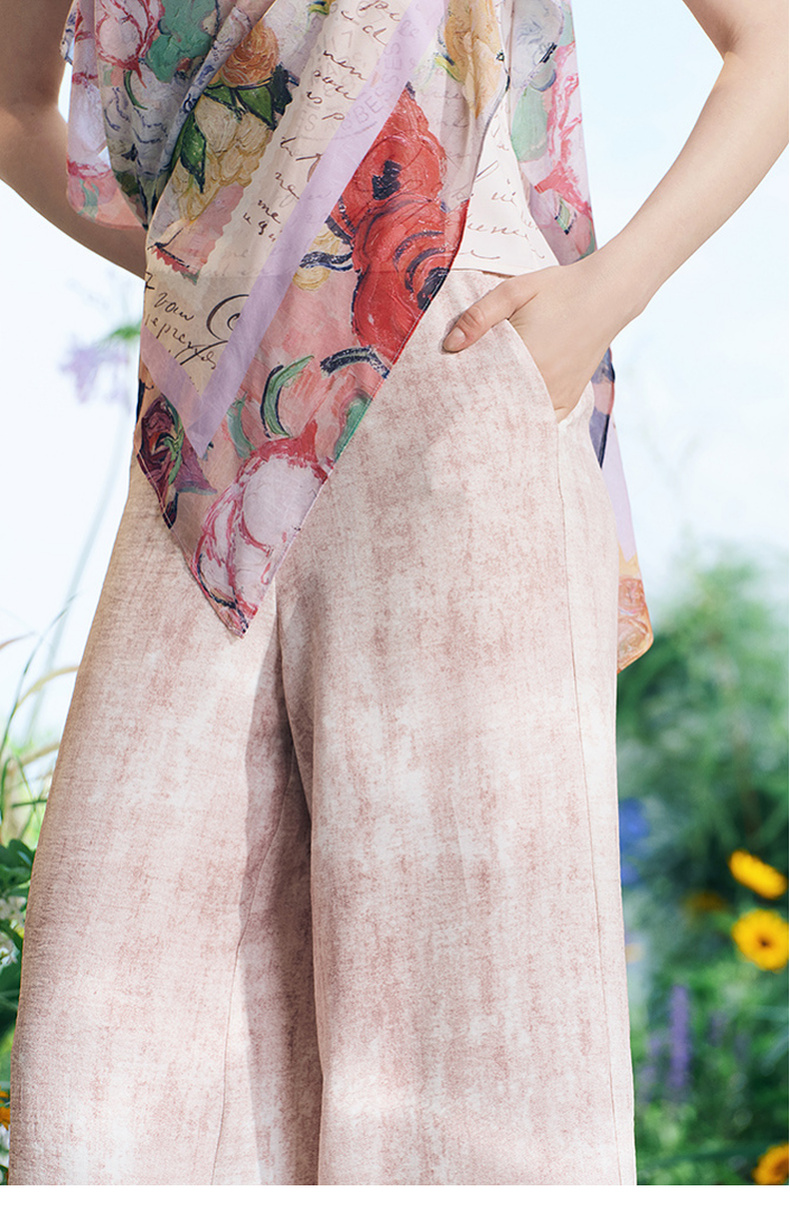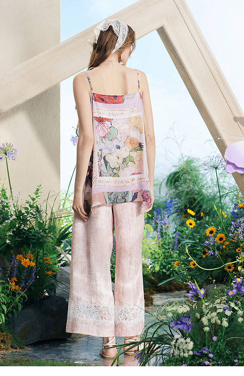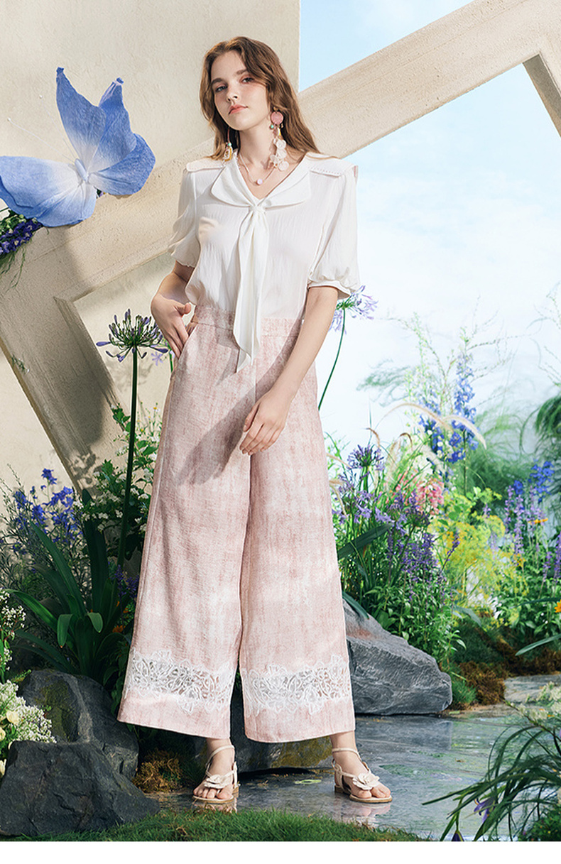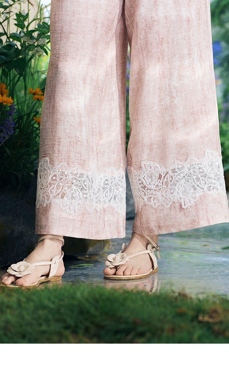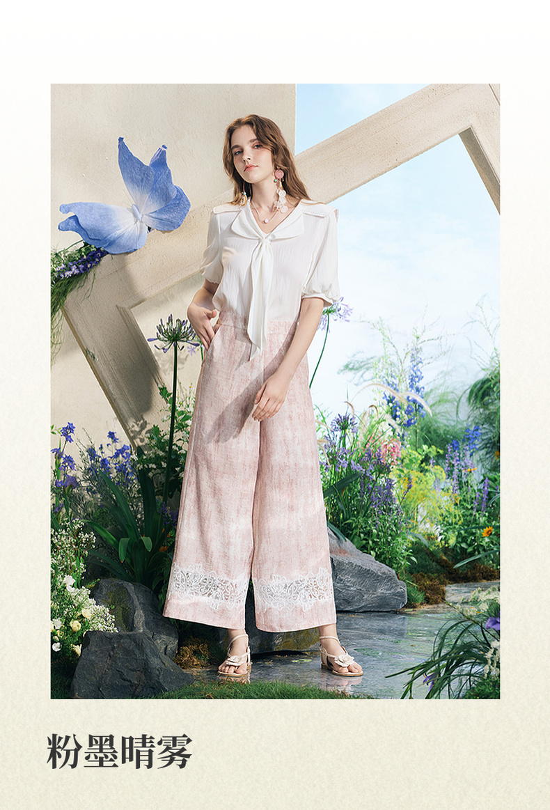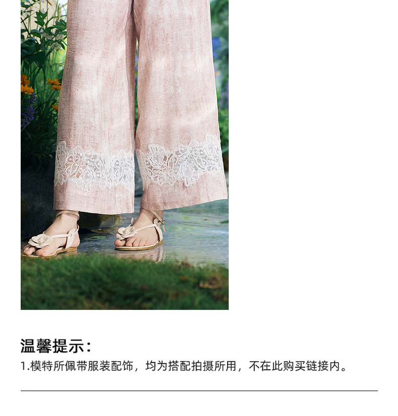 两三事梵高文艺粉墨晴雾2025夏新款复古蕾丝拼接印花阔腿休闲裤女