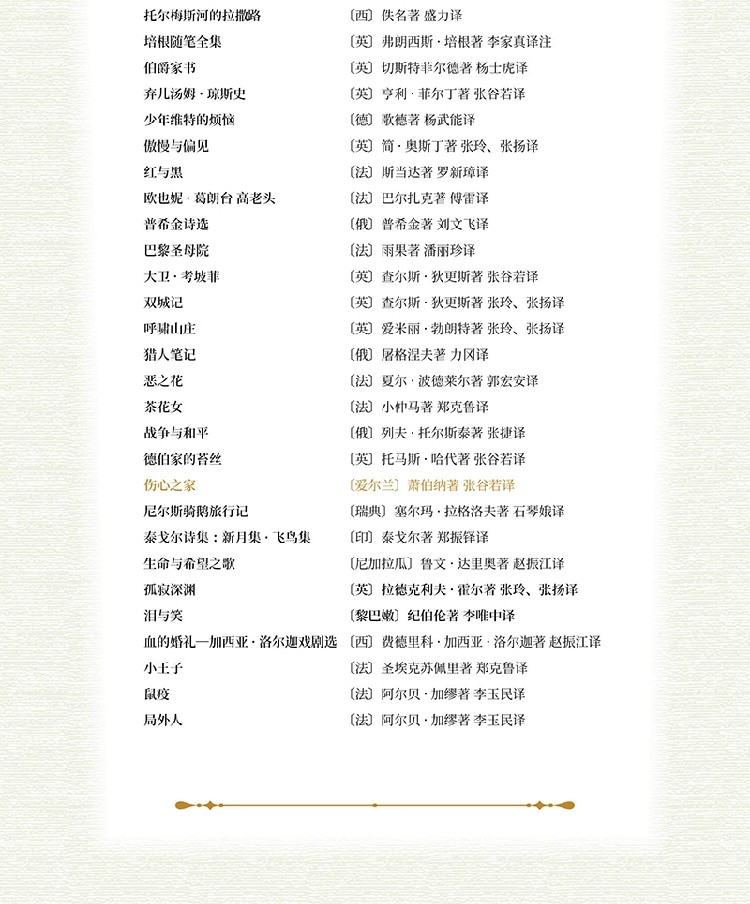 第一辑30种:《伊索寓言》《一千零一夜》《托尔梅斯河的拉撒路》《培根随笔全集》《伯爵家书》《弃儿汤姆•琼斯史》《少年维特的烦恼》《傲慢与偏见》《红与黑》《欧也妮•葛朗台 高老头》《普希金诗选》《巴黎圣母院》《大卫•考坡菲》《双城记》《呼啸山庄》《猎人笔记》《恶之花》《茶花女》《战争与和平》《德伯家的苔丝》《伤心之家》《尼尔斯骑鹅旅行记》《泰戈尔诗集:新月集•飞鸟集》《生命与希望之歌》《孤寂深渊》《泪与笑》《血的婚礼:加西亚•洛尔迦戏剧选》《小王子》《鼠疫》《局外人》。