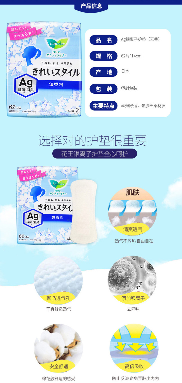 日本 花王乐而雅 Ag银离子消臭抗菌 超薄护垫 62片 无荧光剂无香