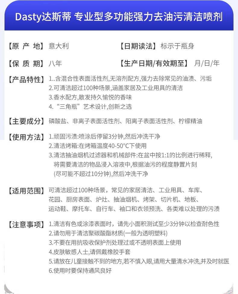 【中欧班列精选】意大利进口Dasty 多功能厨房油污净强力清洁剂1000ml