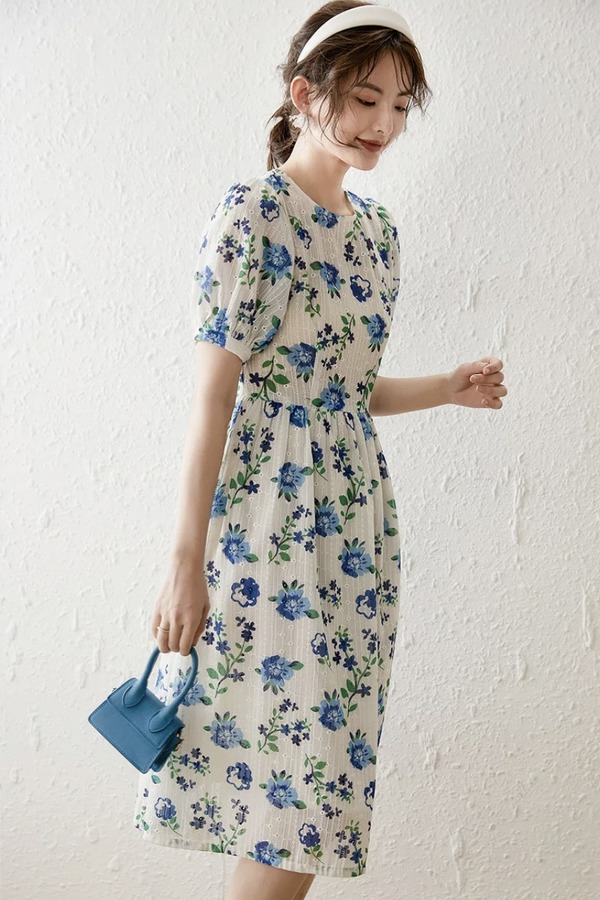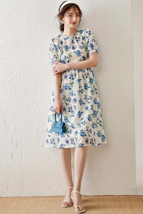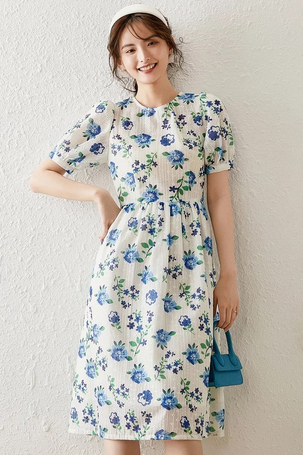 LOUIS YAO/白鹿语 大花朵泡泡袖圆领露背连衣裙 12491
