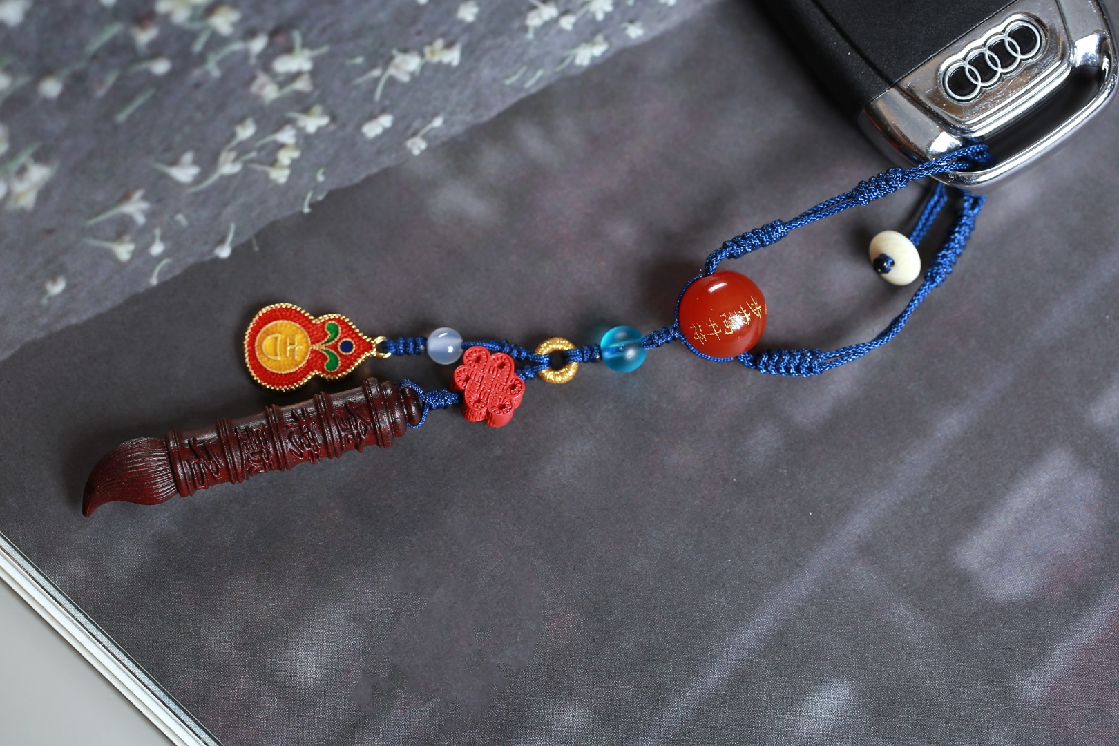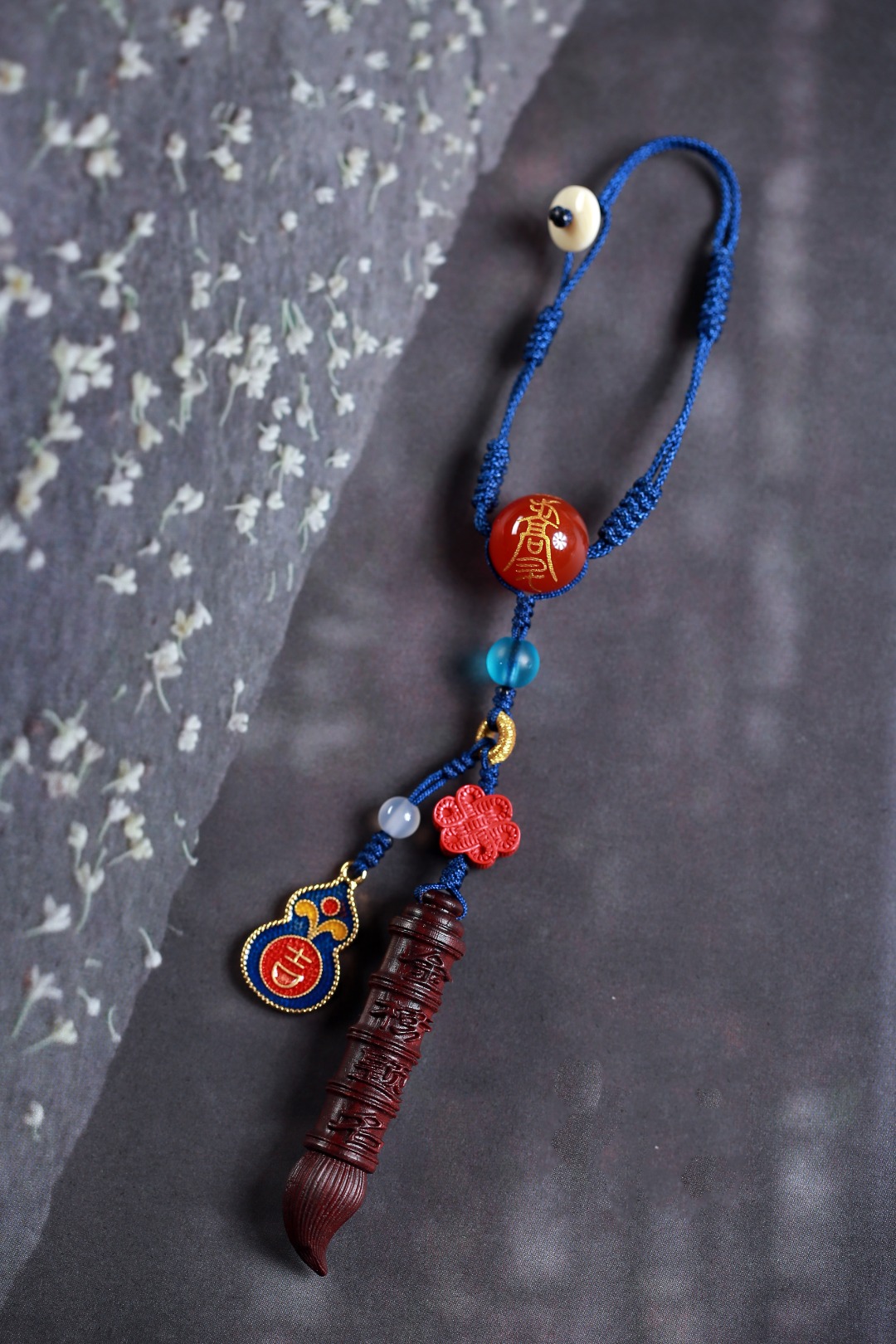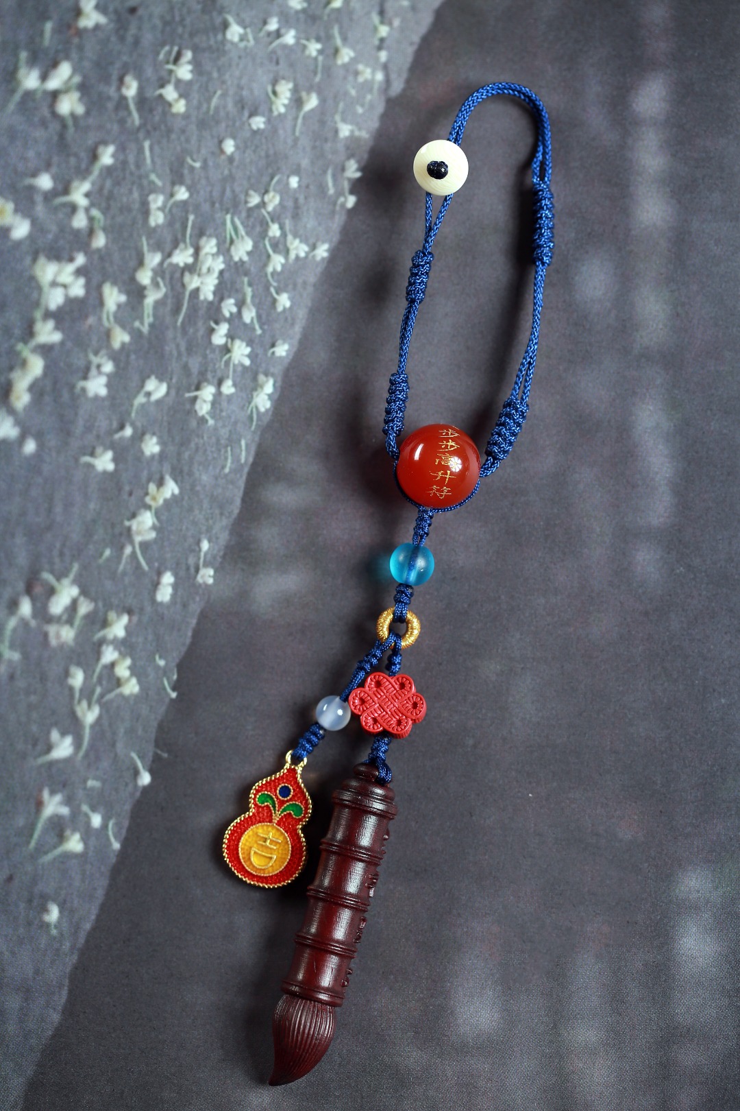 【设计理念】参照传统文昌题材制作,选取印度小叶紫檀为材,结合文昌笔、步步高升符、中国结、葫芦等元素进行设计。紫檀文昌笔,精巧雕刻,质感细腻,化煞转运,寄寓文昌助运、事业有成;红玛瑙“步步高升”符珠,图案清晰,象征官运亨通、步步高升;同时,搭配象征福禄吉祥的风水化煞葫芦、象征富贵不断的朱砂条纹中国结、以及白玛瑙、金线、琉璃、象牙果等配饰,整体手工制作,虔诚造物,吉祥美观,高雅大方。