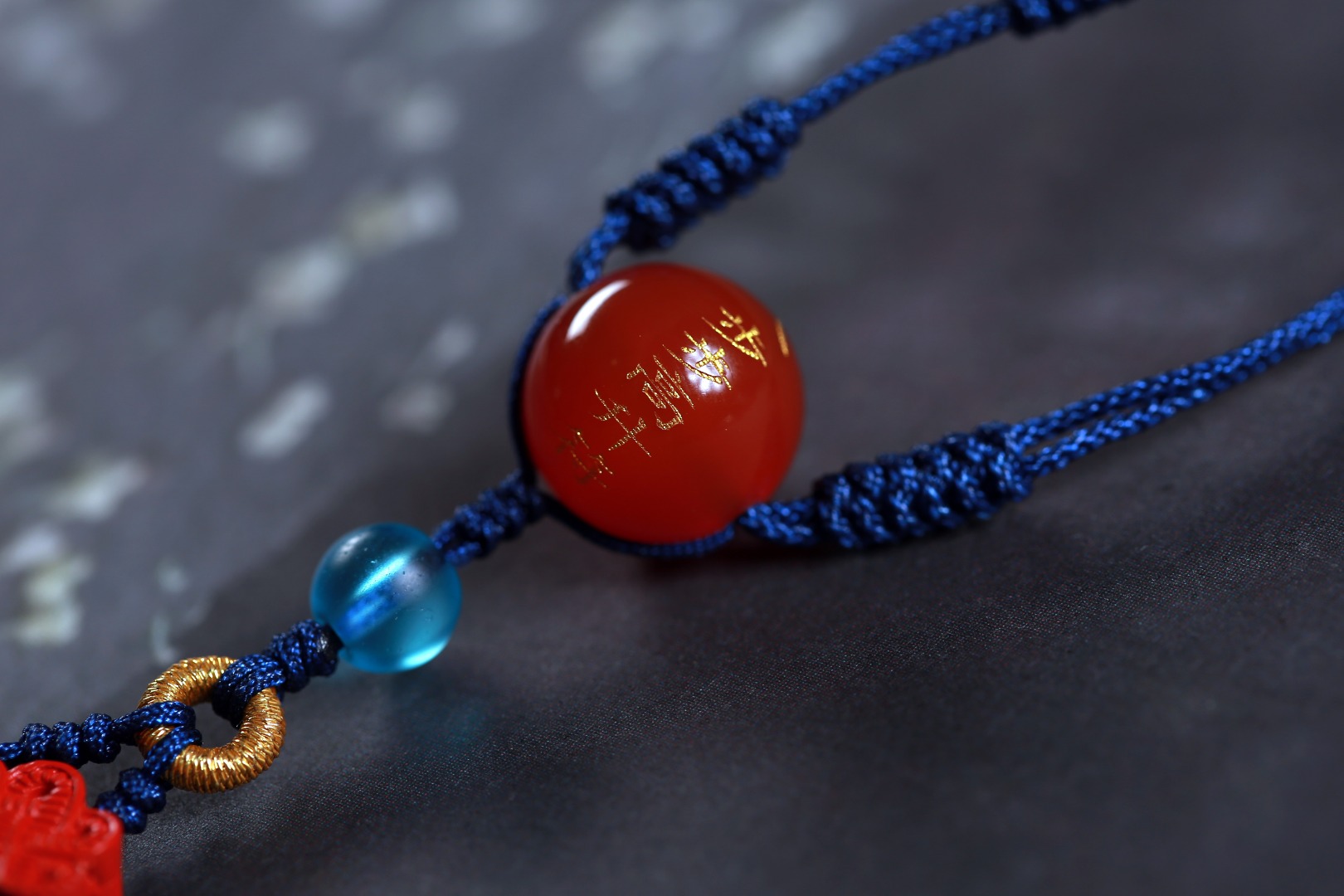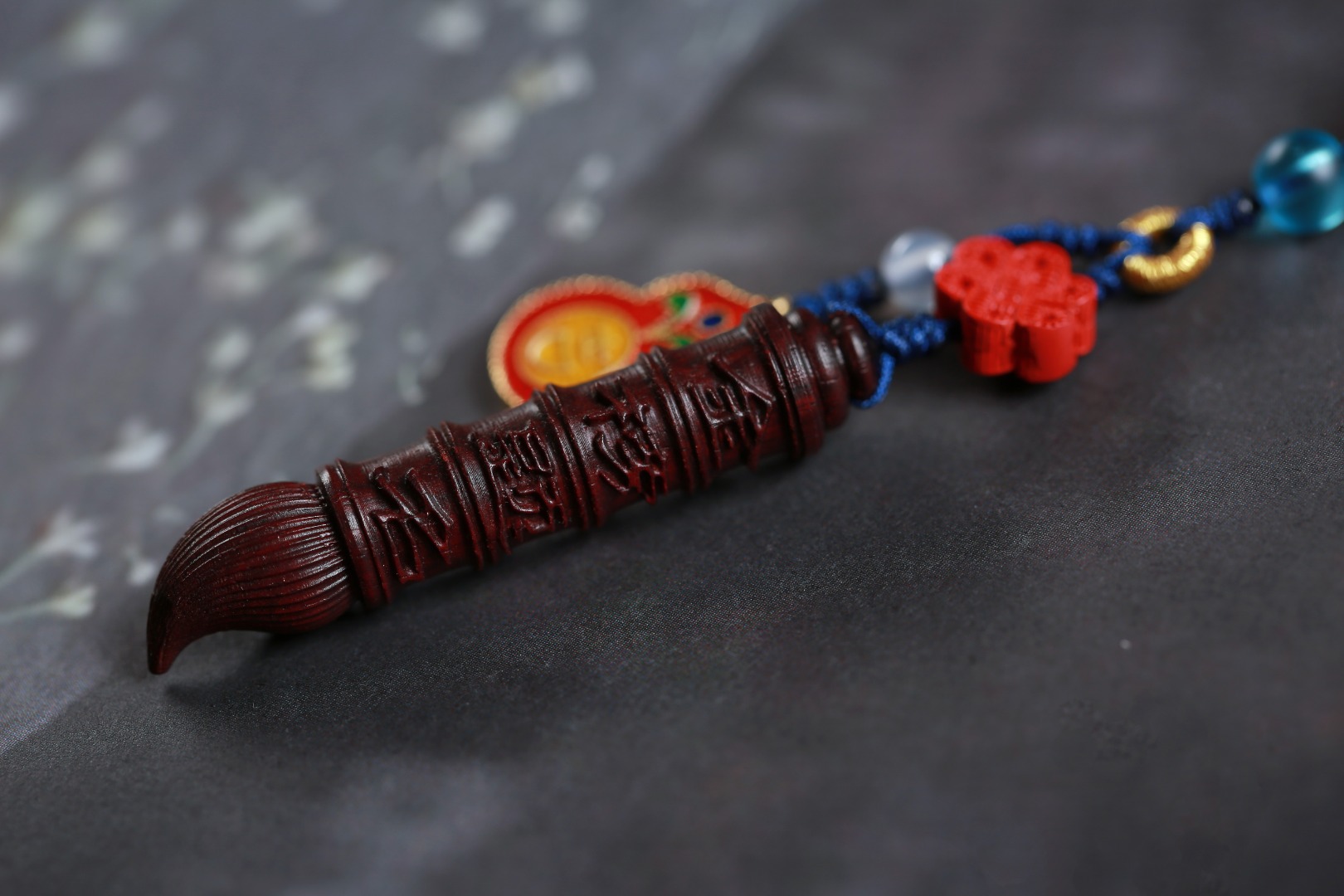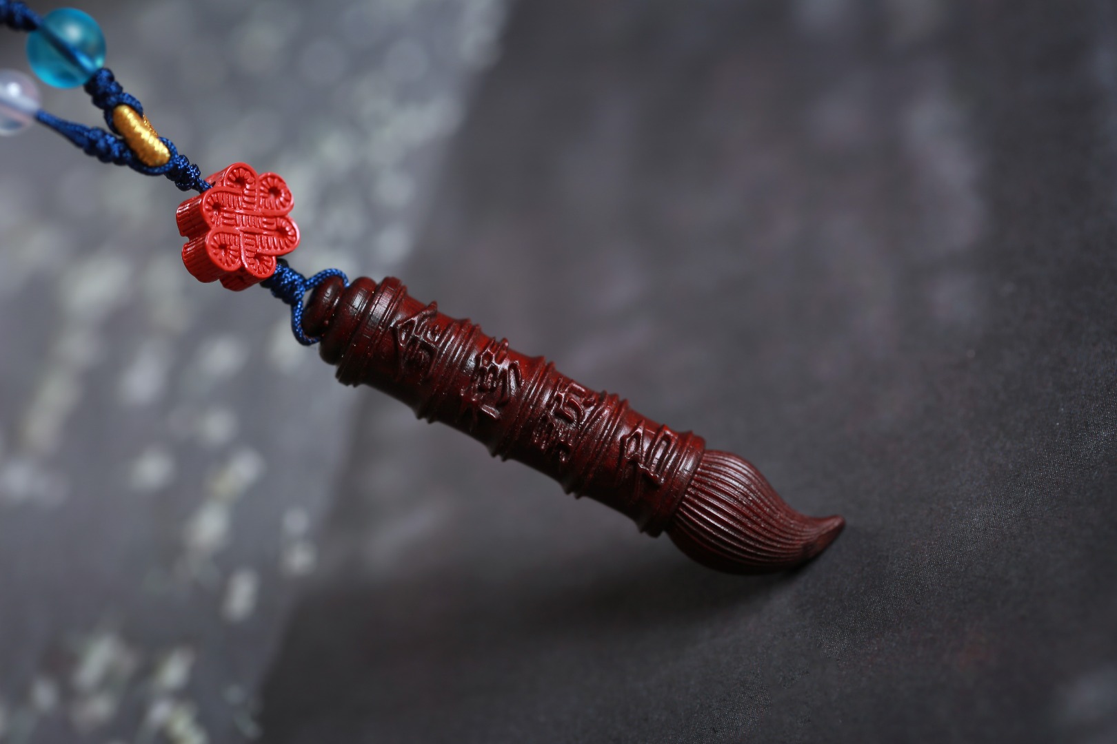 【设计理念】参照传统文昌题材制作,选取印度小叶紫檀为材,结合文昌笔、步步高升符、中国结、葫芦等元素进行设计。紫檀文昌笔,精巧雕刻,质感细腻,化煞转运,寄寓文昌助运、事业有成;红玛瑙“步步高升”符珠,图案清晰,象征官运亨通、步步高升;同时,搭配象征福禄吉祥的风水化煞葫芦、象征富贵不断的朱砂条纹中国结、以及白玛瑙、金线、琉璃、象牙果等配饰,整体手工制作,虔诚造物,吉祥美观,高雅大方。
