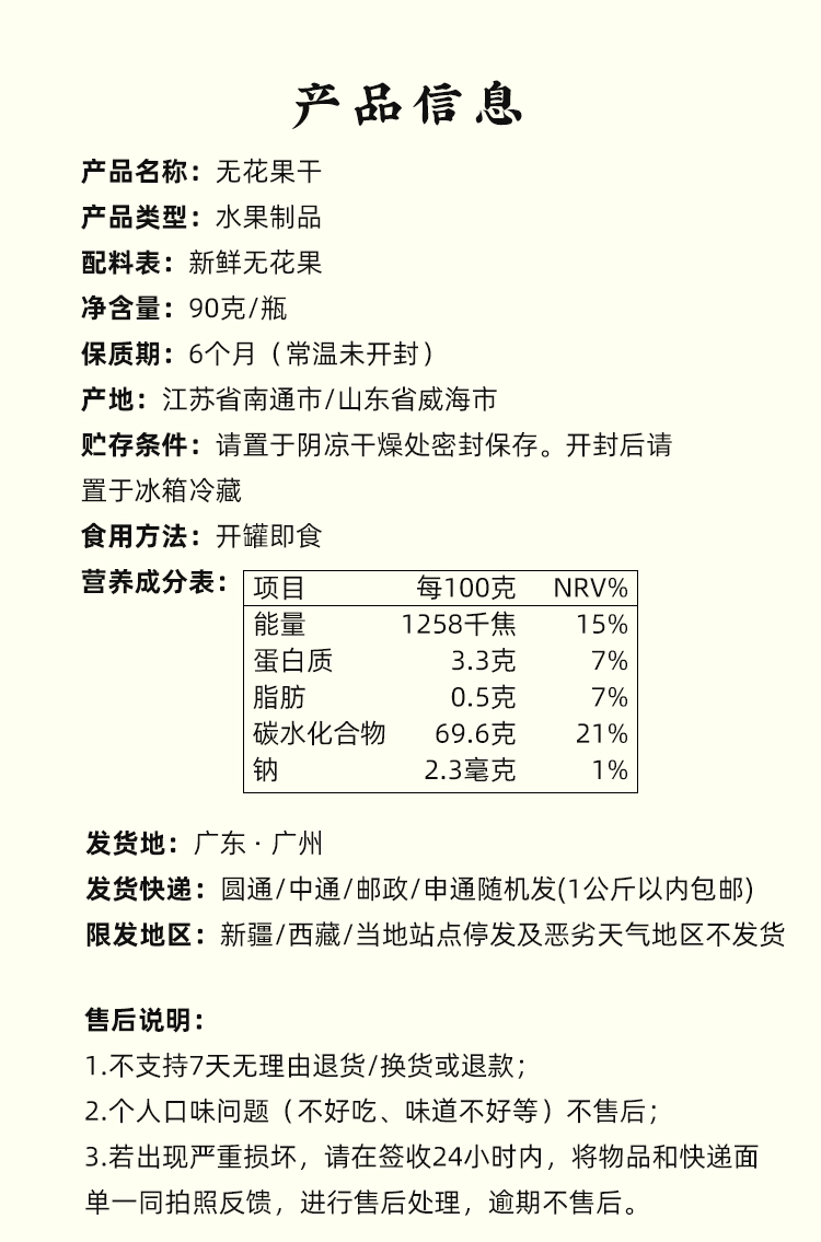 1、当季鲜果制作,没有用其他配料干预口感。每个品种,每个批次,甜度、口感或会有一些小区别。