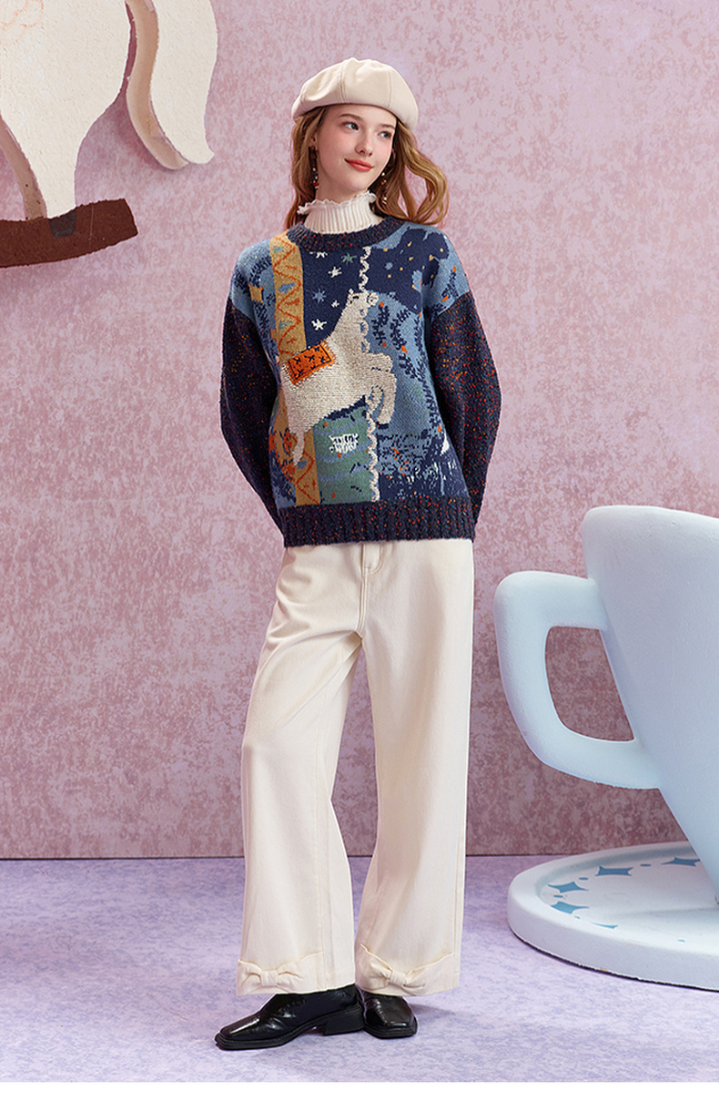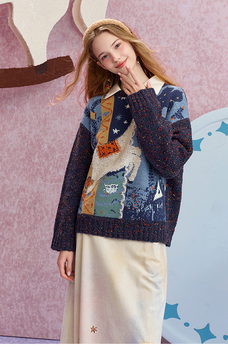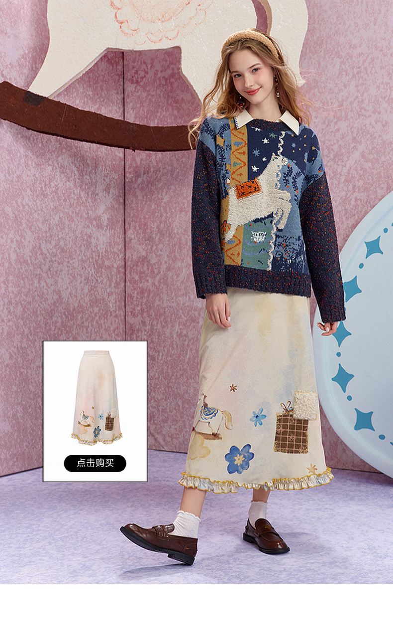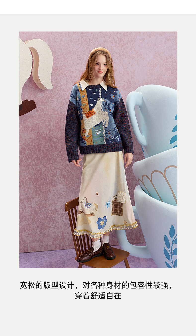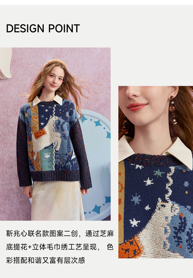 两三事 糖衣星系 2025秋季新款趣味动物立体绣花套头毛衣女宽松