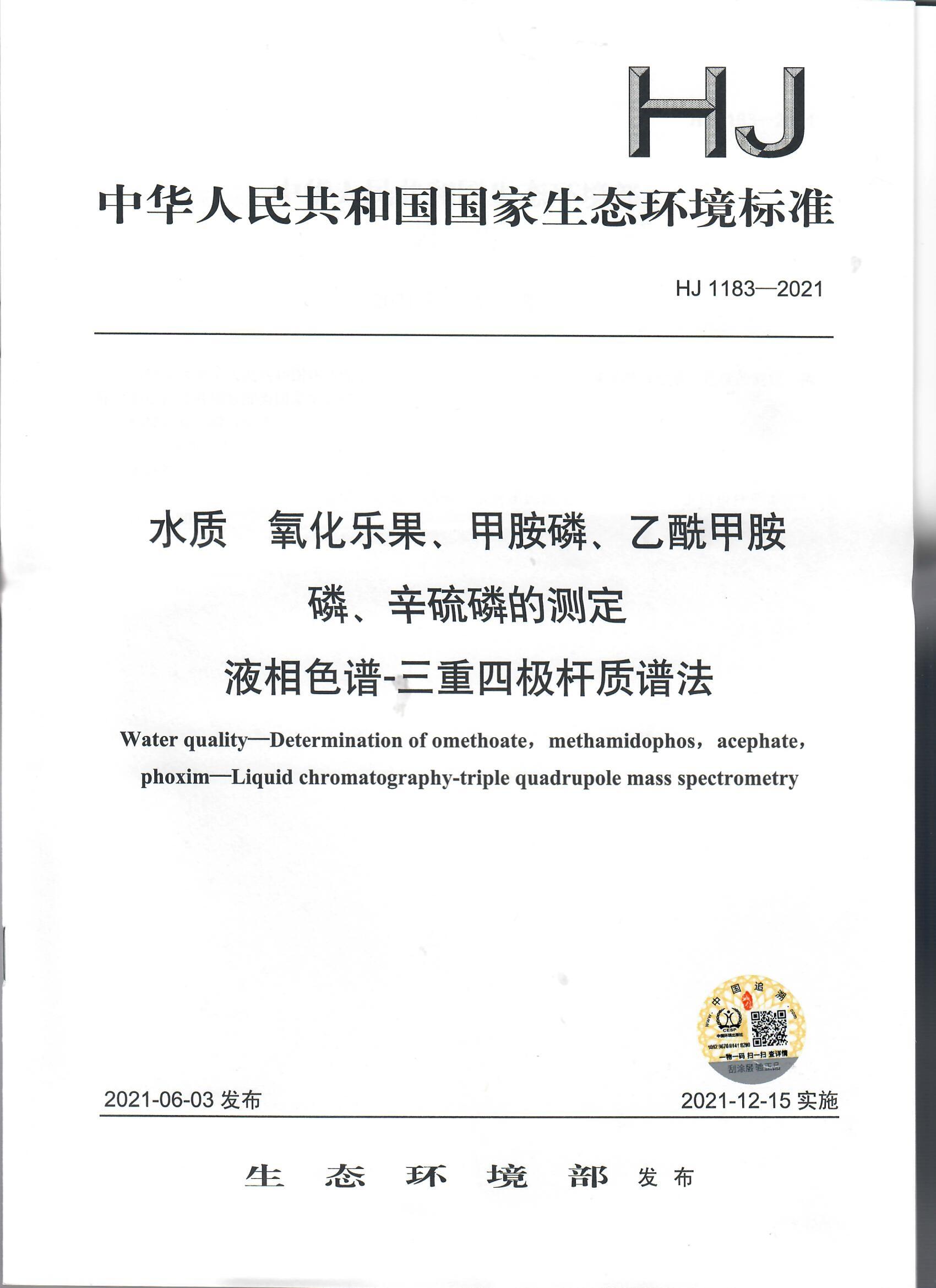HJ 1183-2021 水质 氧化乐果、甲胺磷、乙酰甲胺 磷、辛硫磷的测定 液相色谱-三重四极杆质谱法