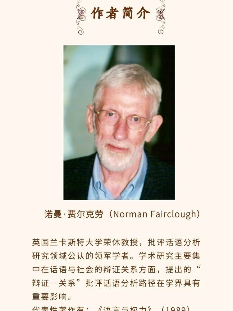 诺曼·费尔克劳,英国兰卡斯特大学荣休教授,批评话语分析研究领域公认的领军学者;学术研究主要集中在话语与社会的辩证关系方面,提出的“辩证一关系”批评话语分析路径在学界具有重要影响;代表性著作有《语言与权力》(1989),《话语与社会变迁》(1992)、《后现代生活中的话语》(1999,与L.Chouliaraki合著)、《话语分析》(2003)、《语言与全球化》(2006)、《批评话语分析》(2010,第2版)、《政治话语分析》(2012,与I.Fairclough合著)。