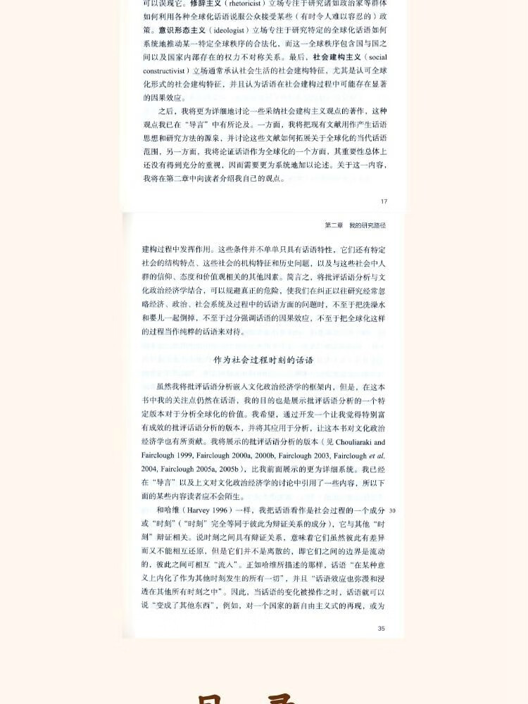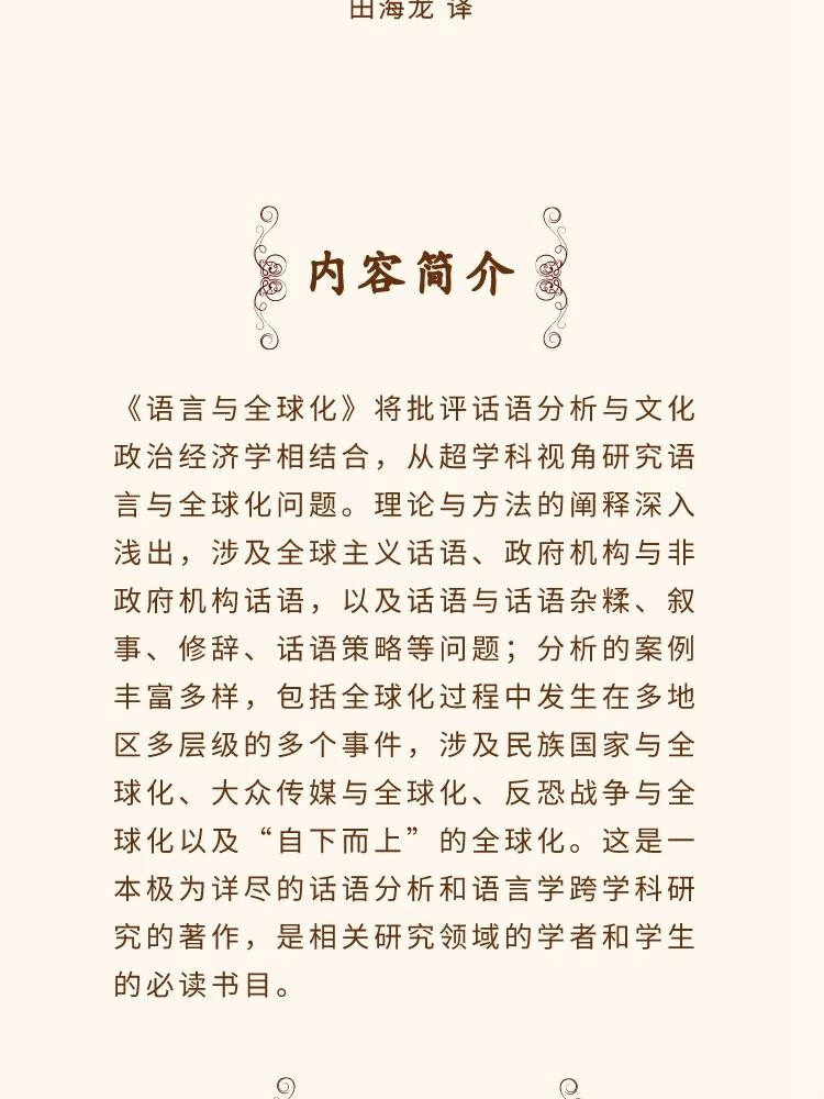 本书将批评话语分析与文化政治经济学相结合,从超学科视角研究语言与全球化问题。理论与方法的阐释深入浅出,涉及全球主义话语、政府机构与非政府机构话语,以及话语与话语杂糅、叙事、修辞、话语策略等问题;分析的案例丰富多样,包括全球化过程中发生在多地区多层级的多个事件,涉及民族国家与全球化、大众传媒与全球化、反恐战争与全球化以及“自下而上”的全球化。这是一本极为详尽的话语分析和语言学跨学科研究的著作,是相关研究领域的学者和学生的书目。