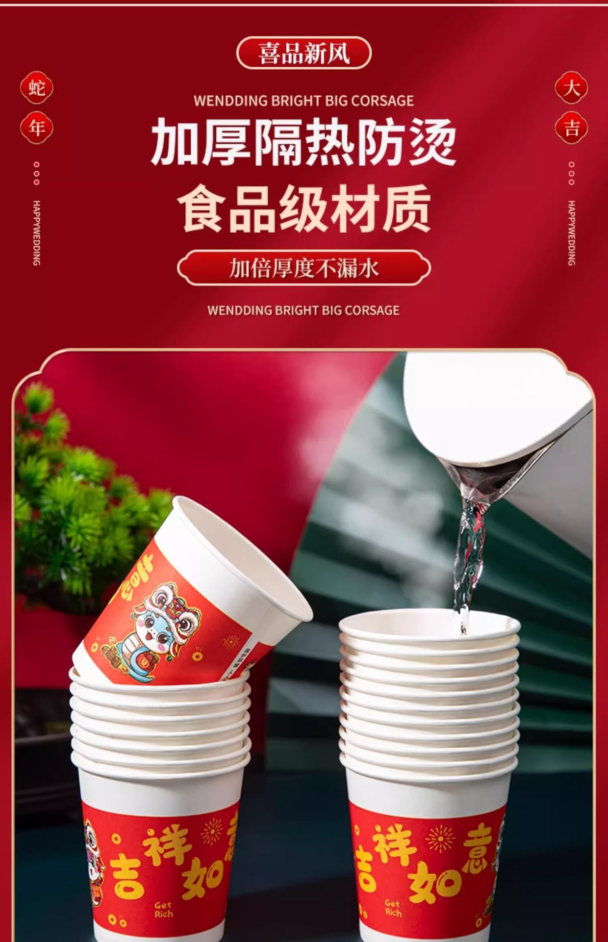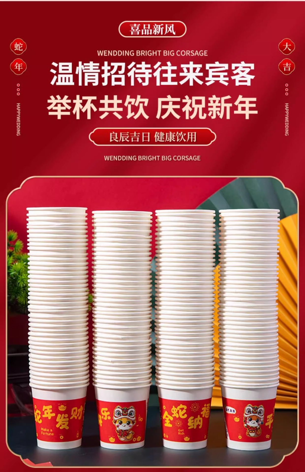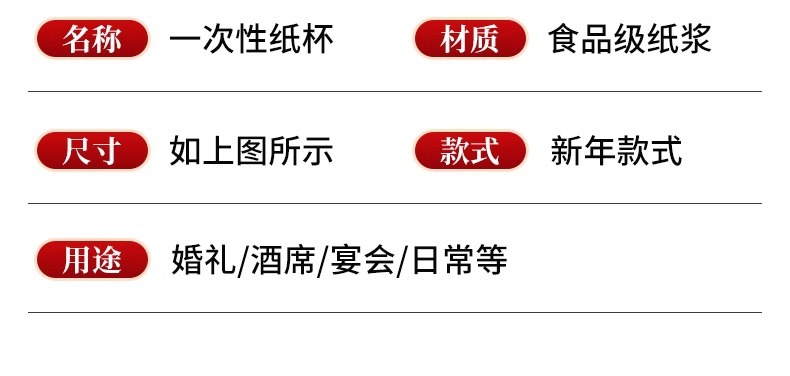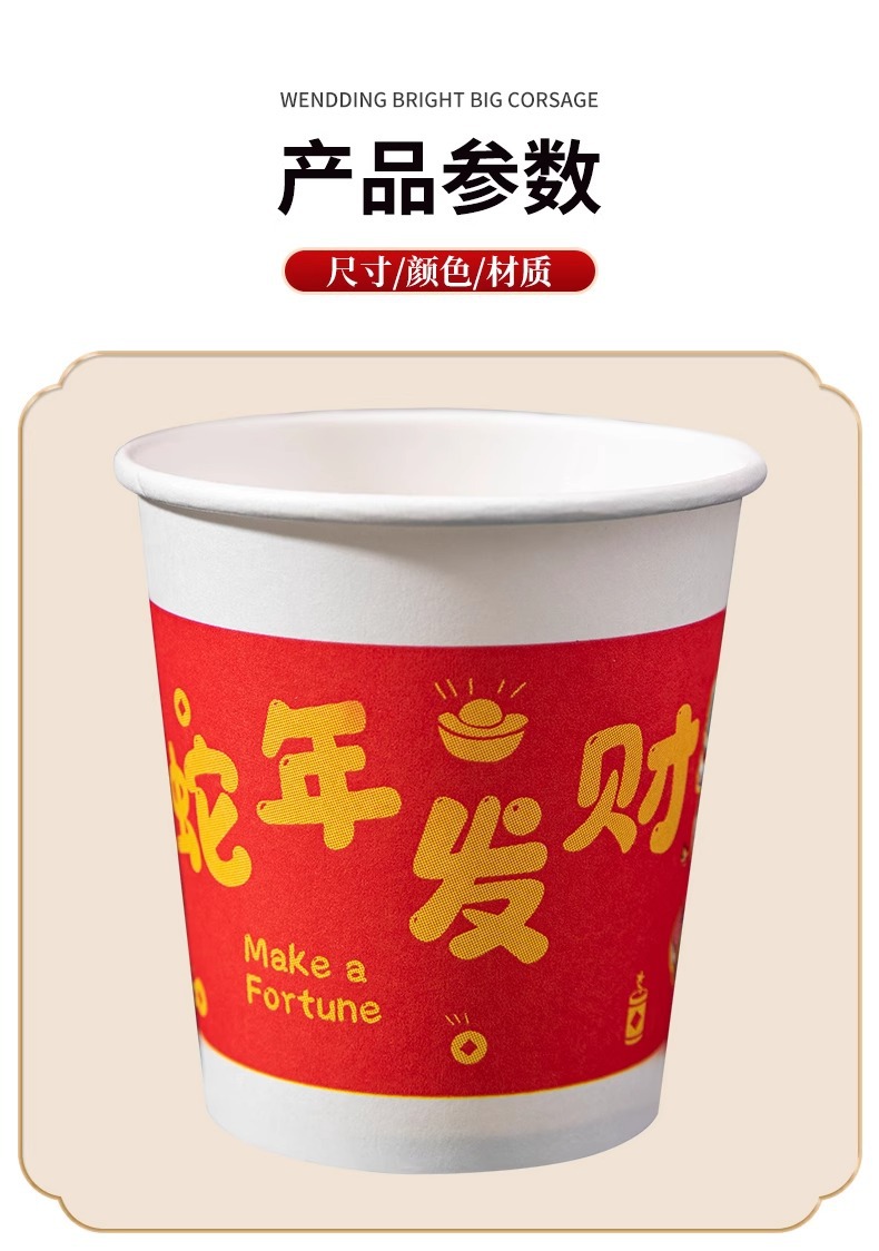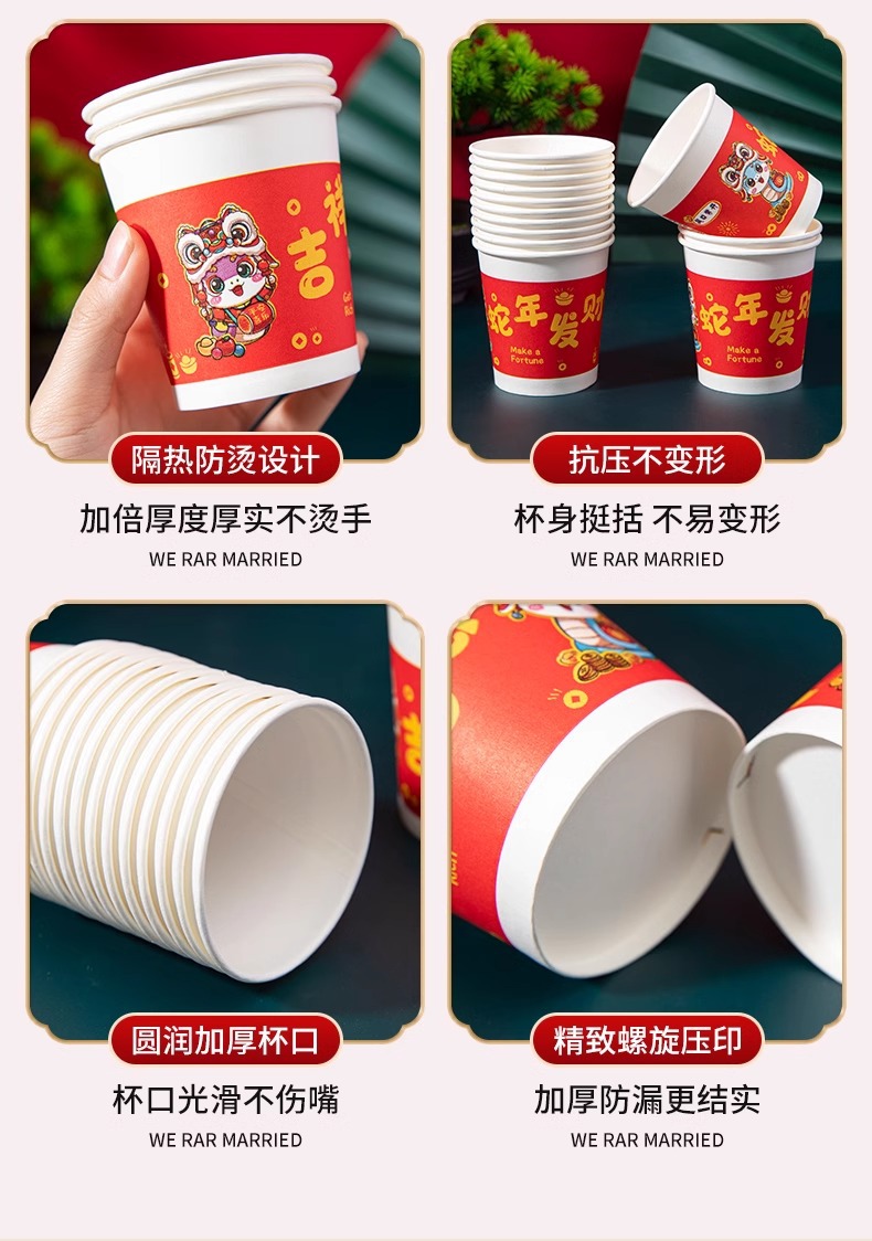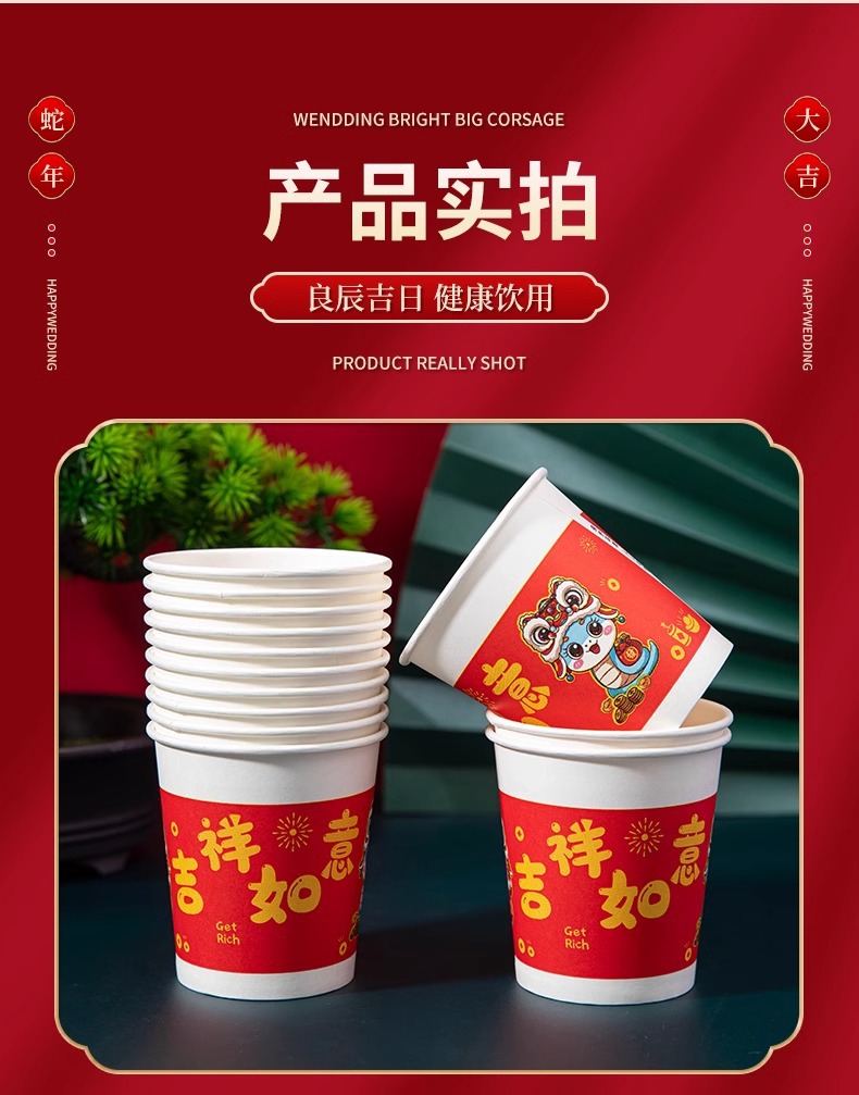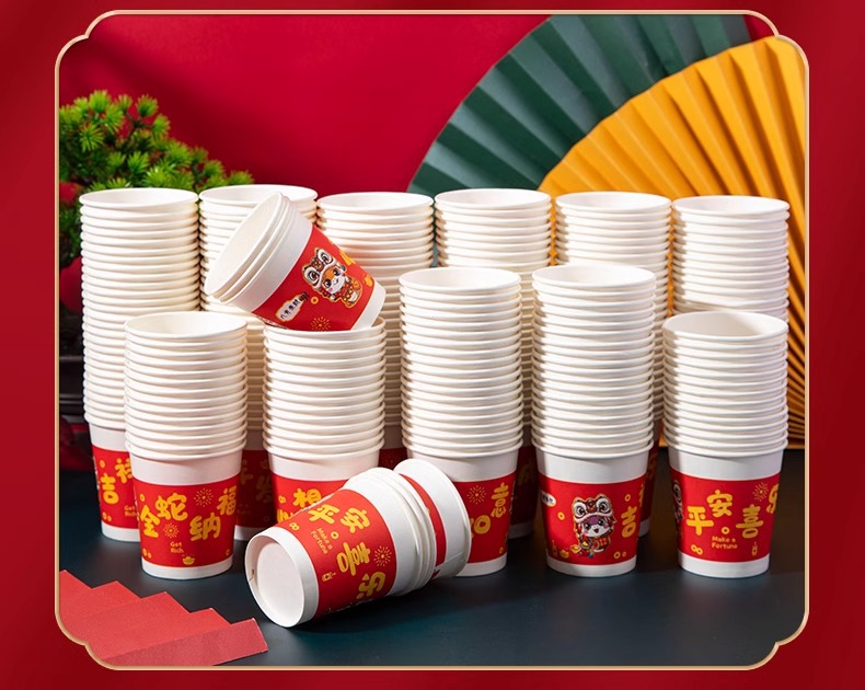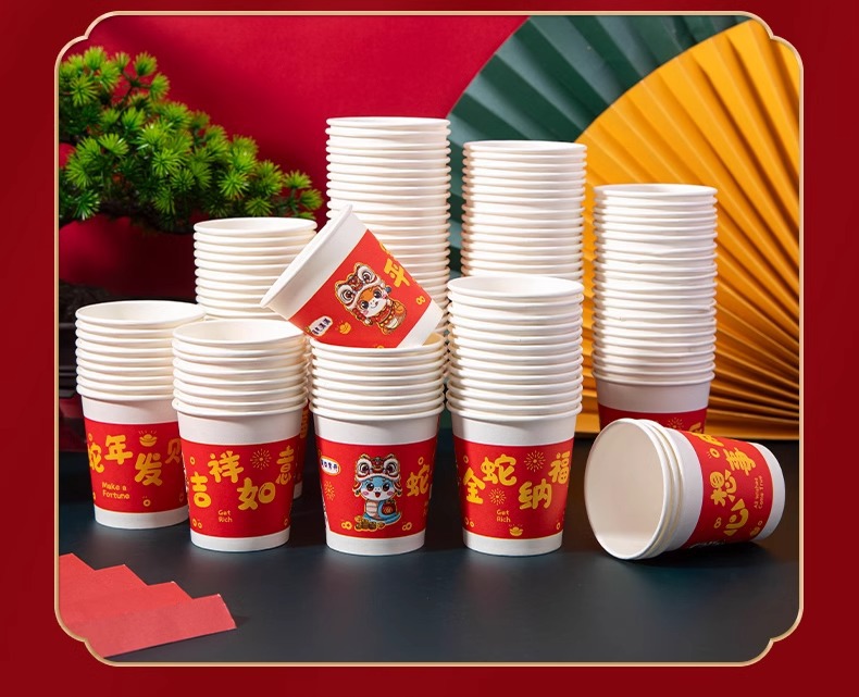 「9.9到手100只!2025蛇年纸杯」新年一次性杯子加厚居家日用茶水杯红色喜庆整箱过年家庭年货餐饮用具