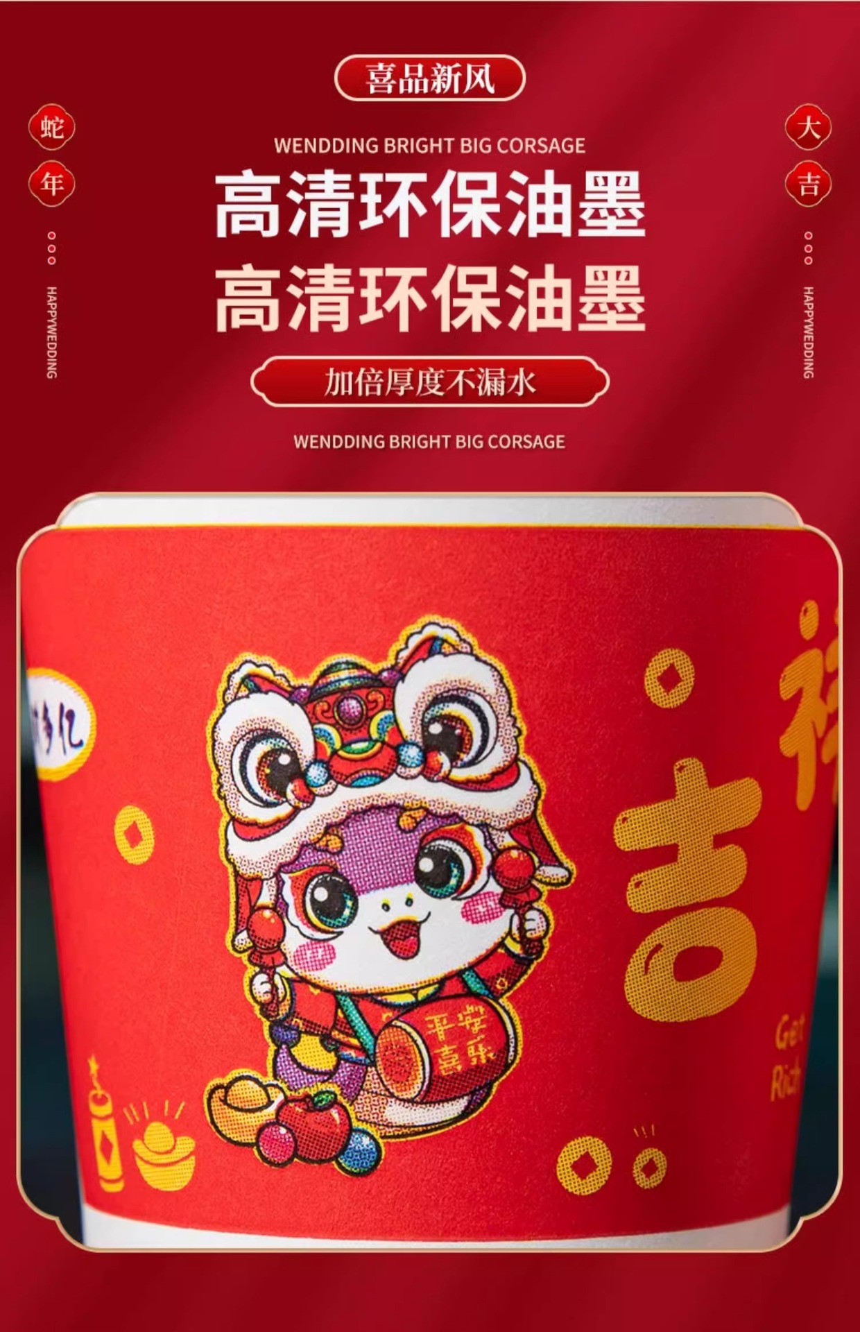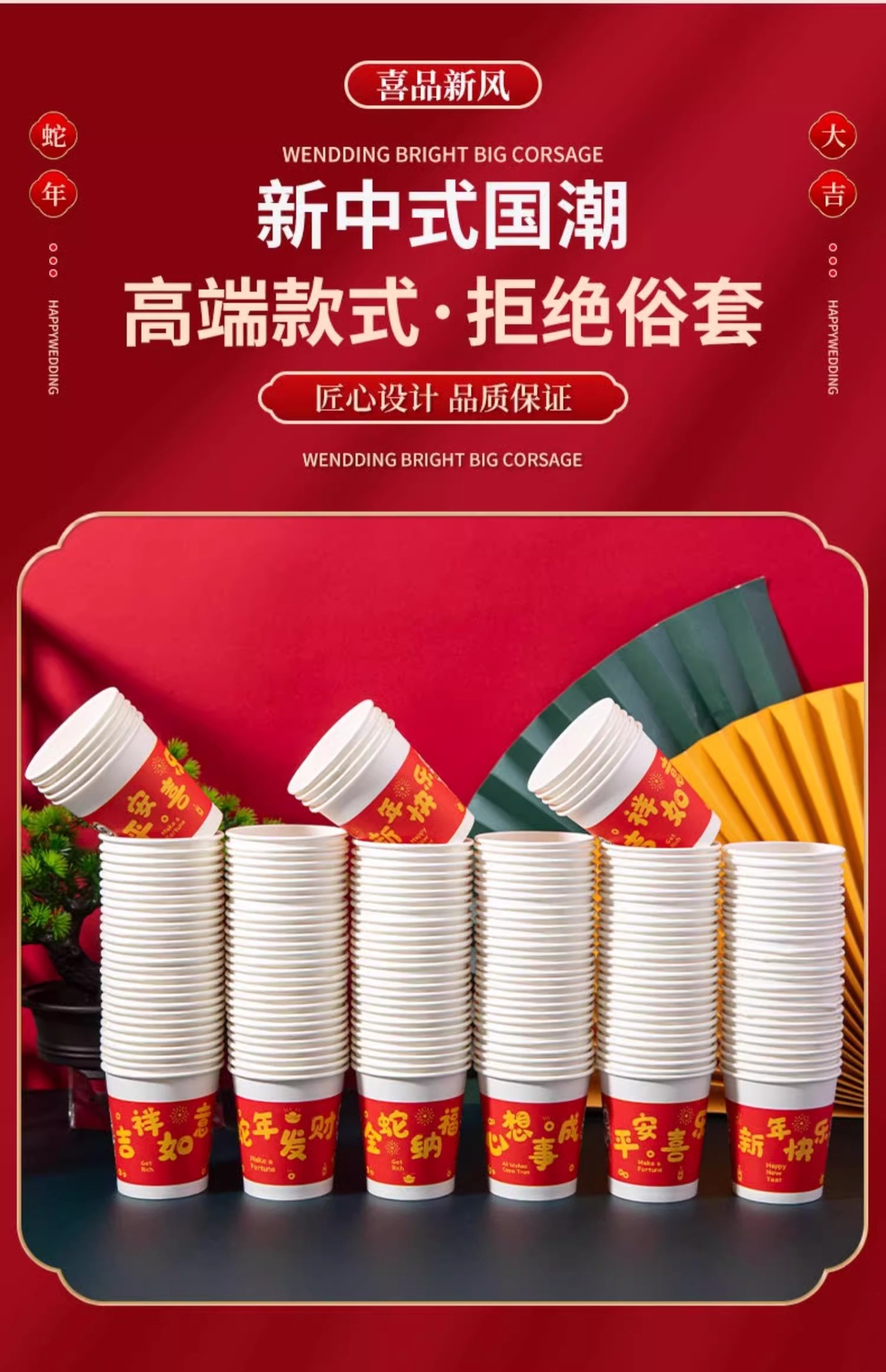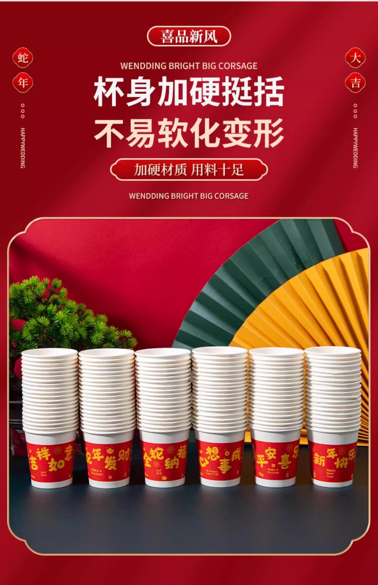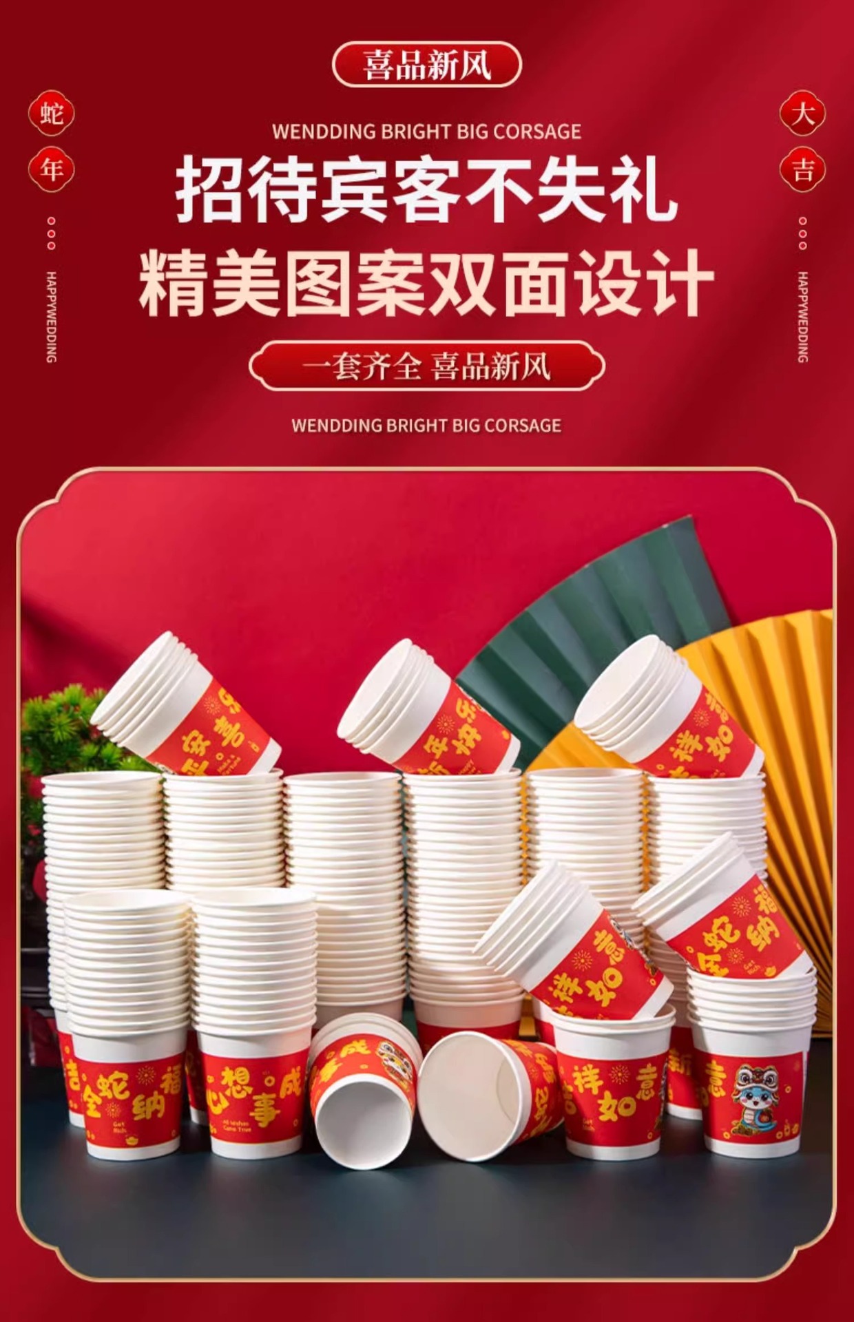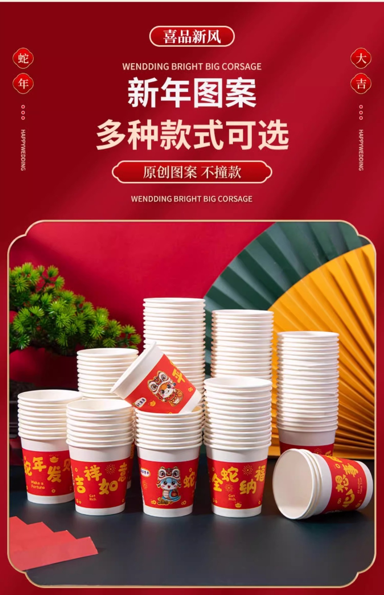 「9.9到手100只!2025蛇年纸杯」新年一次性杯子加厚居家日用茶水杯红色喜庆整箱过年家庭年货餐饮用具