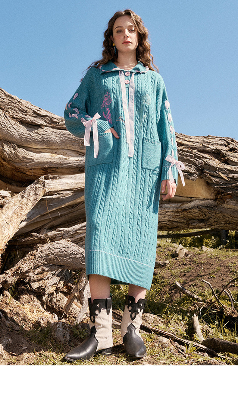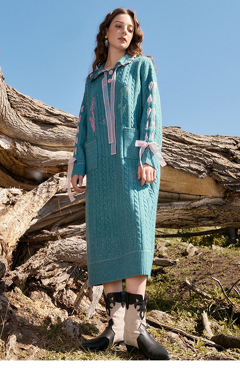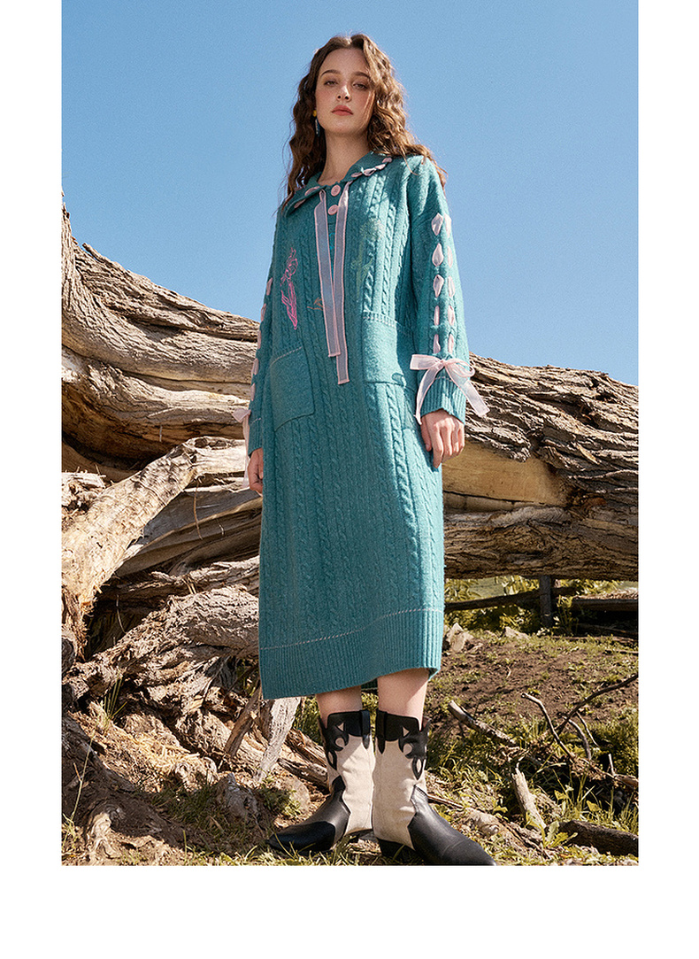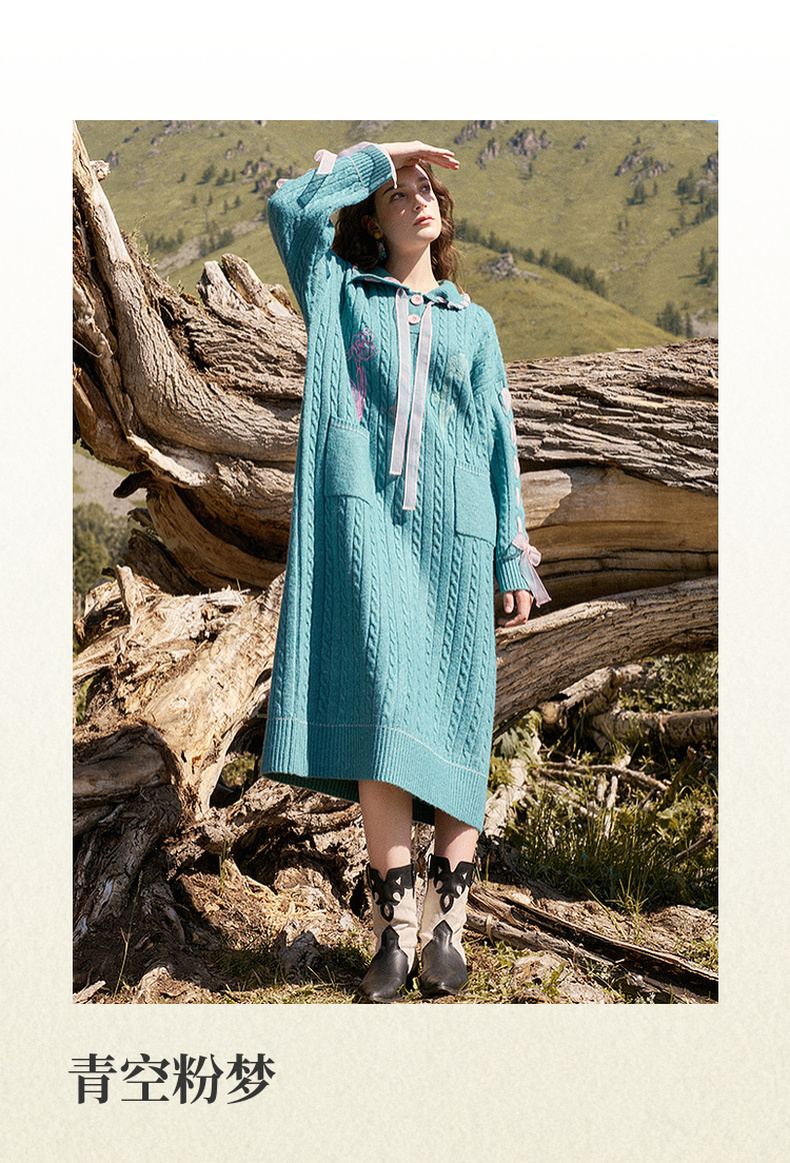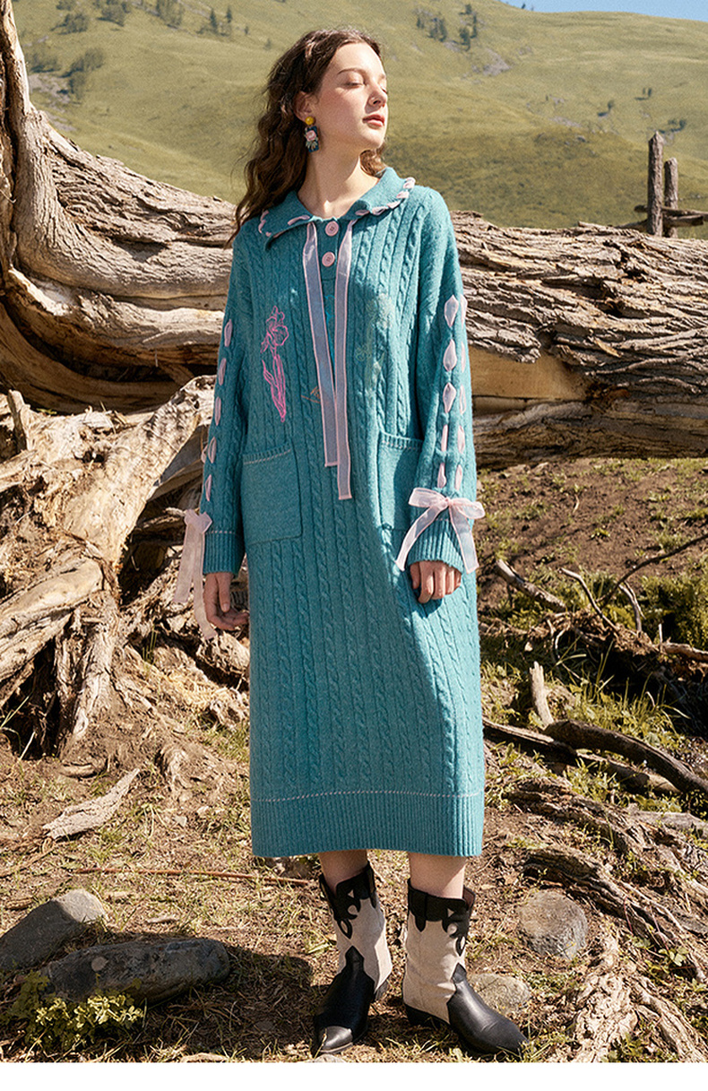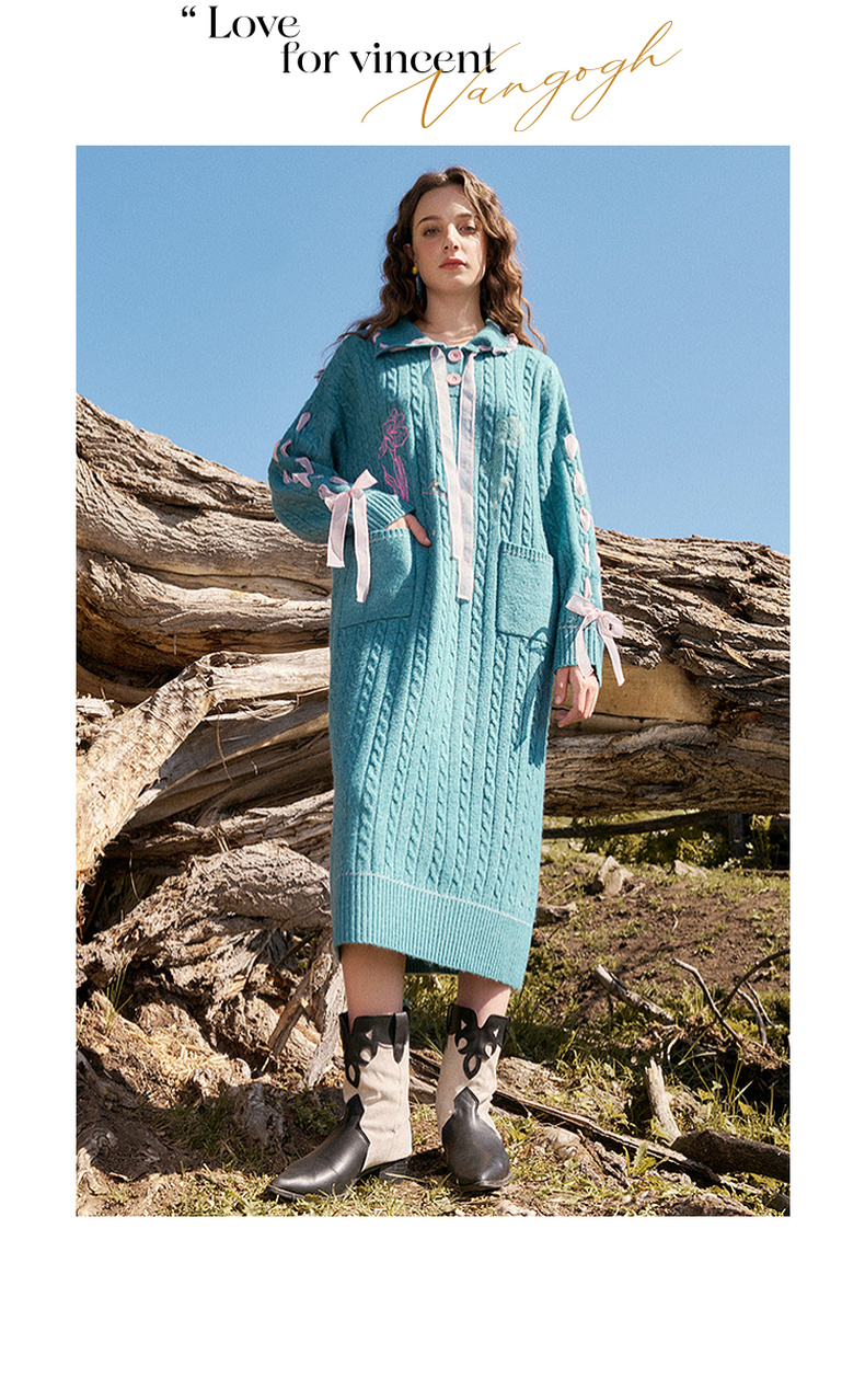 两三事梵高文艺青空粉梦2024秋新款甜美绣花丝带绑带毛衣裙连衣裙
