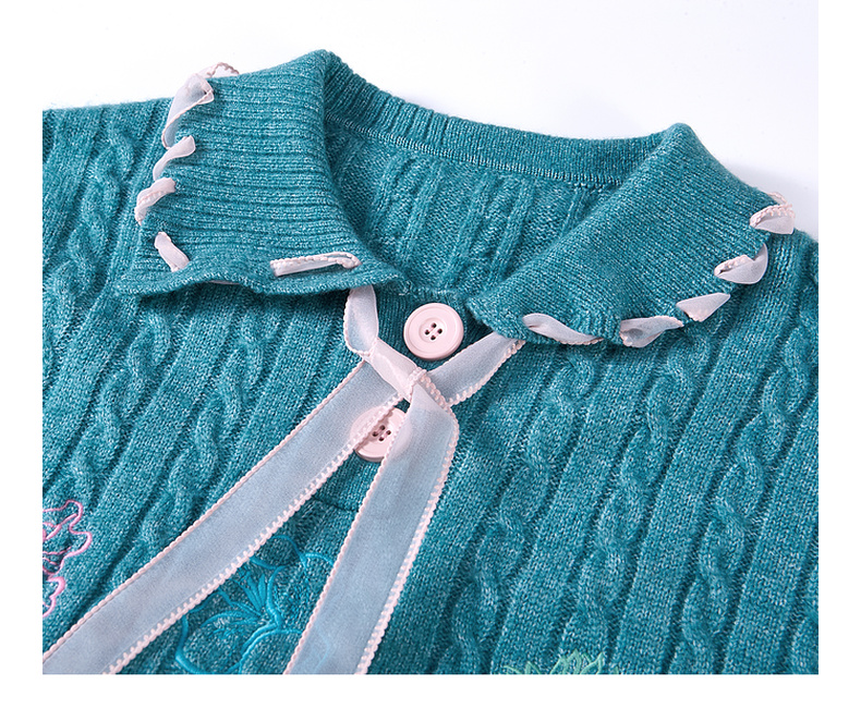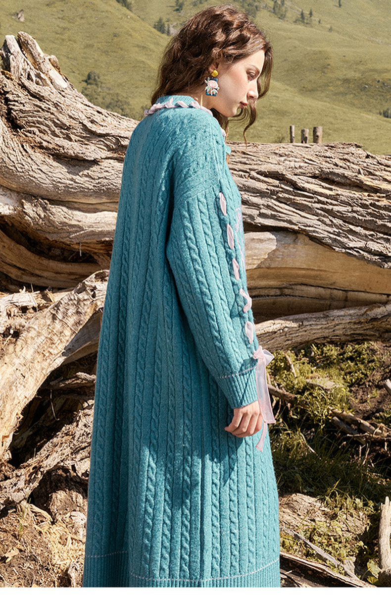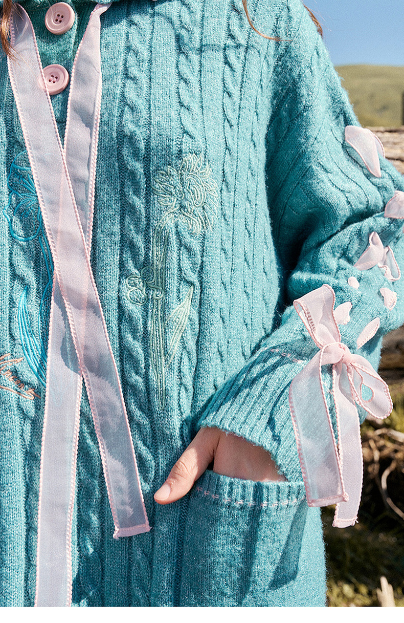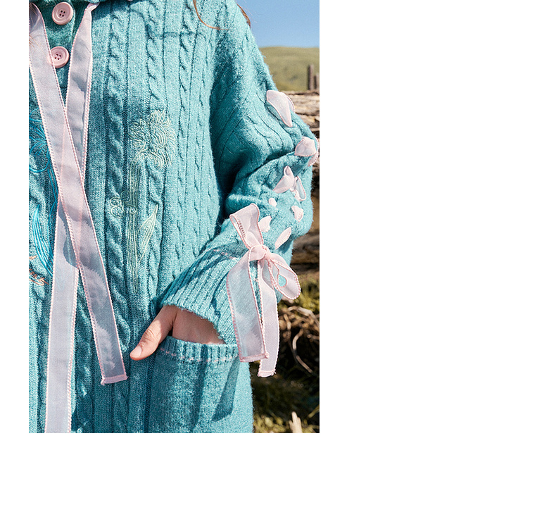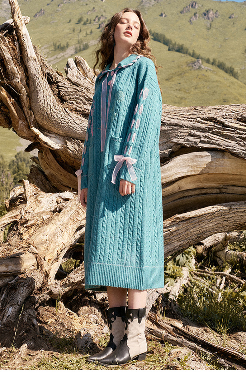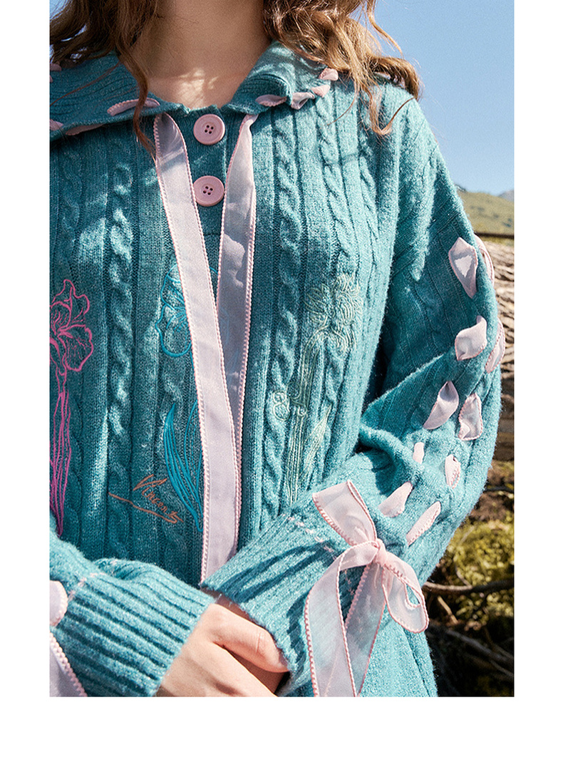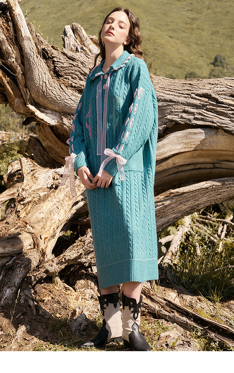 两三事梵高文艺青空粉梦2024秋新款甜美绣花丝带绑带毛衣裙连衣裙