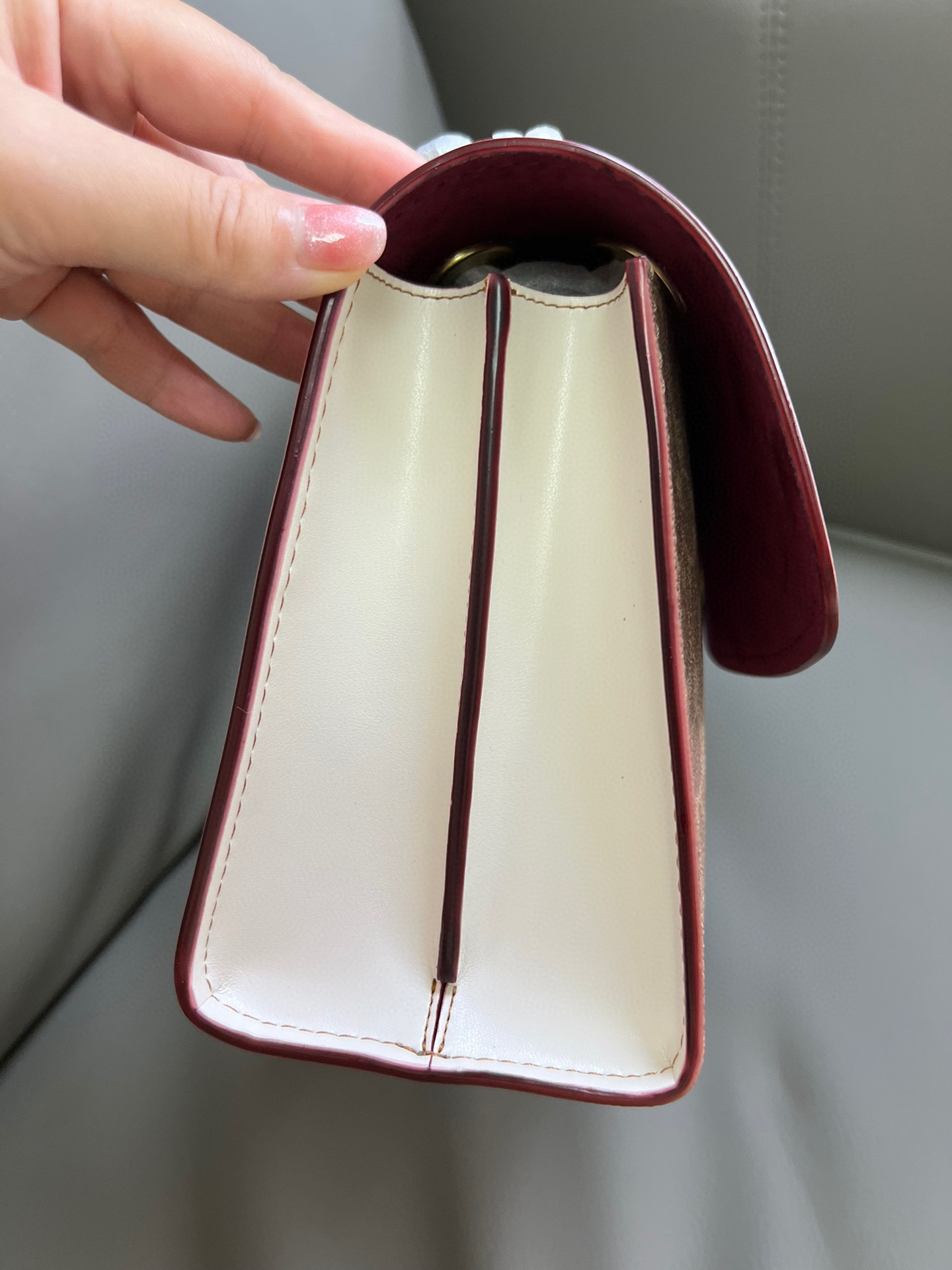 采用原厂进口牛皮拼Pvc,原厂复古五金 ,反毛皮内里。链条两用,折起来可单肩/手提,松开可以斜挎 ,很实用。