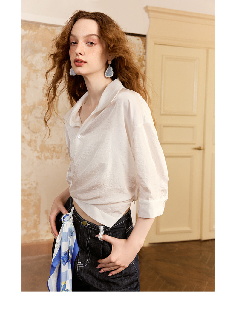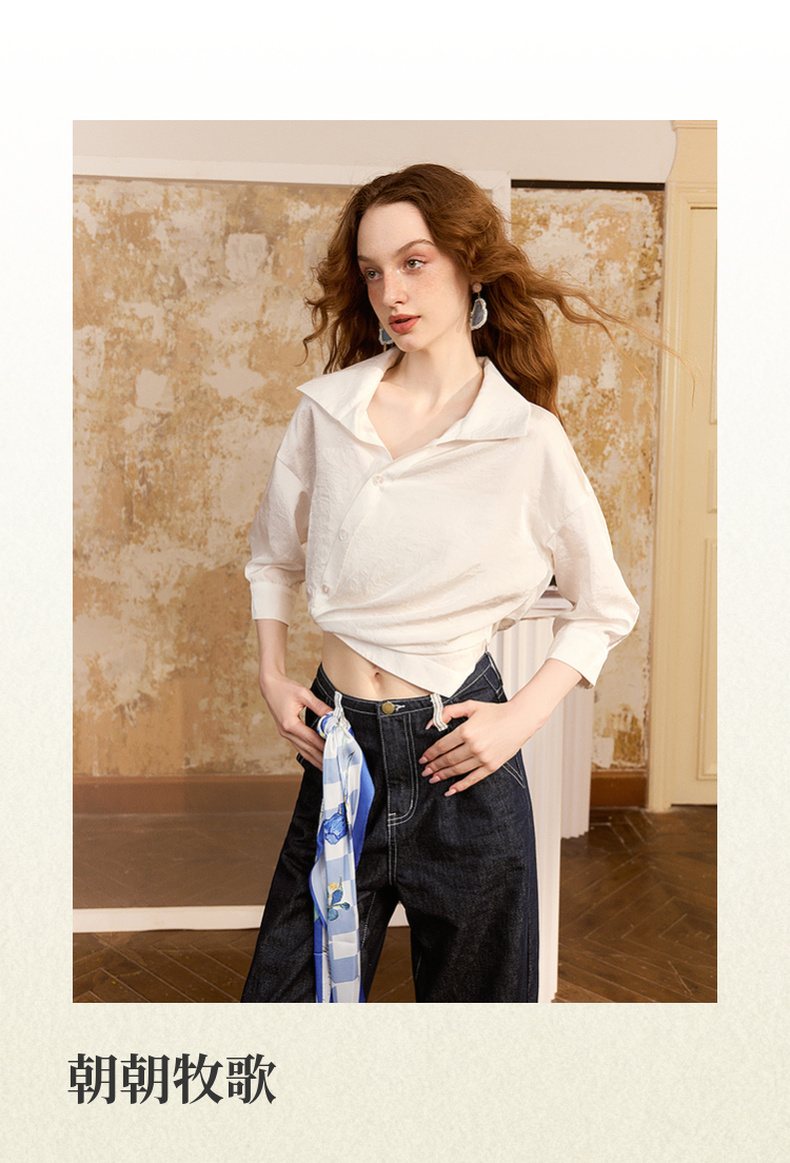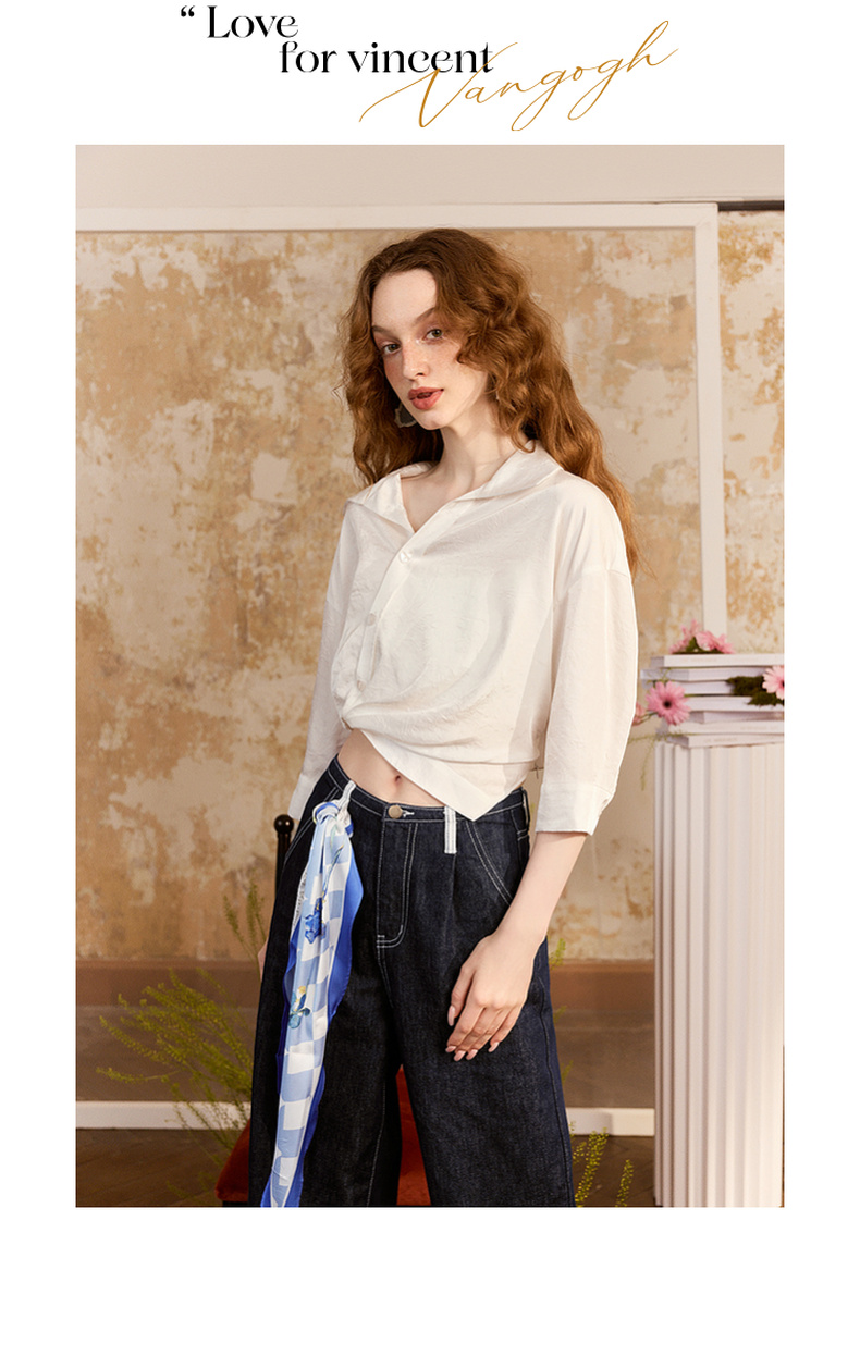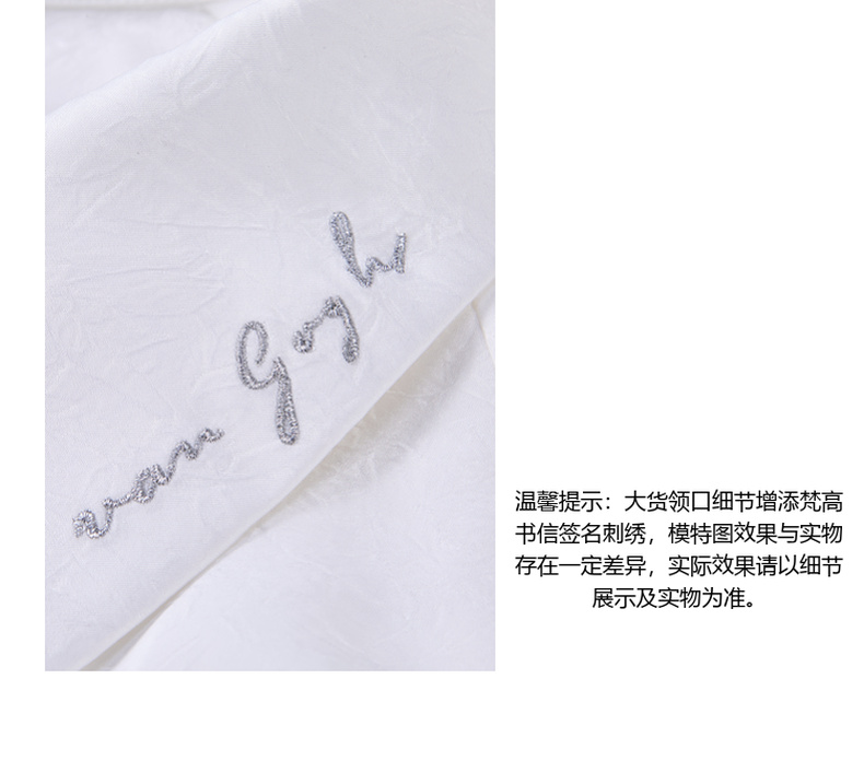 两三事梵高文艺朝朝牧歌2024夏新款简约绣花翻领斜边单排扣衬衫女