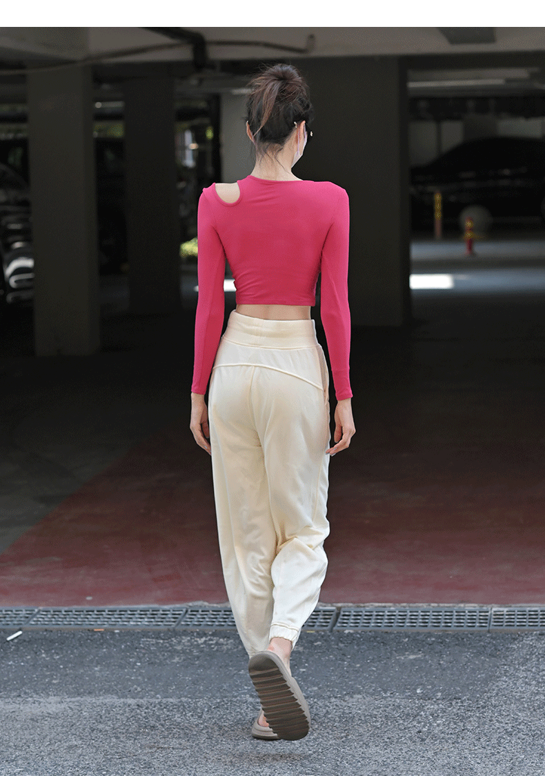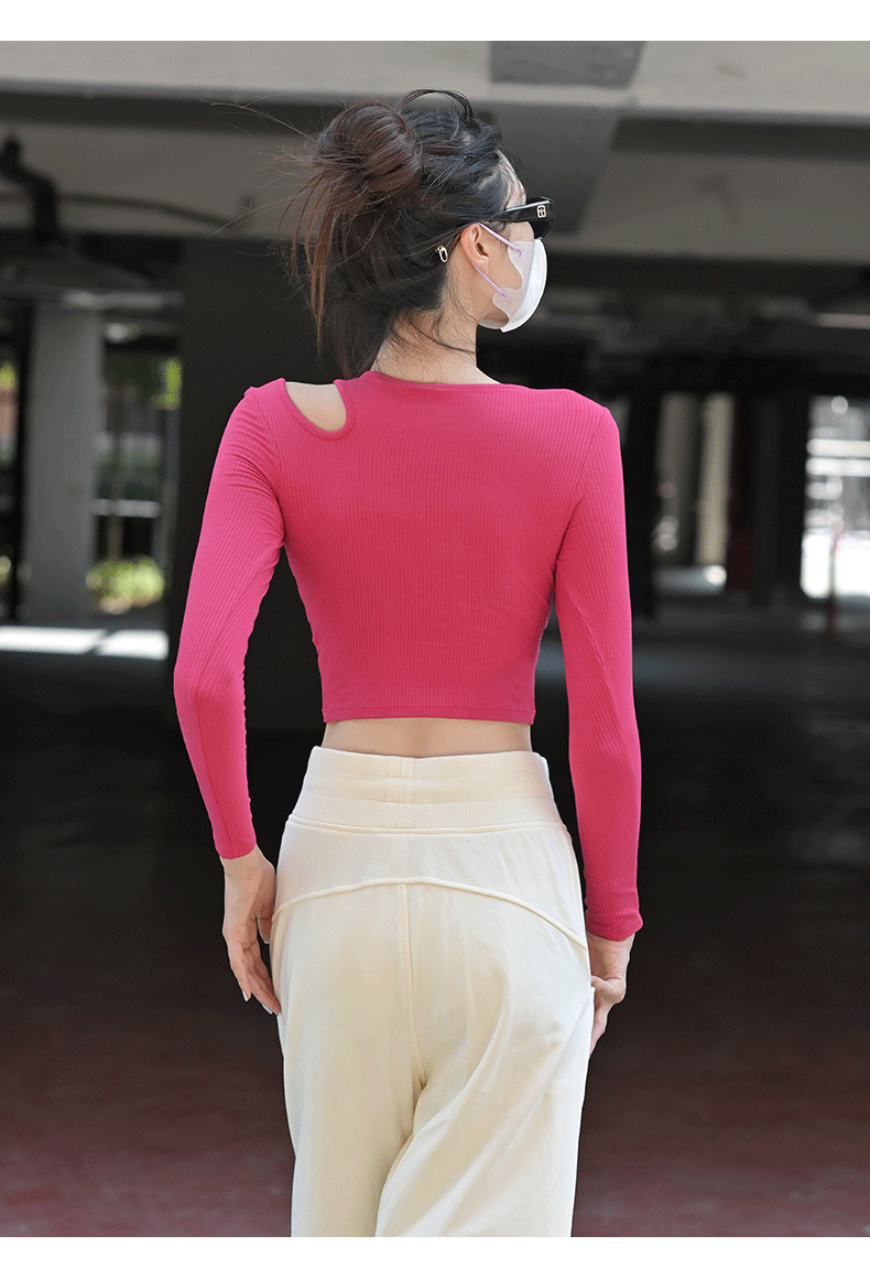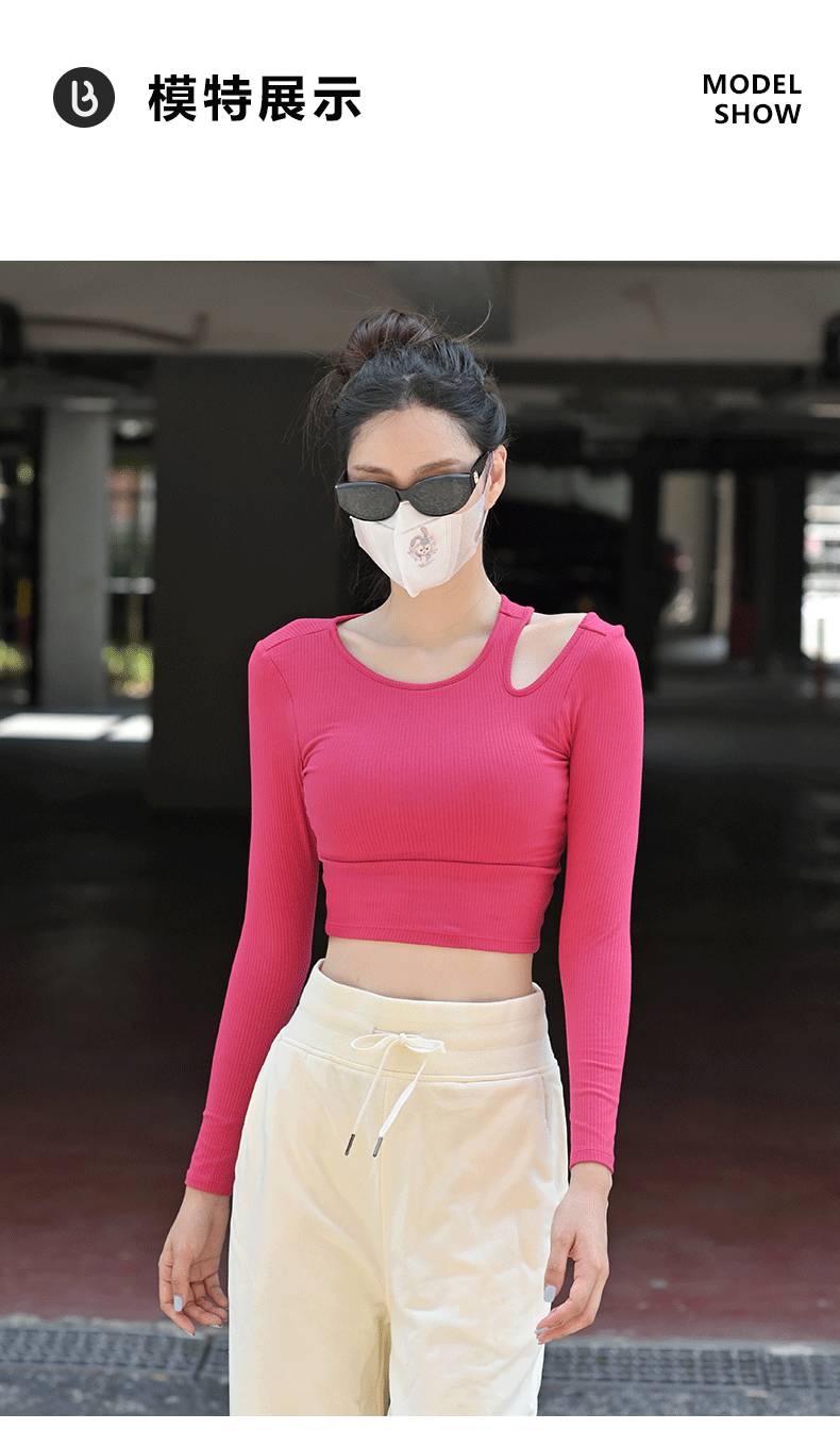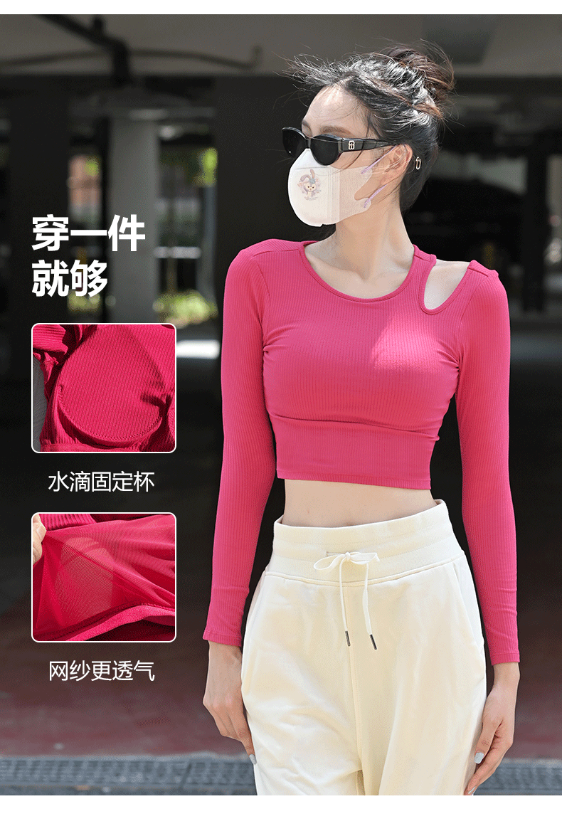Beemen固定杯运动上衣女外穿紧身短款螺纹瑜伽长袖t恤