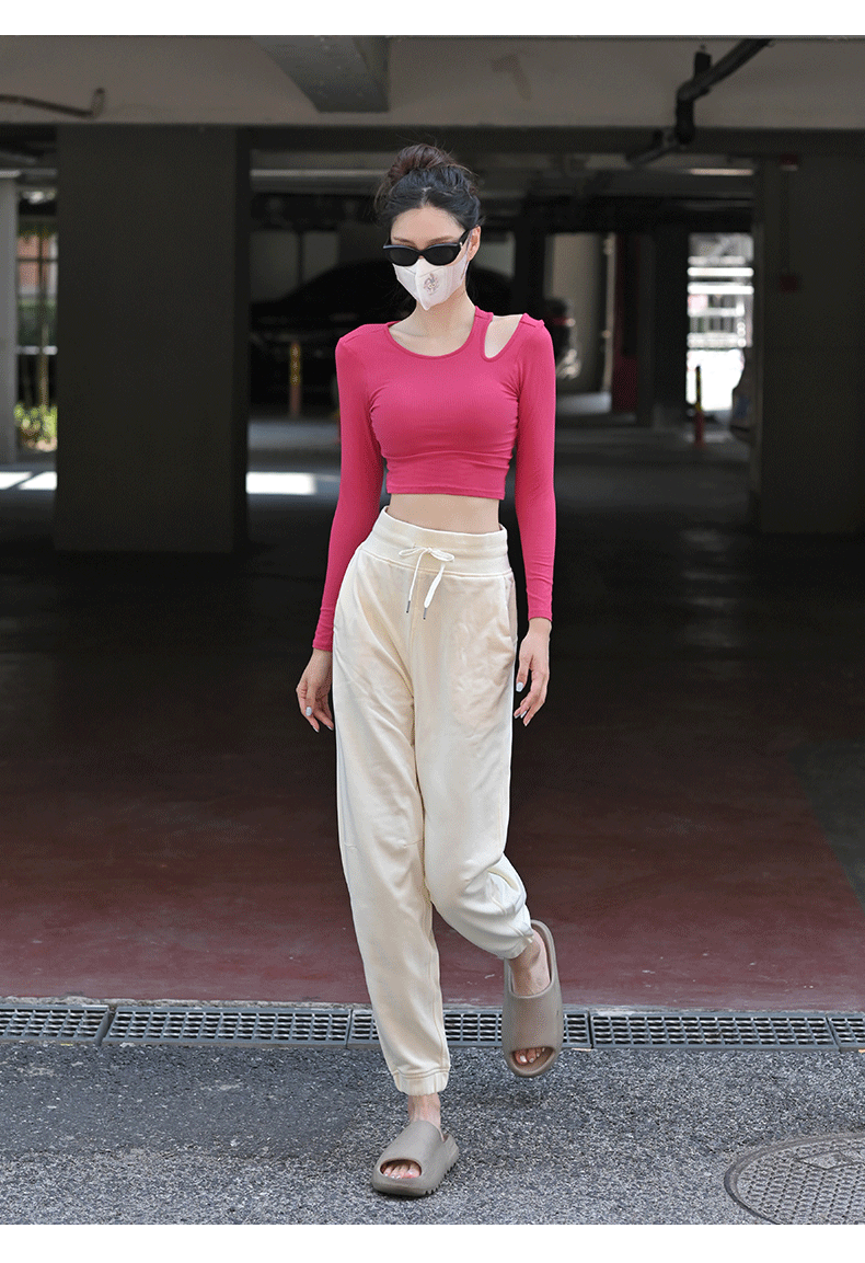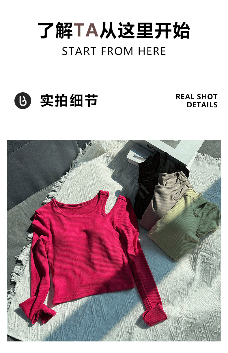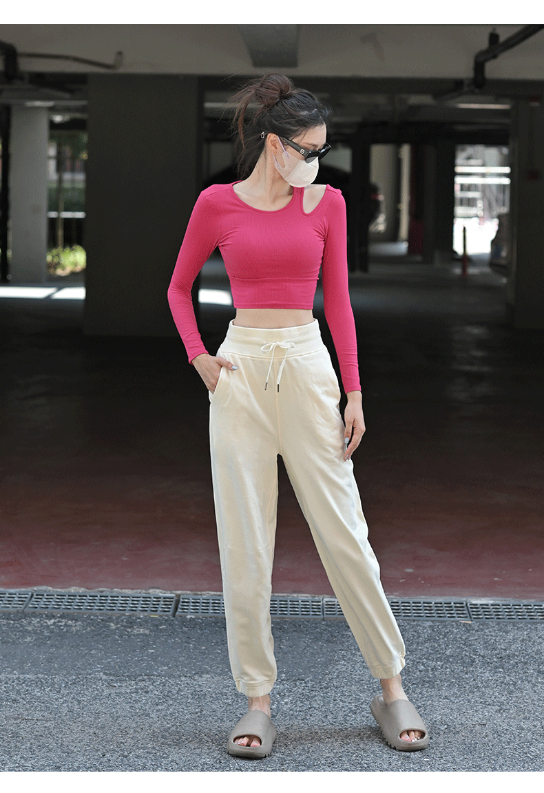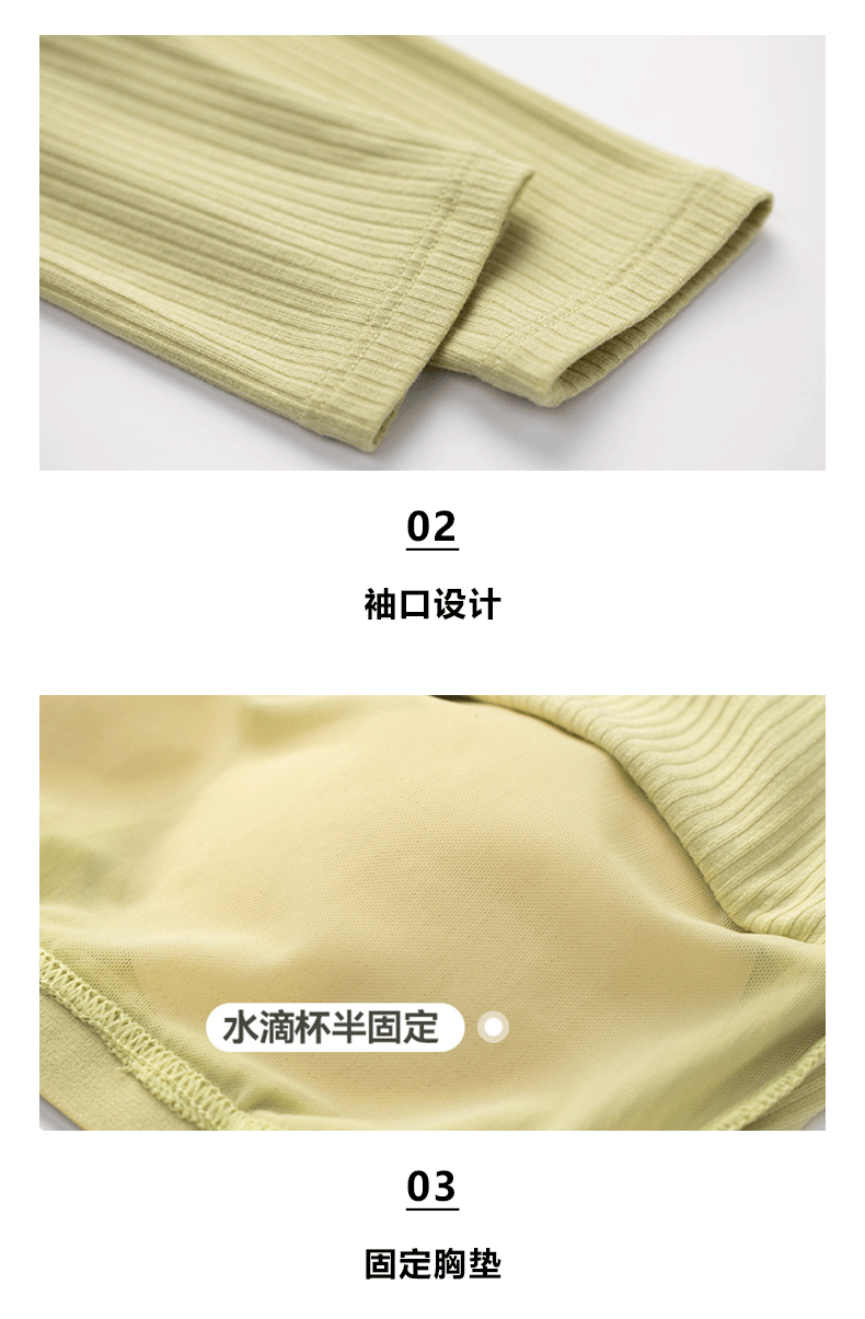 Beemen固定杯运动上衣女外穿紧身短款螺纹瑜伽长袖t恤