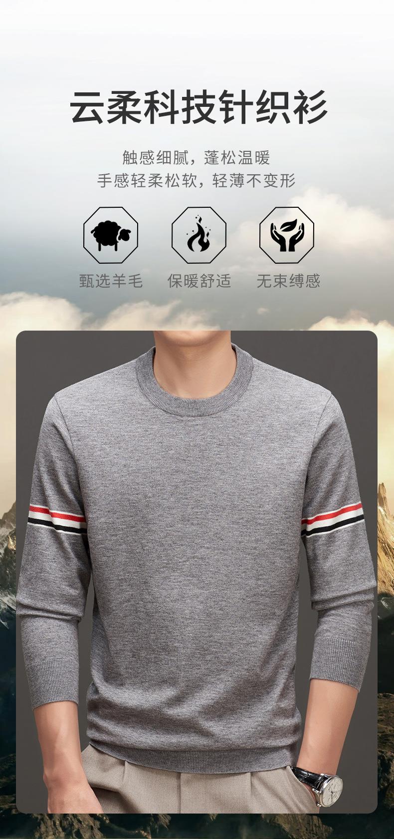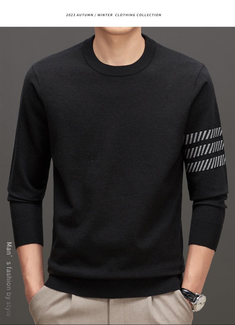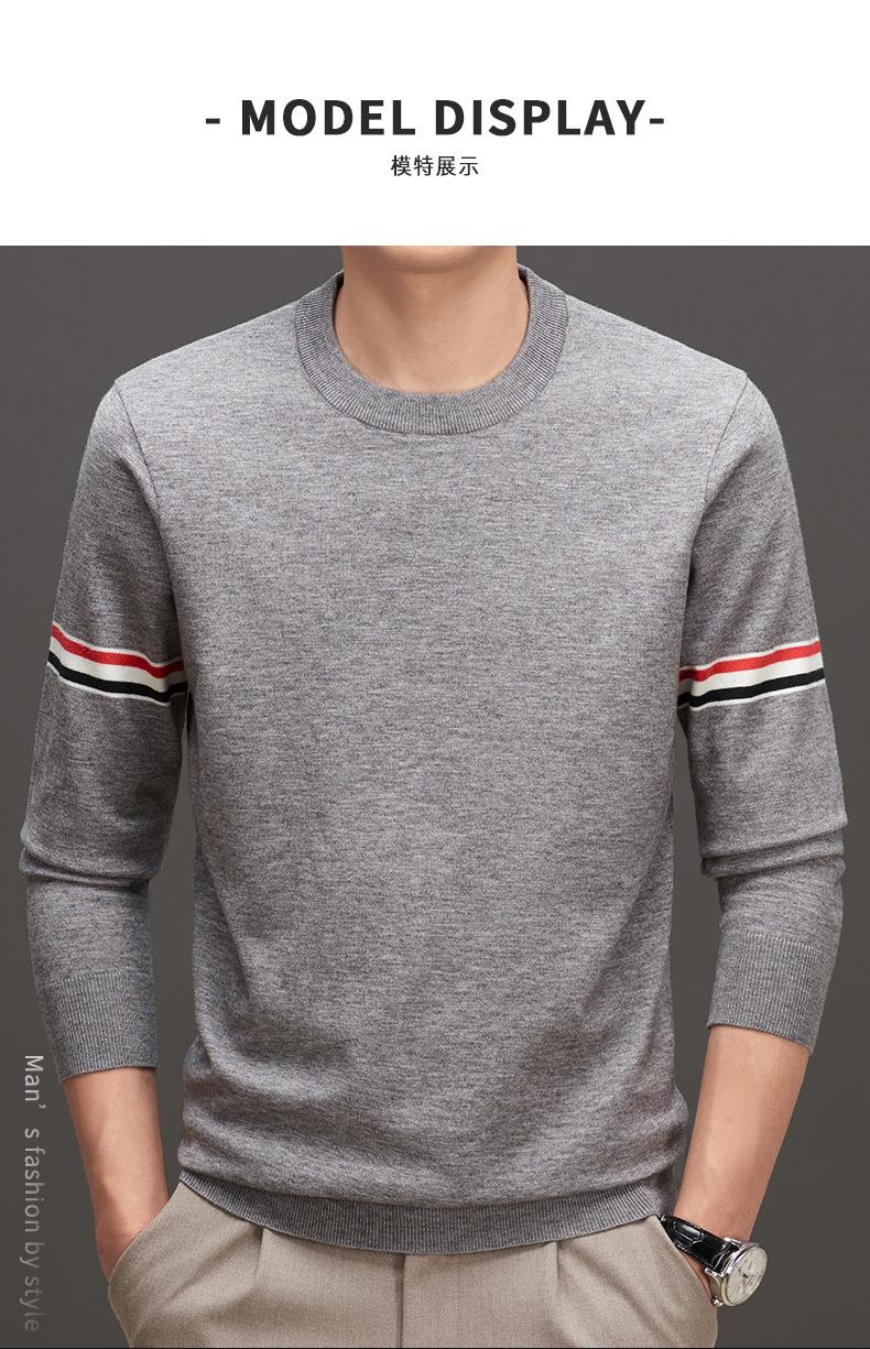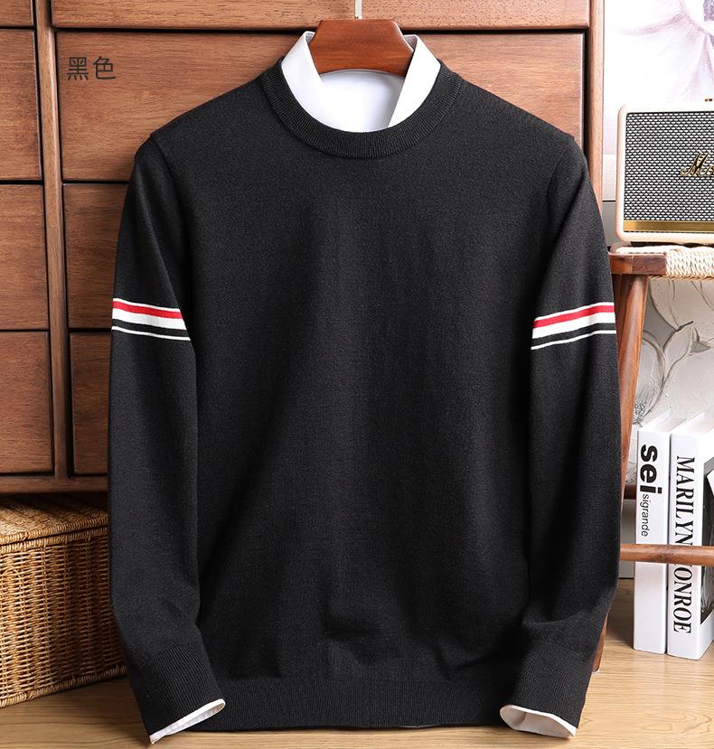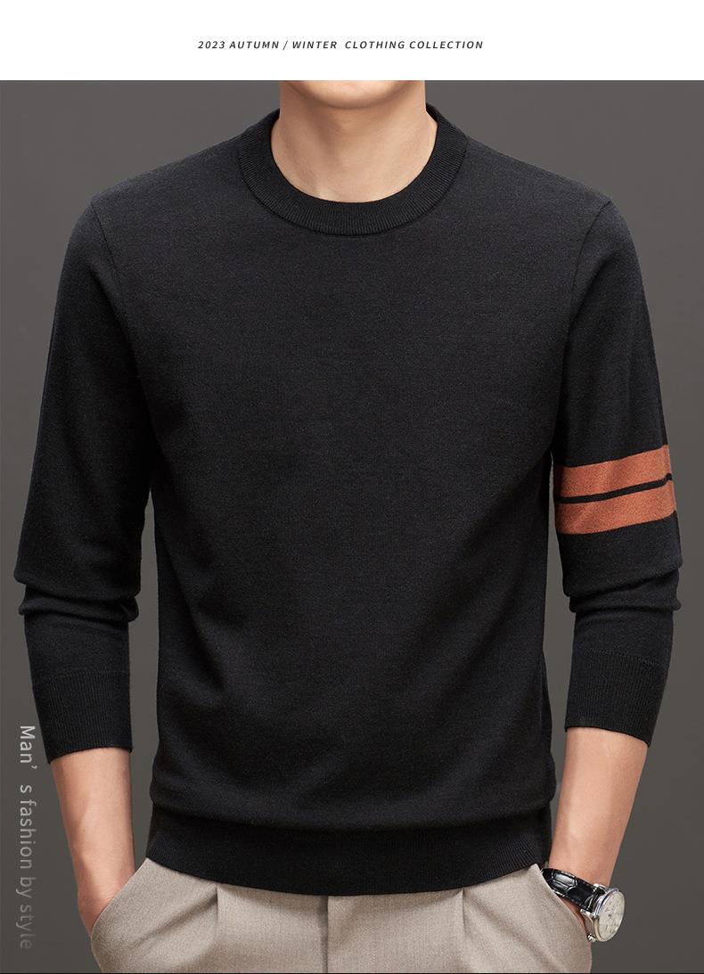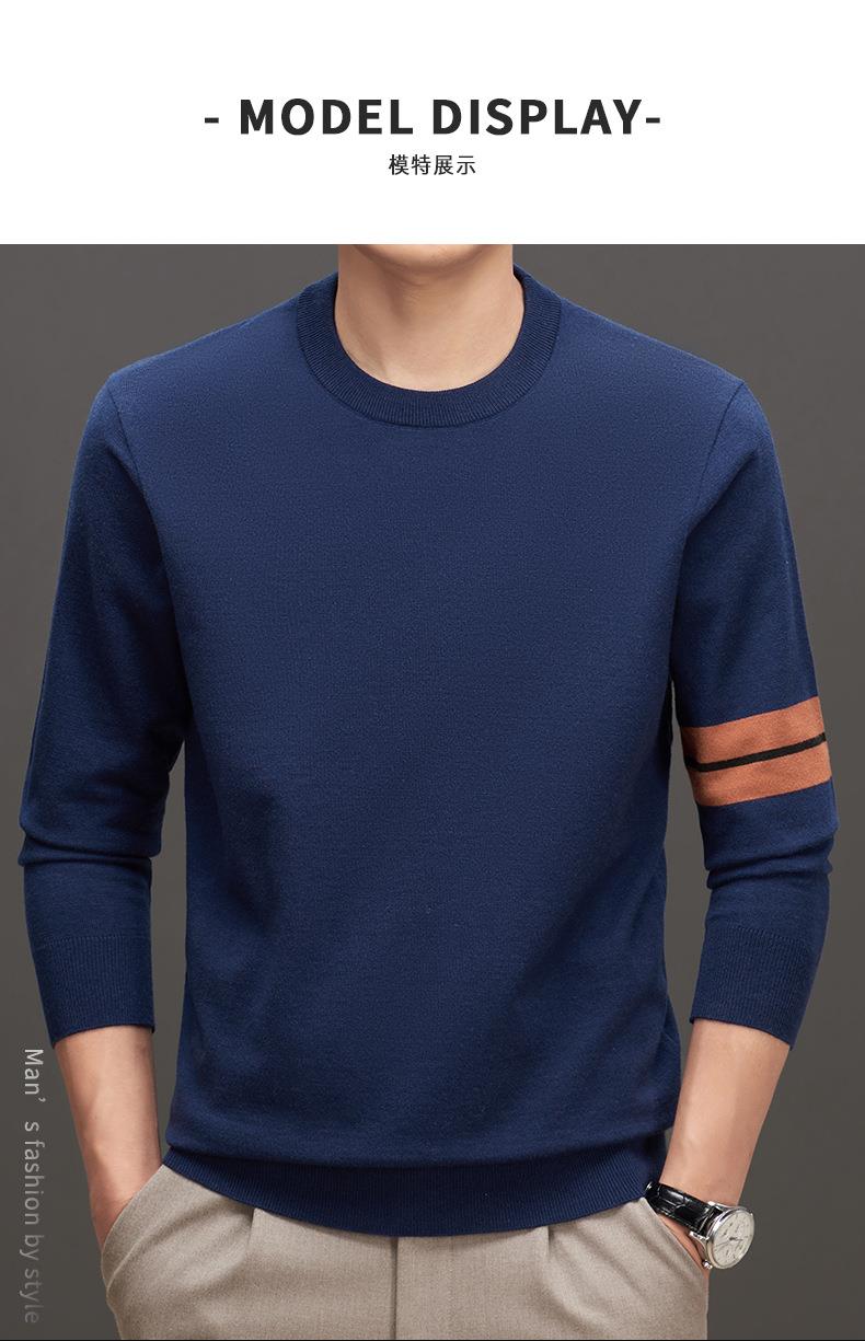 秋冬季男士天丝羊毛T恤圆领嵌花针织衫打底衫中青年长袖线衫毛衣