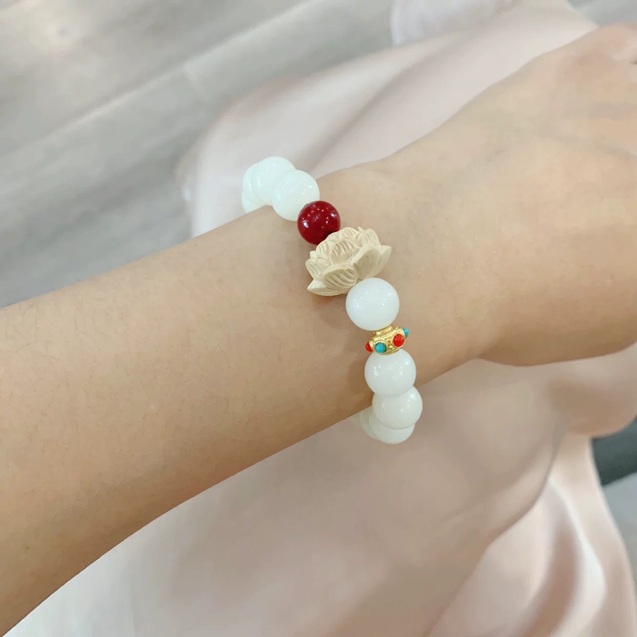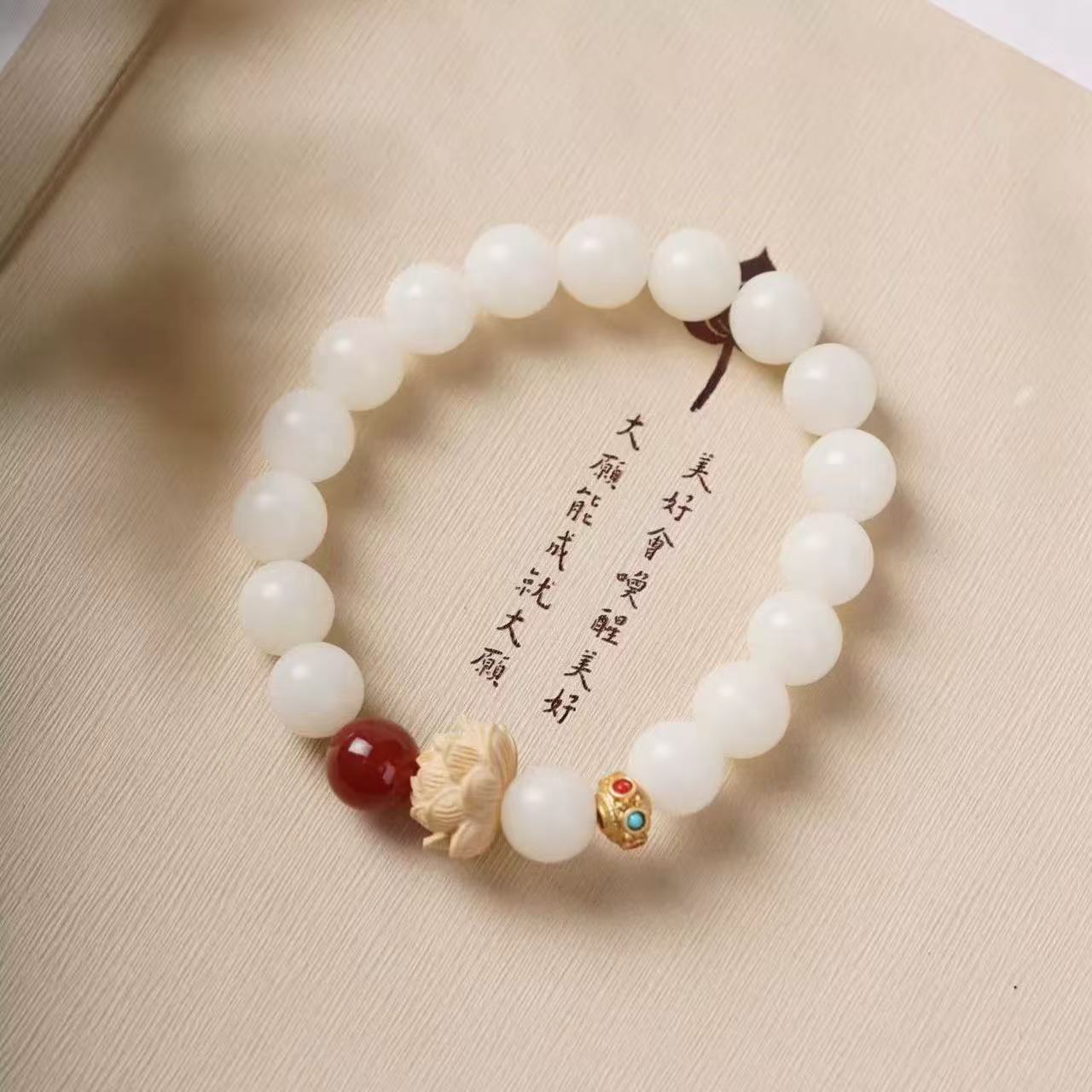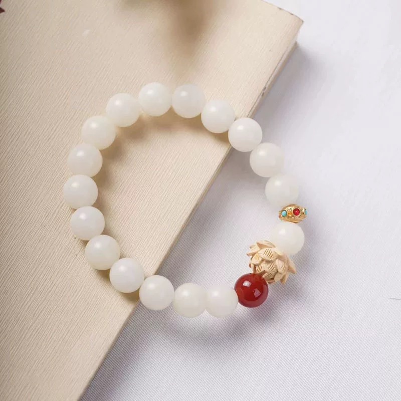 【品名】白菩提红玛瑙莲花手串