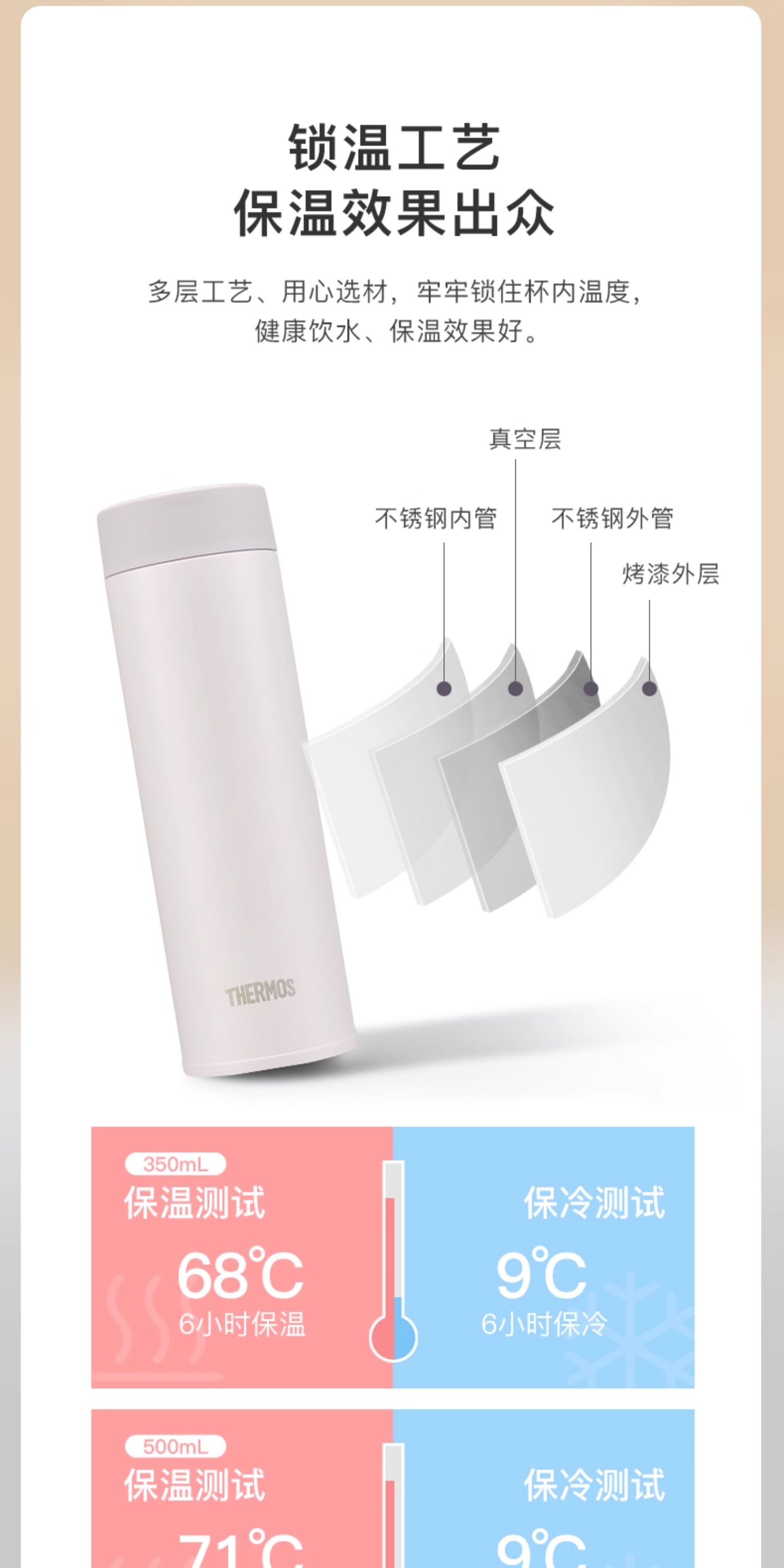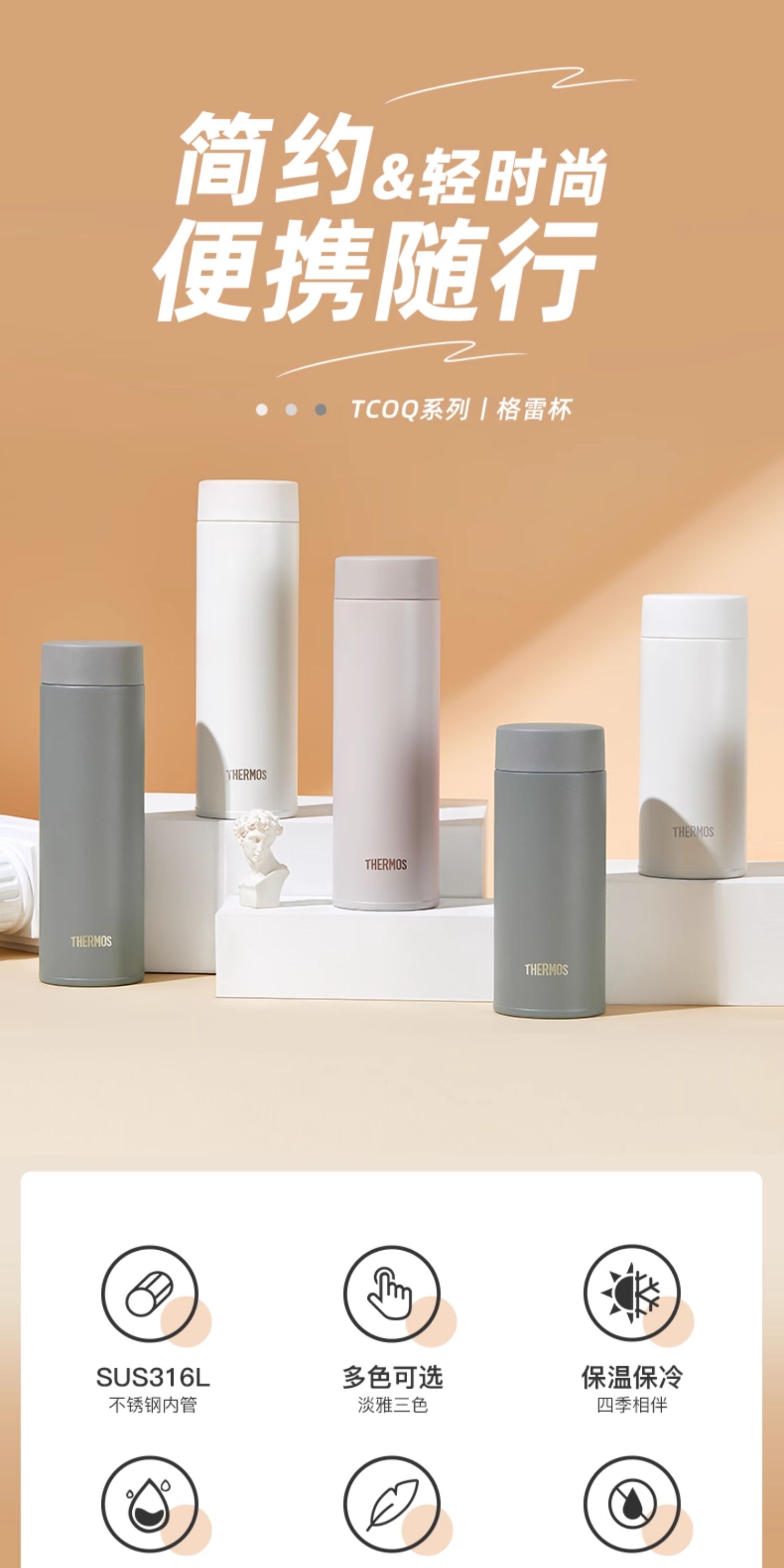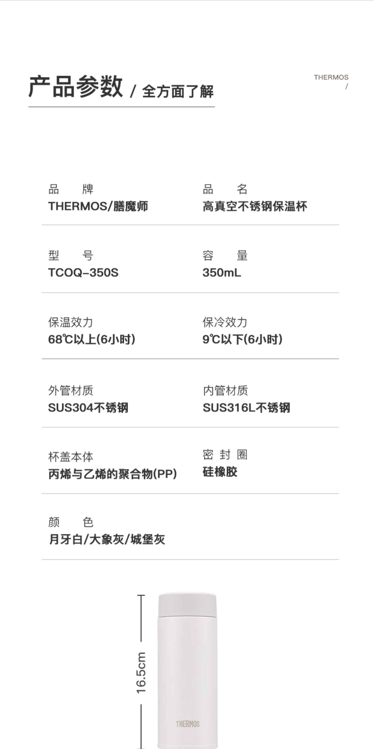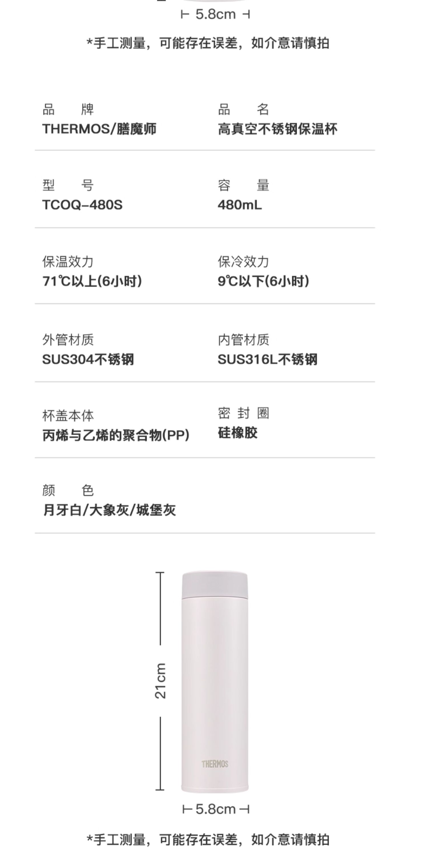 THERMOS 膳魔师 高真空不锈钢保温杯 TCOQ-480S EG 480ml 直饮杯 大象灰