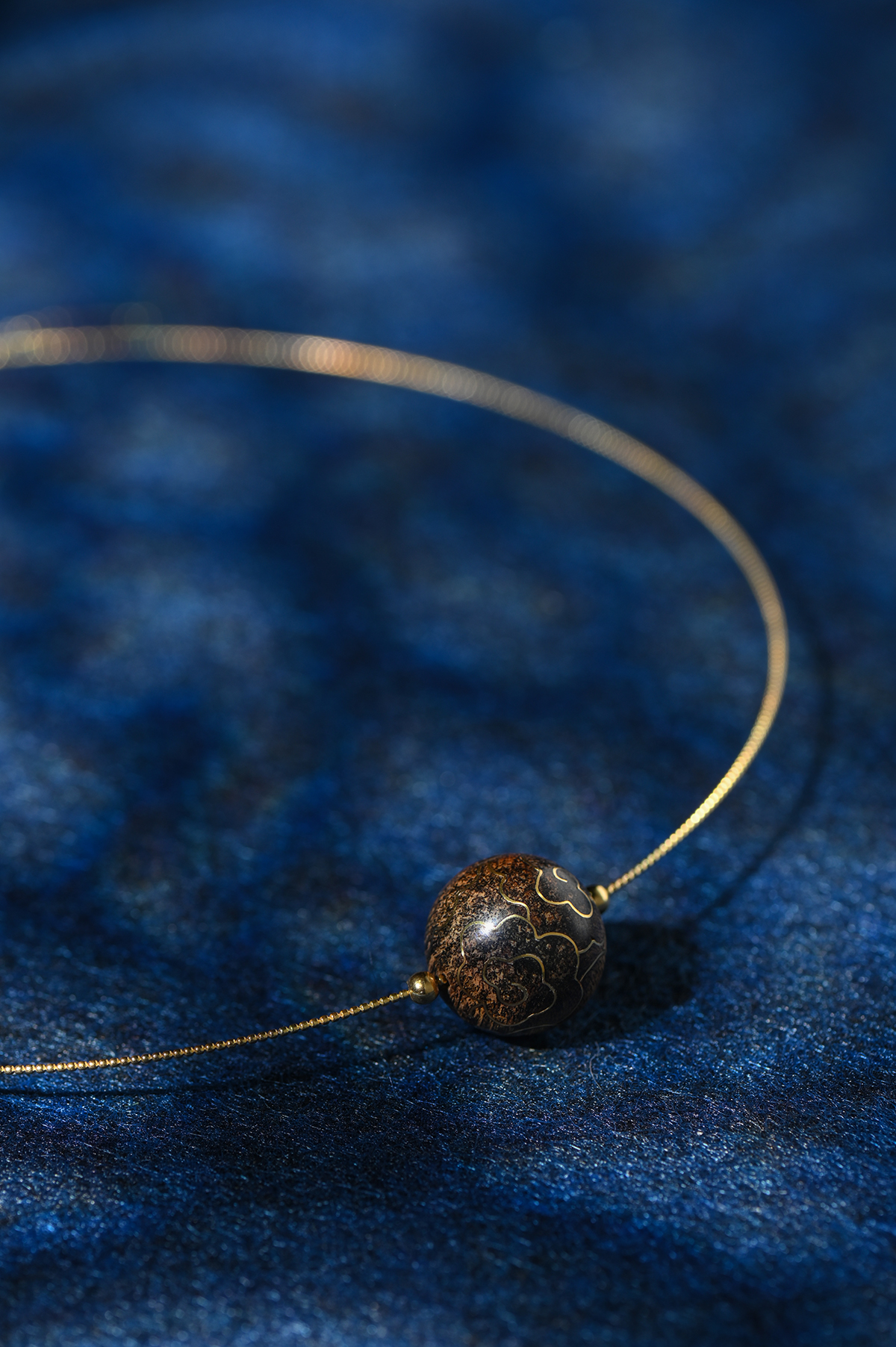 细金项圈的轻盈中和了穿搭的干练,沉香珠的肌理又添了温润质感。