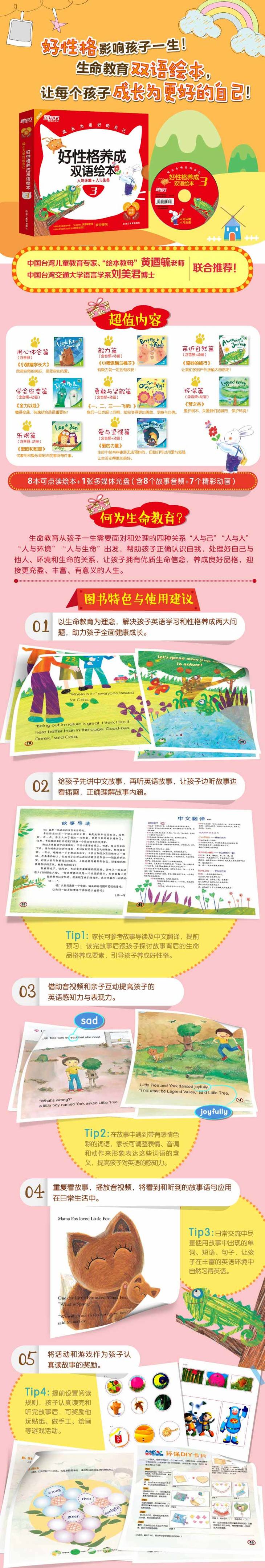 本系列绘本共分为三个套装,其中《成长为更好的自己:好性格养成双语绘本3》共8册,包含了“用心体会篇”“毅力篇”“亲近自然篇”“学会应变篇”“勇敢与坚毅篇”“环保篇”“乐观篇”“爱与坚强篇”8个主题,通过围绕着这些主题的8个妙趣横生的故事,探讨了人与环境、人与生命的关系,教孩子欣赏万物之美,爱护环境,珍惜资源,适应环境变化,树立理想,坚持不懈实现理想,直面挫折、失败与挑战,拥有感恩、惜物、应变、敢于追逐梦想、正视挫败、坚忍不拔等好品格。