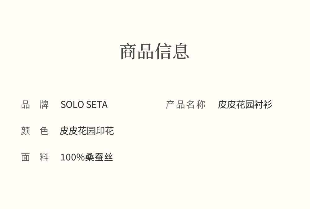 - soloseta专注于真丝织物,灵感源自意大利语,中文含义为“只做真丝”的意思。让睡衣变时尚,居家和外出瞬间切换,使其更具有出街,度假,参加宴会等功能。