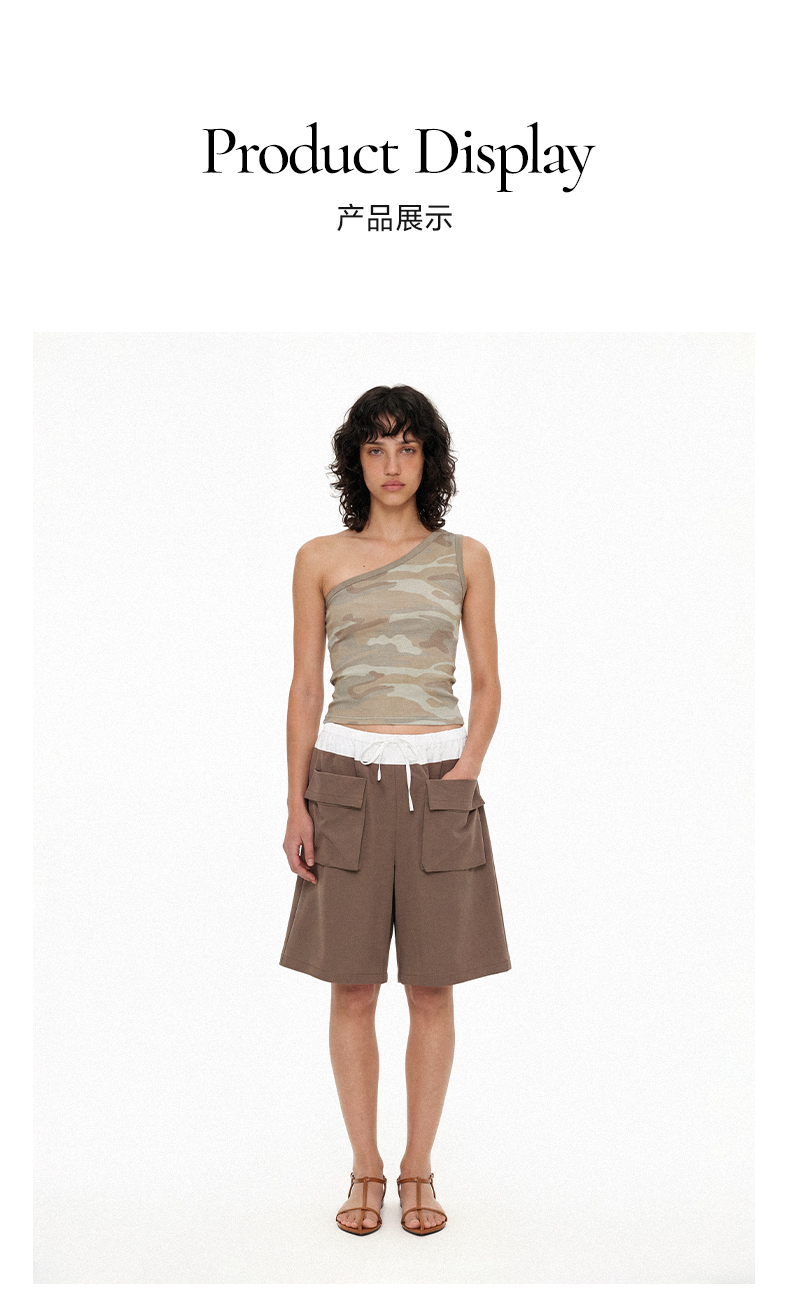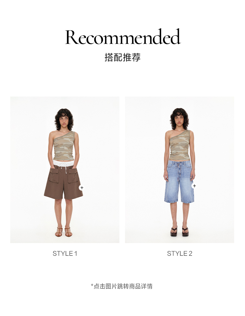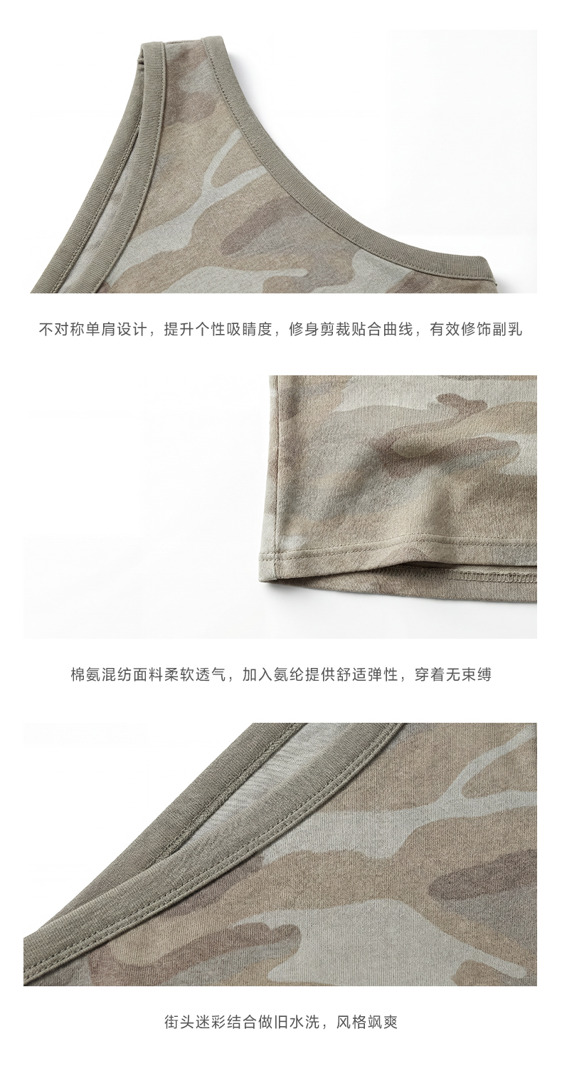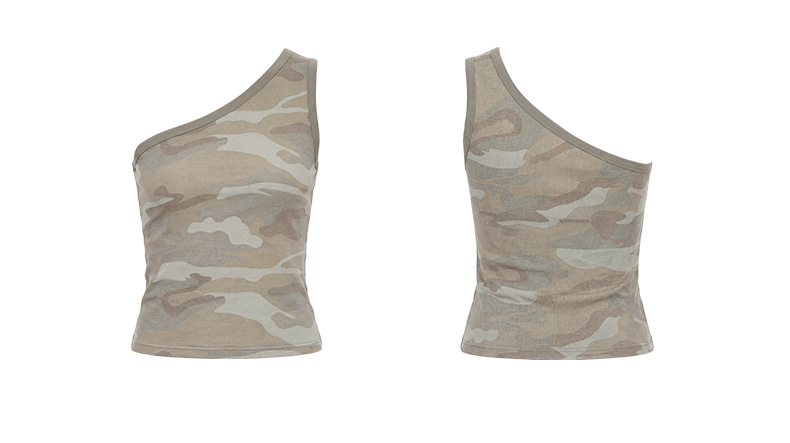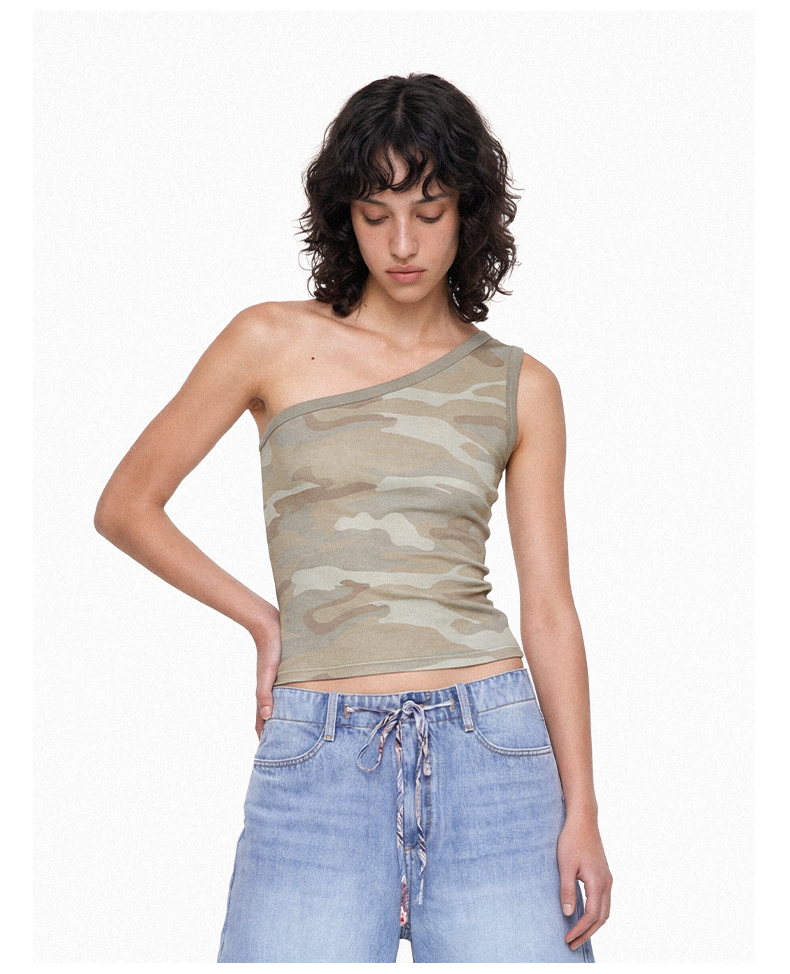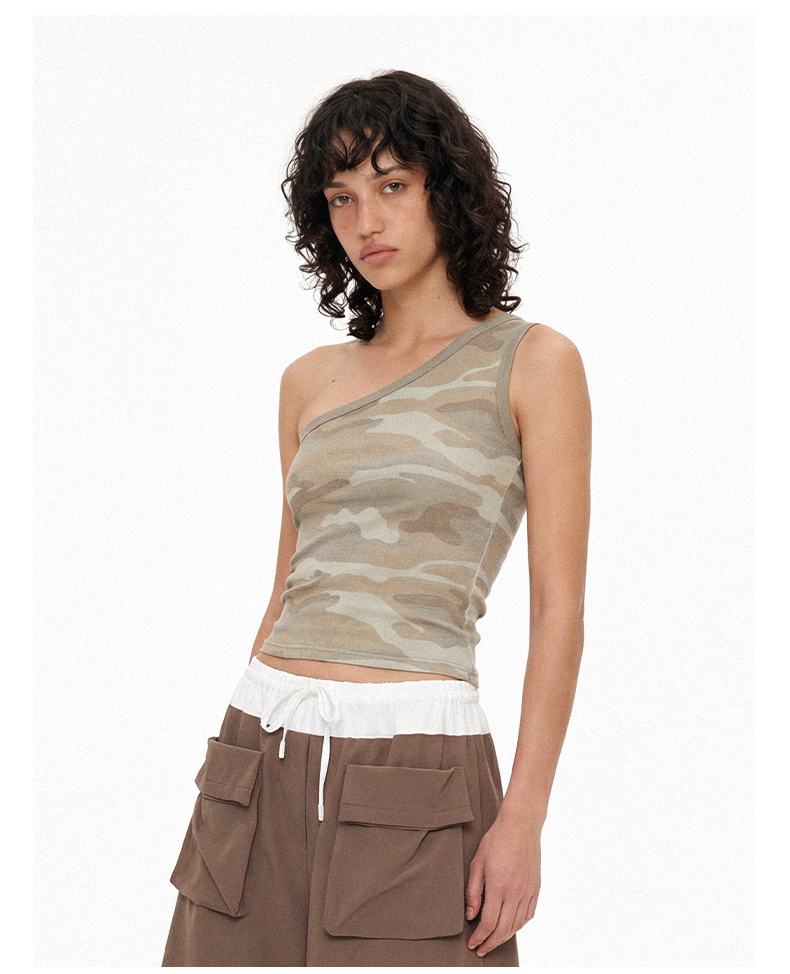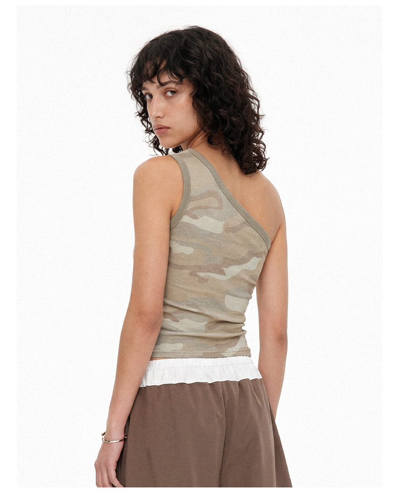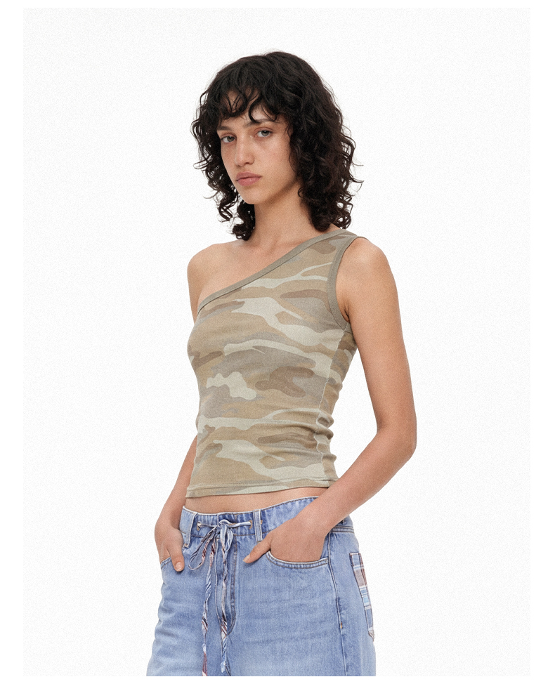 NUTH不对称斜领露肩迷彩印花修身单肩背心女(预售/发货时间同步天猫)