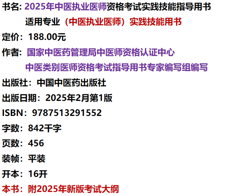 本书是2025年中医执业医师资格考试实践技能指导用书(具有规定学历 师承或确有专长),国家执业医师考试指南,国家中医药管理局中医师资格认证中心推荐用书,由中国中医药出版社出版发行!