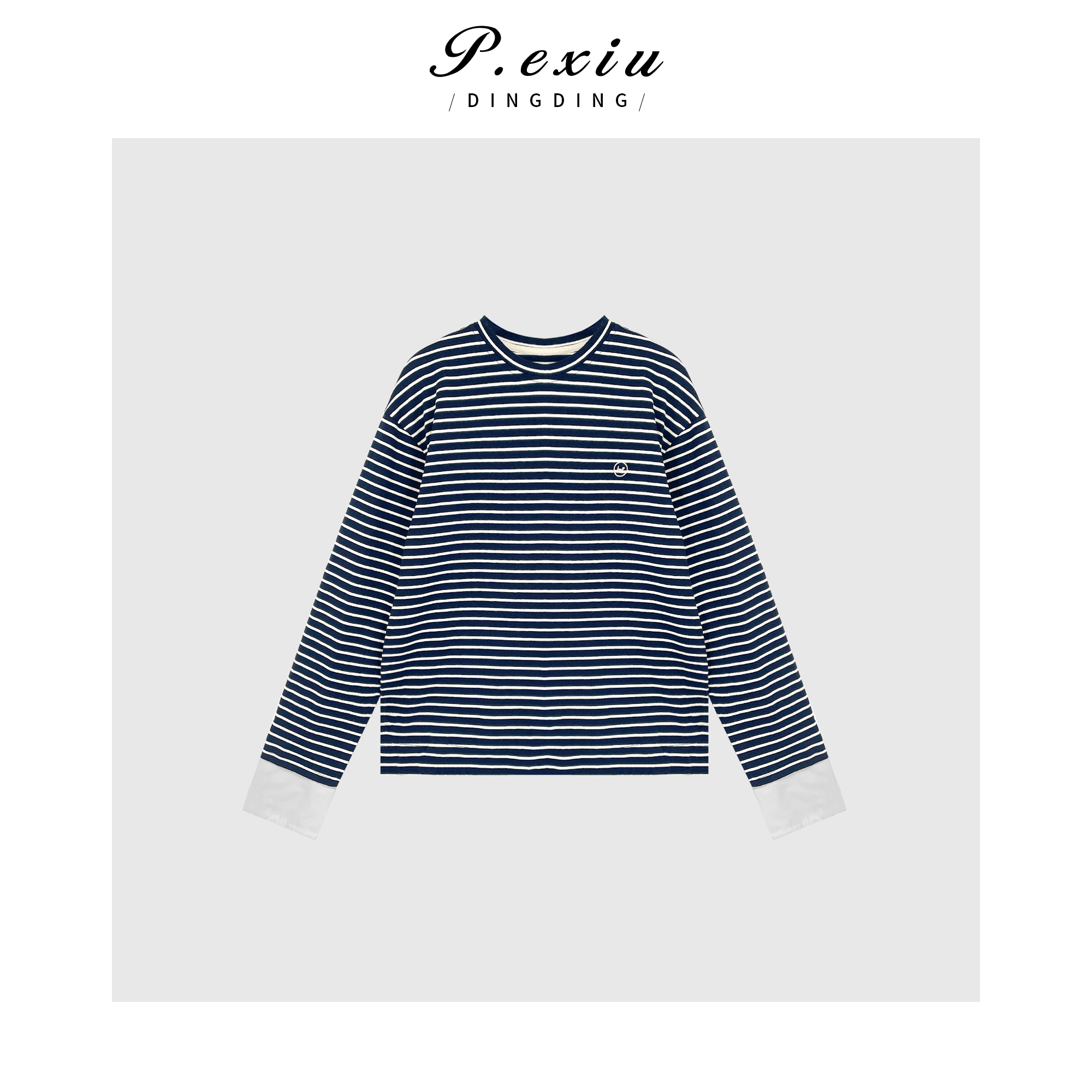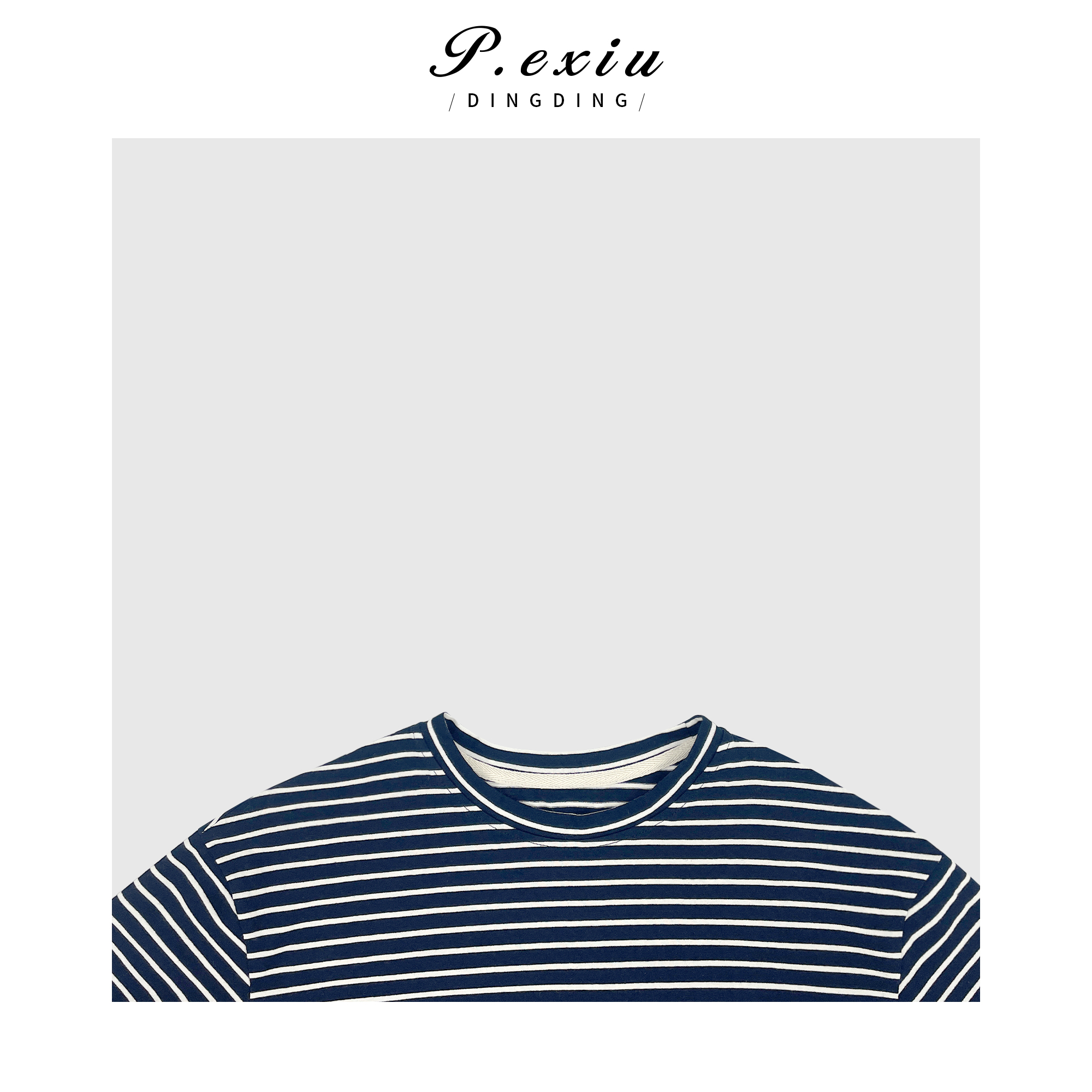 04-1潘依绣丁丁宠粉100棉原创设计蓝白条撞色拼接袖圆领T恤 W-61922