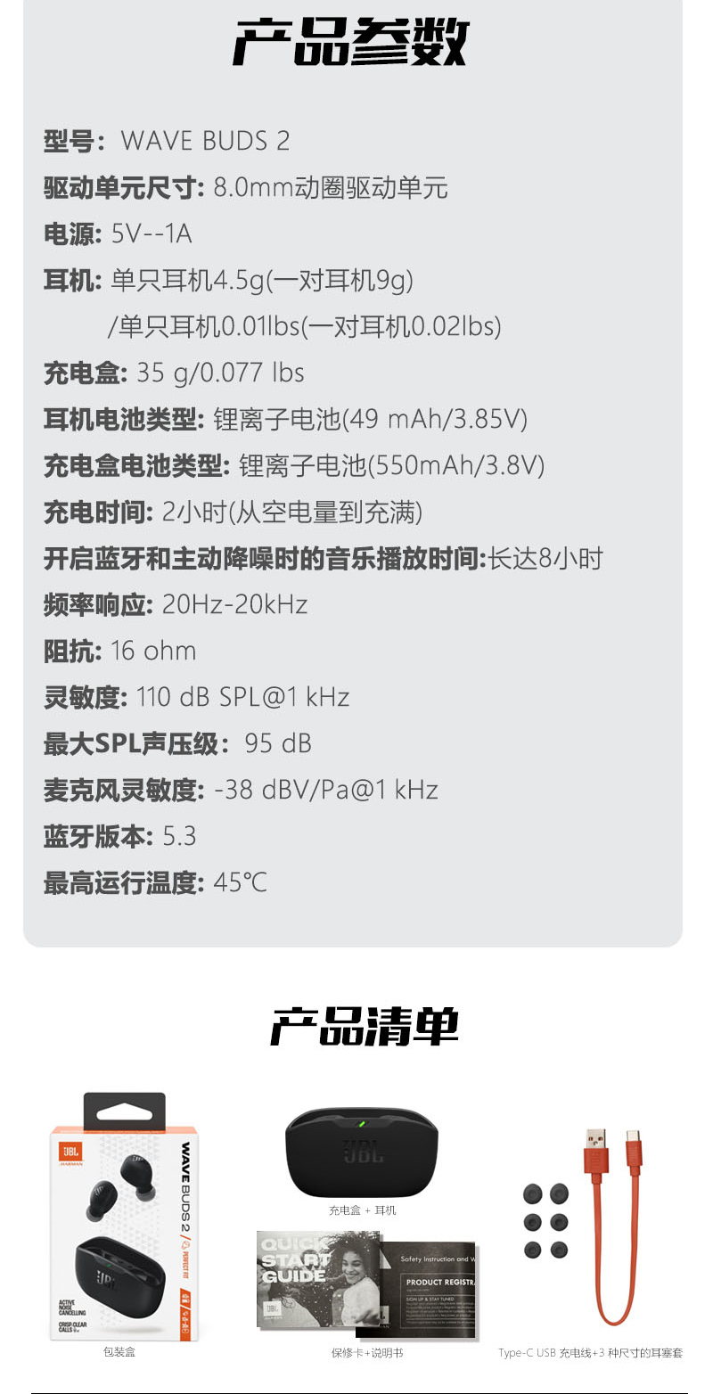 JBL WAVE BUDS2 真无线快充蓝牙防水耳机