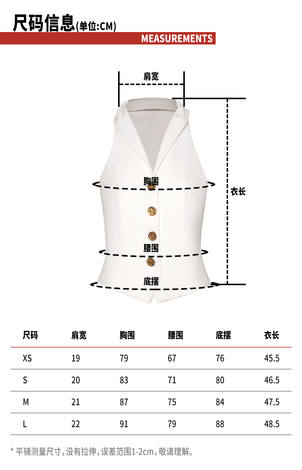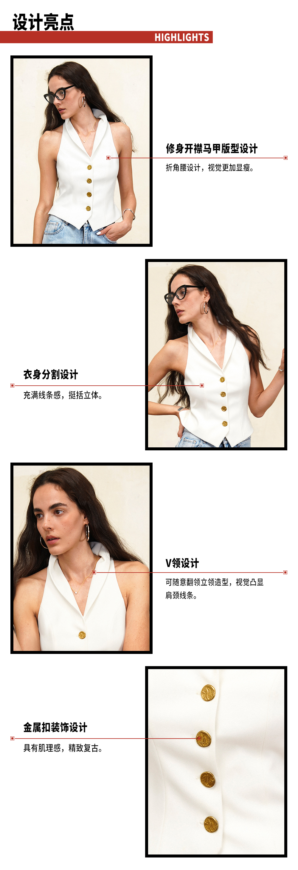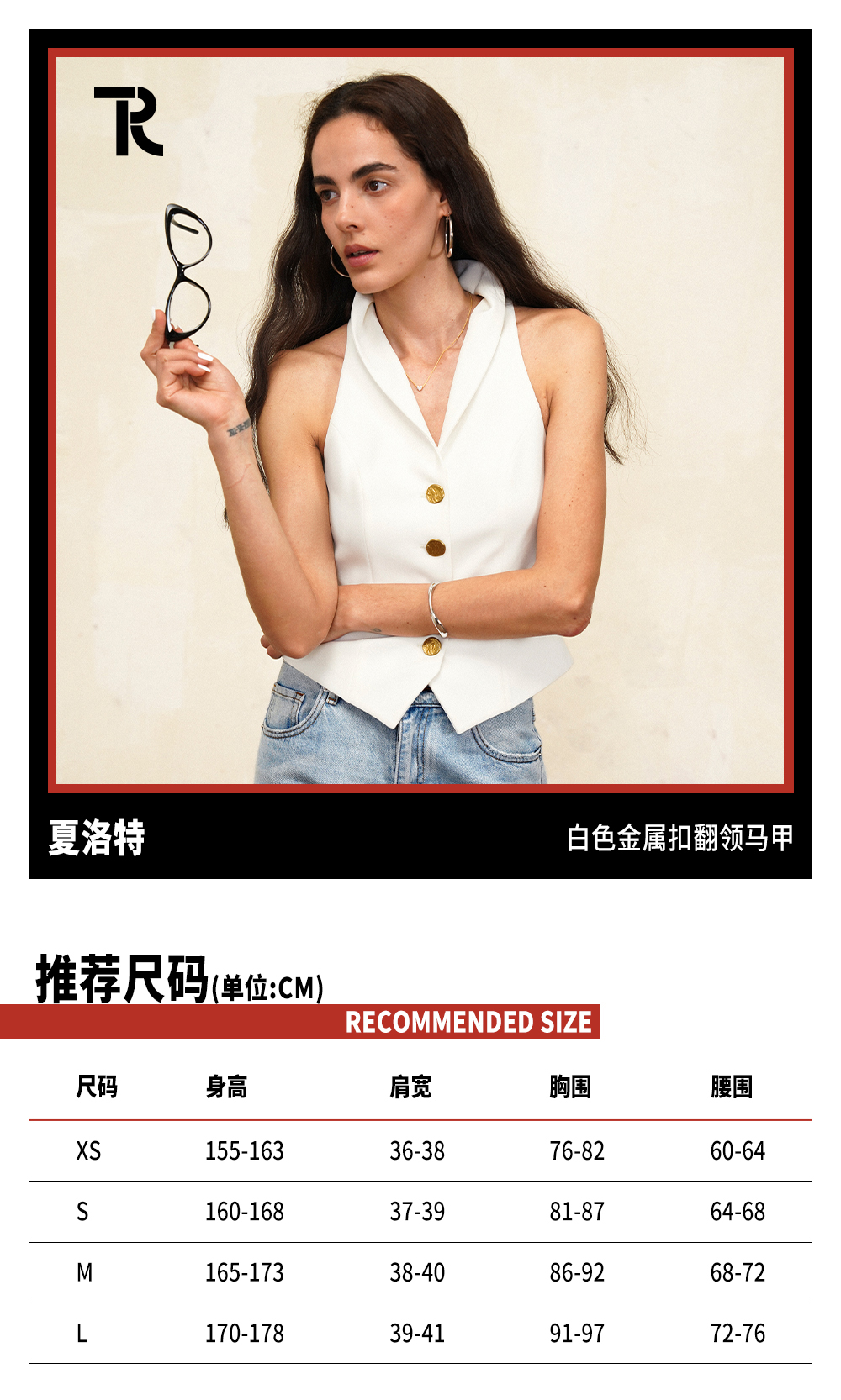 TR她热 夏洛特 白色金属扣复古修身显瘦V领立领西装马甲背心