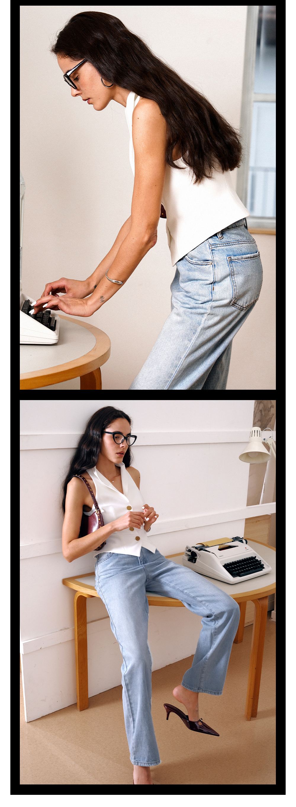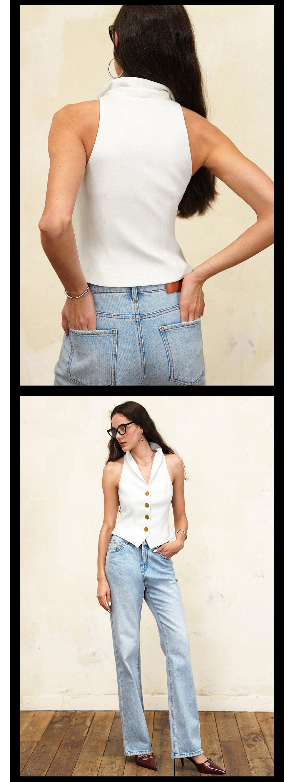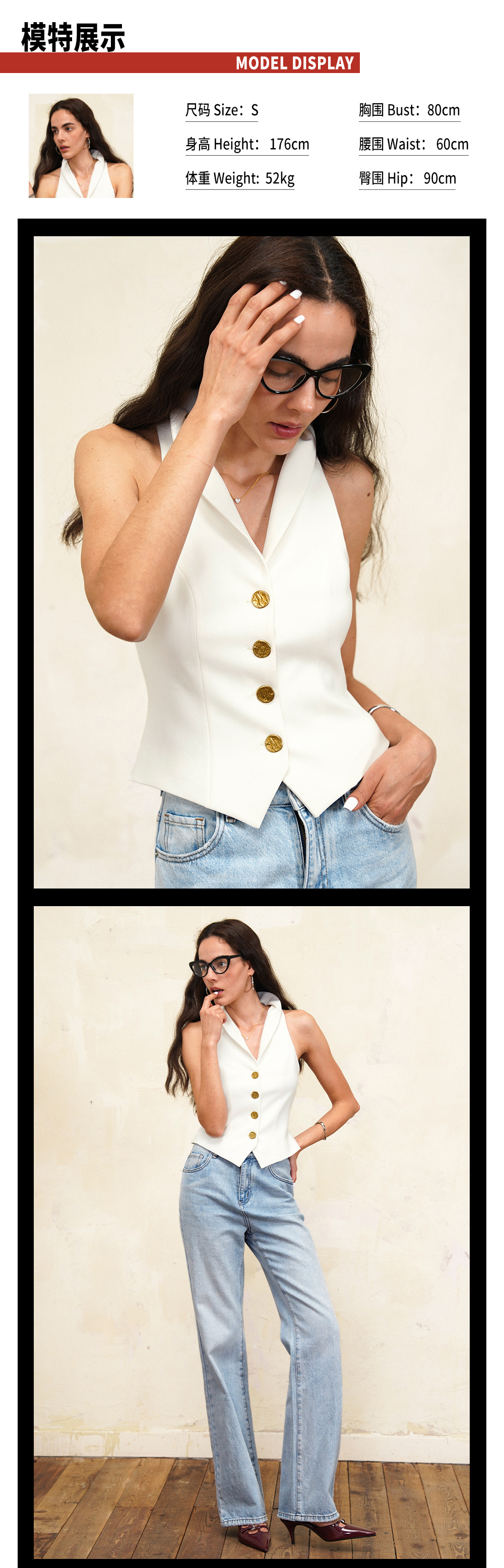 TR她热 夏洛特 白色金属扣复古修身显瘦V领立领西装马甲背心