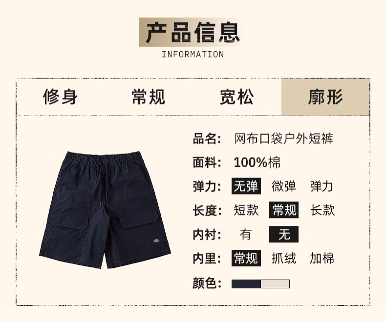 Dickies短裤网布口袋城市宽松休闲工装口袋短裤 休闲百搭 DK013096