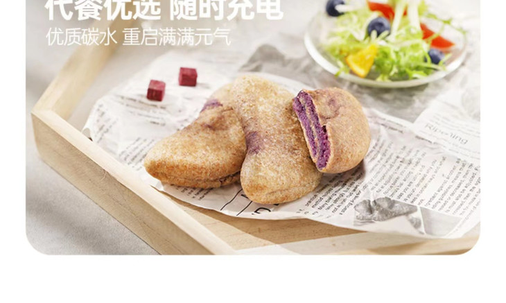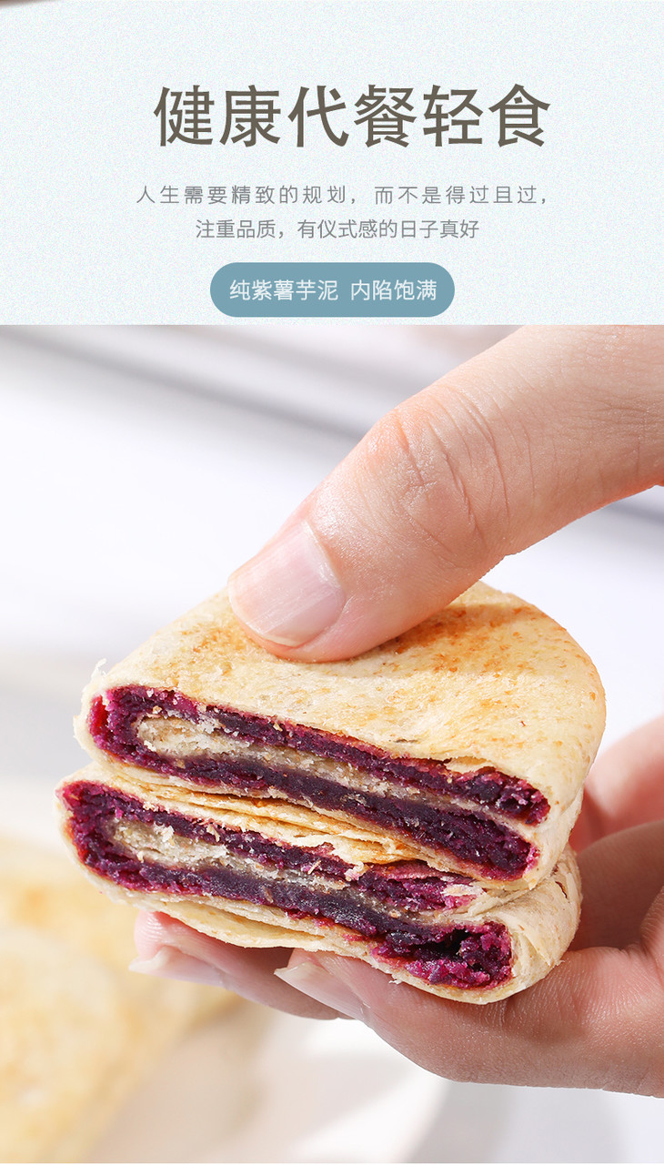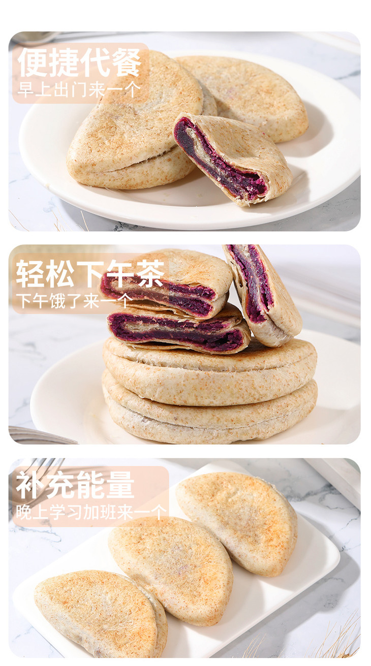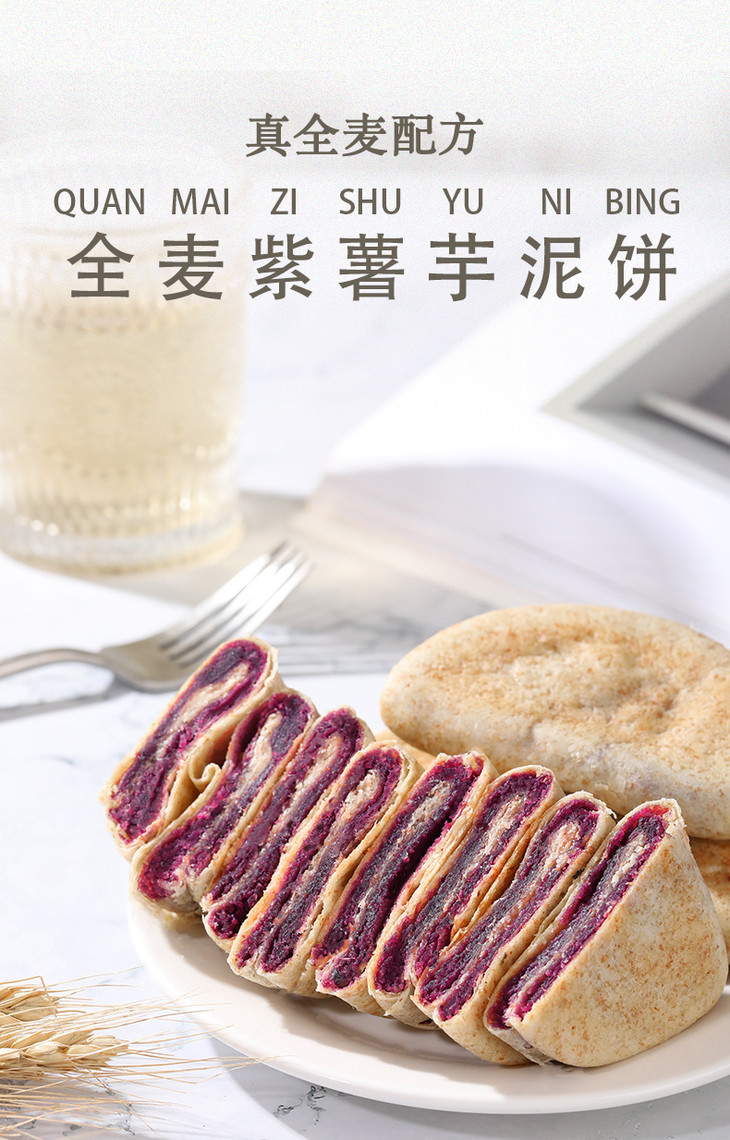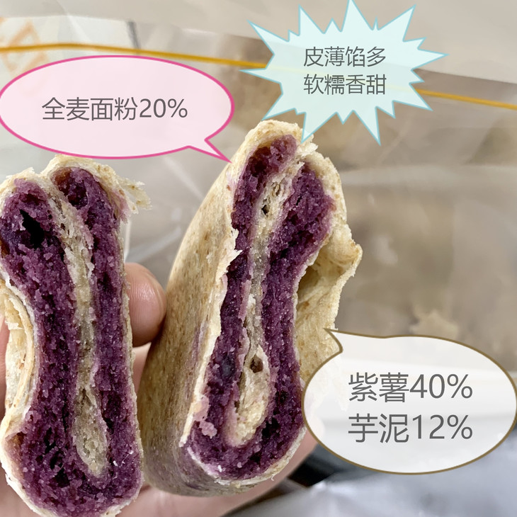 养生、健康瘦身的仙女们都知道平衡膳食的小知识,每天人体摄入的谷薯类食物建议是在250g-400g,这款饼采用纯紫薯+芋泥馅料搭配,并且是全麦配方的饼皮,真是粗粮代餐的佳选。
