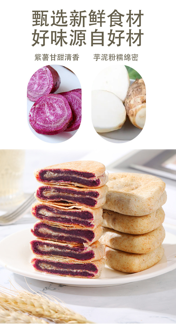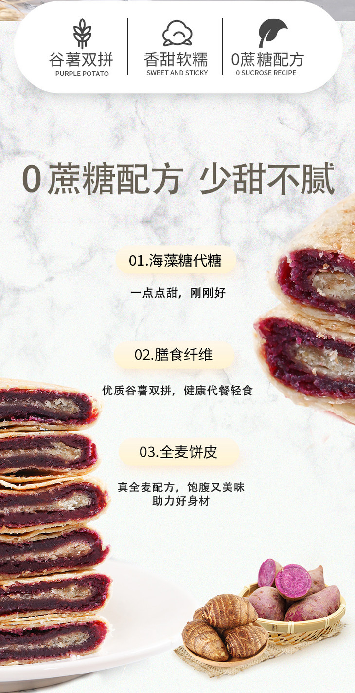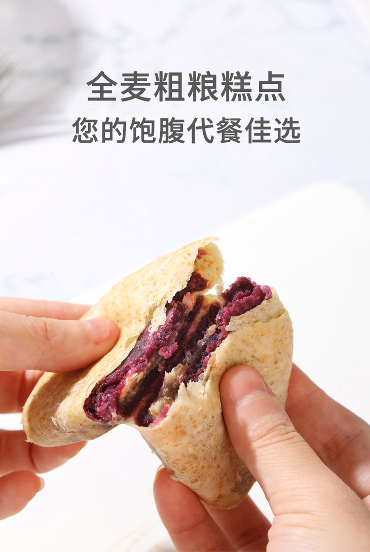 【卖点说明】纯紫薯芋泥谷薯双拼+真全麦饼皮,一款含膳食纤维的粗粮代餐糕点,0蔗糖添加,采用海藻糖代糖,淡淡甜度刚刚好,多吃不腻。表皮软糯,内馅饱满,老少皆宜。独立包装、卫生又便捷。