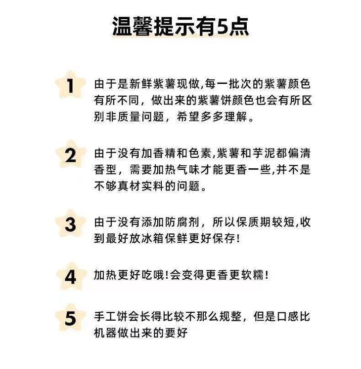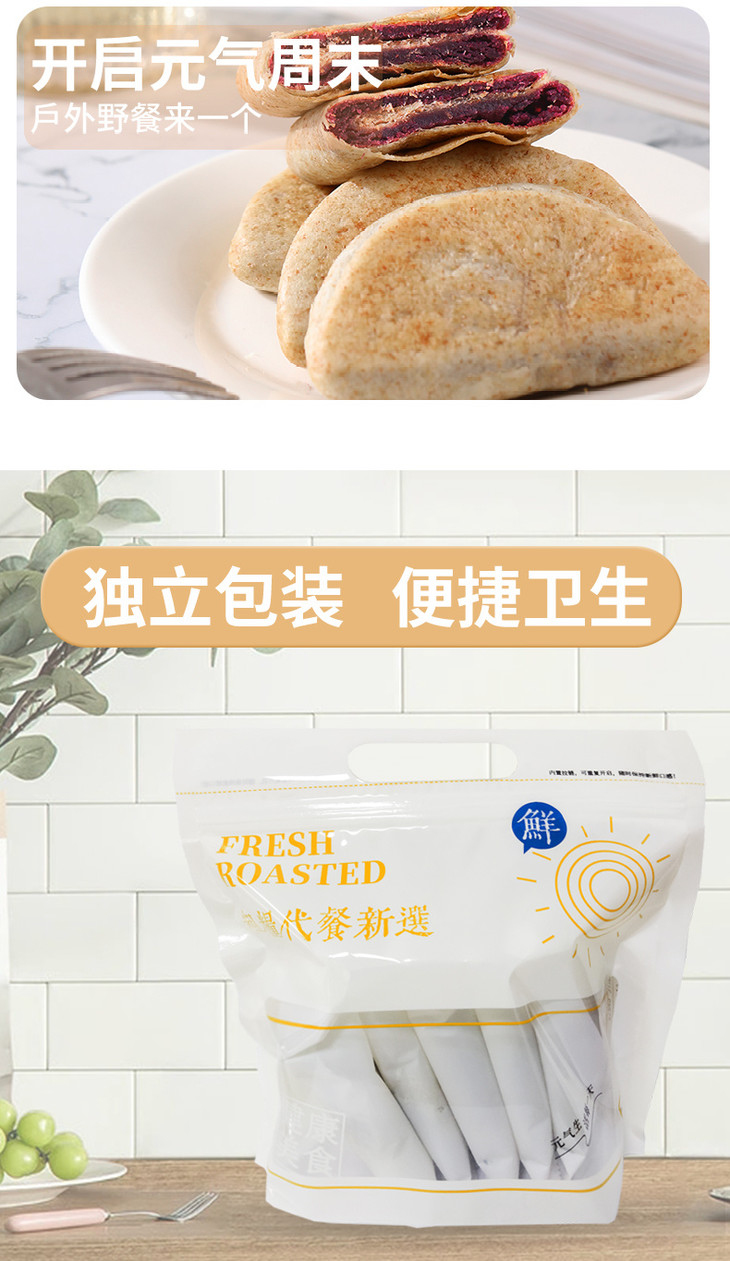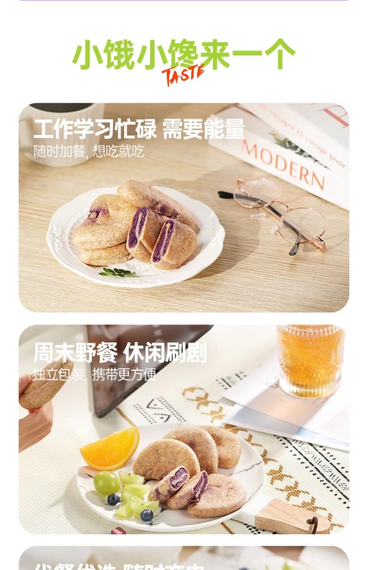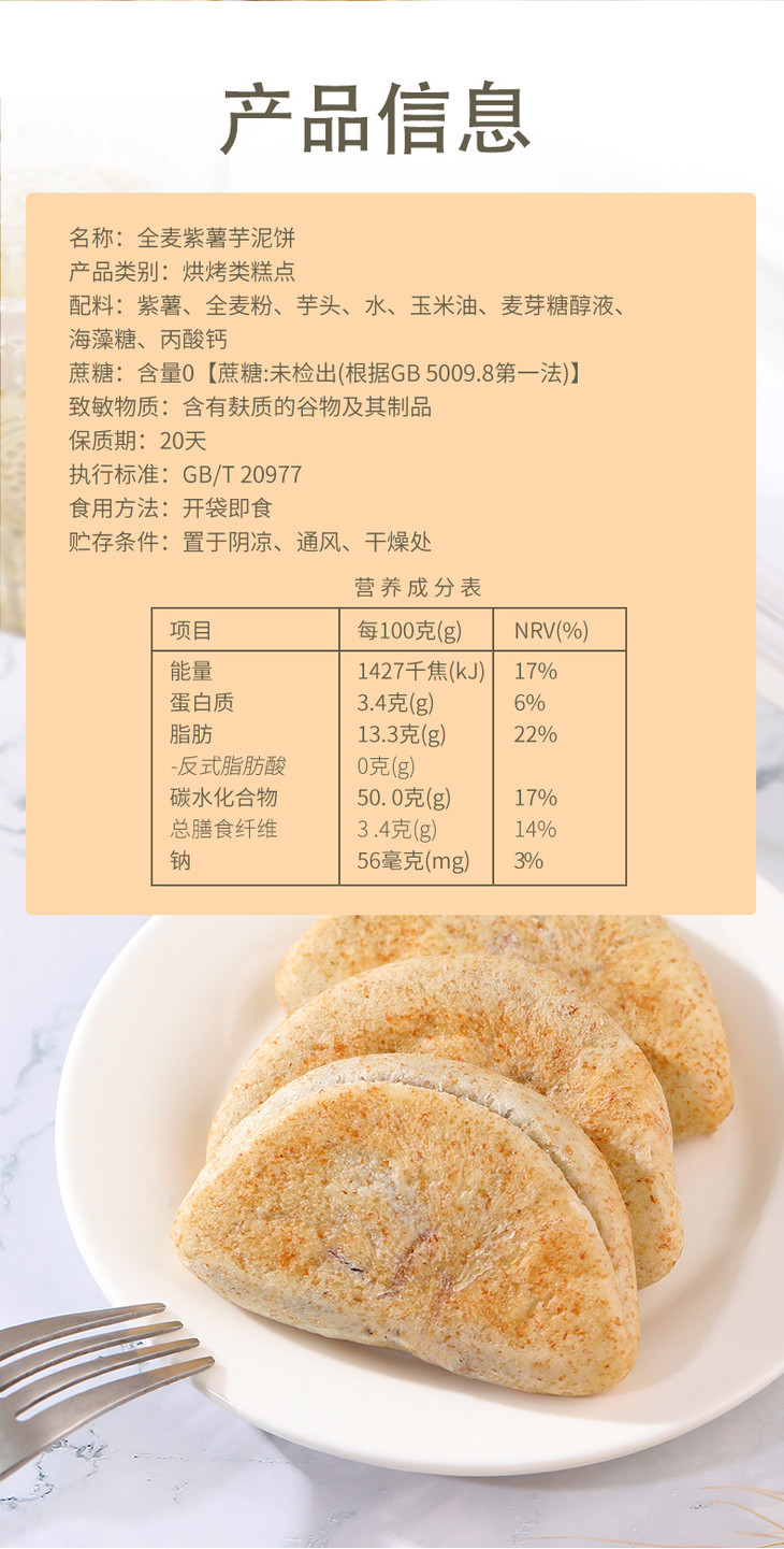 【卖点说明】纯紫薯芋泥谷薯双拼+真全麦饼皮,一款含膳食纤维的粗粮代餐糕点,0蔗糖添加,采用海藻糖代糖,淡淡甜度刚刚好,多吃不腻。表皮软糯,内馅饱满,老少皆宜。独立包装、卫生又便捷。