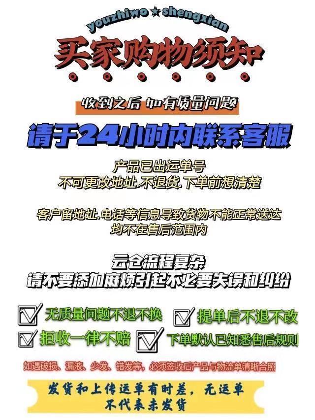 【售后说明】 1、该产品属于食品类,不支持无理由退换货; 2、产品已经发出的情况下,不可更改地址,拒绝任何形式的拒签,收到产品后当场验货; 3、如出现异常情况,请带面单+产品拍照+产品包装照片与我们联系,我们会第一时间处理,如产品有质量问题可在收货12小时之内,联系客服进行售后或者补发 ; 4、留错地址、电话等信息导致货物不能正常送达均不在售后范围内; 5、发货和上传运单有24-48小时时差,没有运单/单号无物流可以稍等,如时间较长可联系售后查询; 6、因快递暴力导致产品品相不好,不影响食用,不在售后范围内不作赔付!