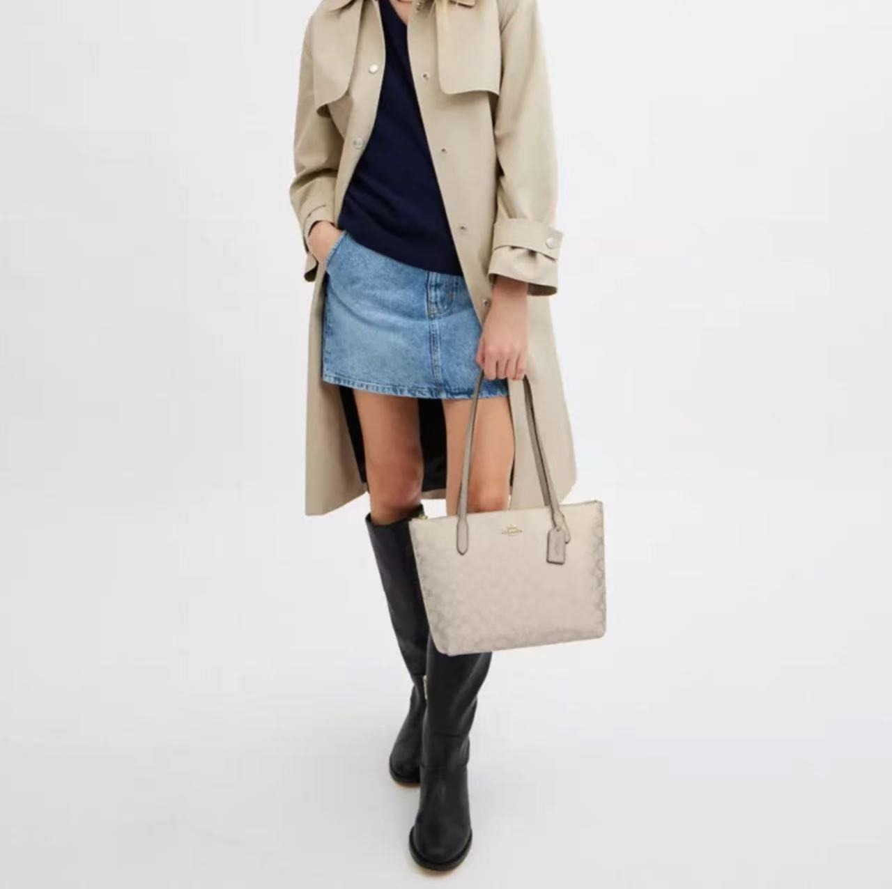 COACH蔻驰 Zip Top Tote 24 经典标志FIONA拉链开合 人造革 托特包Tote包购物袋手提单肩包 中号 男女同款情侣款 香槟色混合色