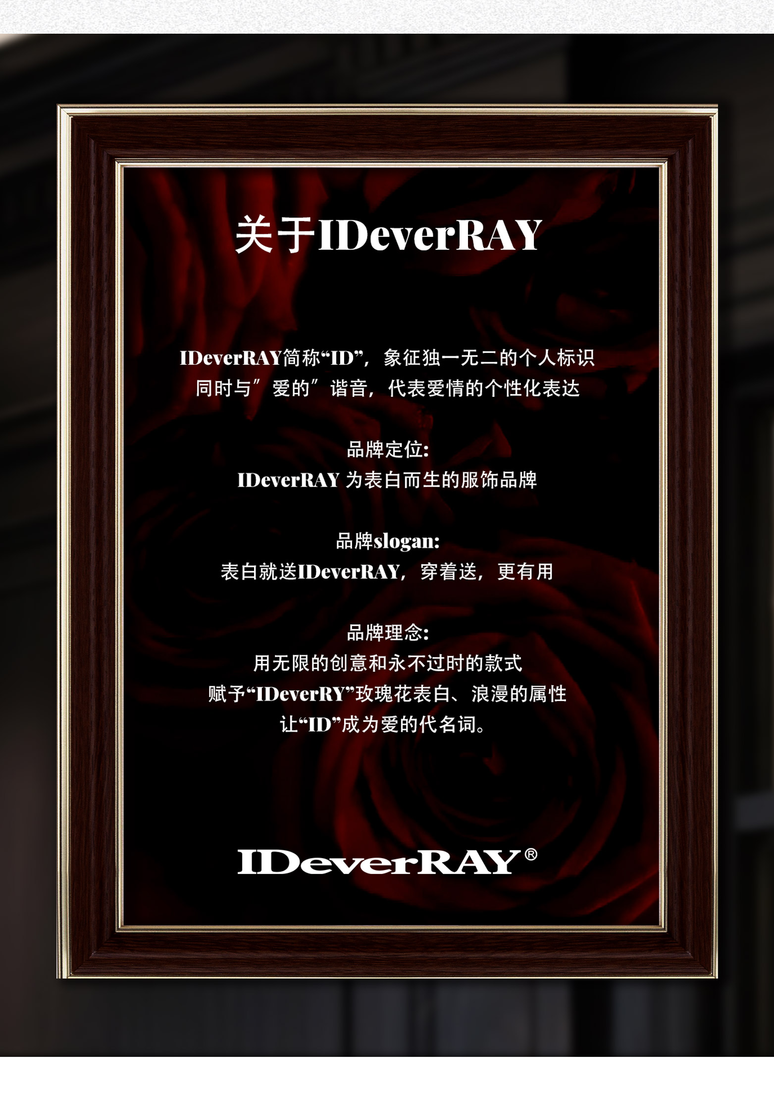 - ❣IDeverRAY简称“ID”,象征独一无二的个人标识,同时与"爱的"谐音,代表爱情的个性化表达
