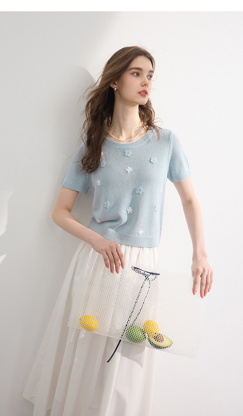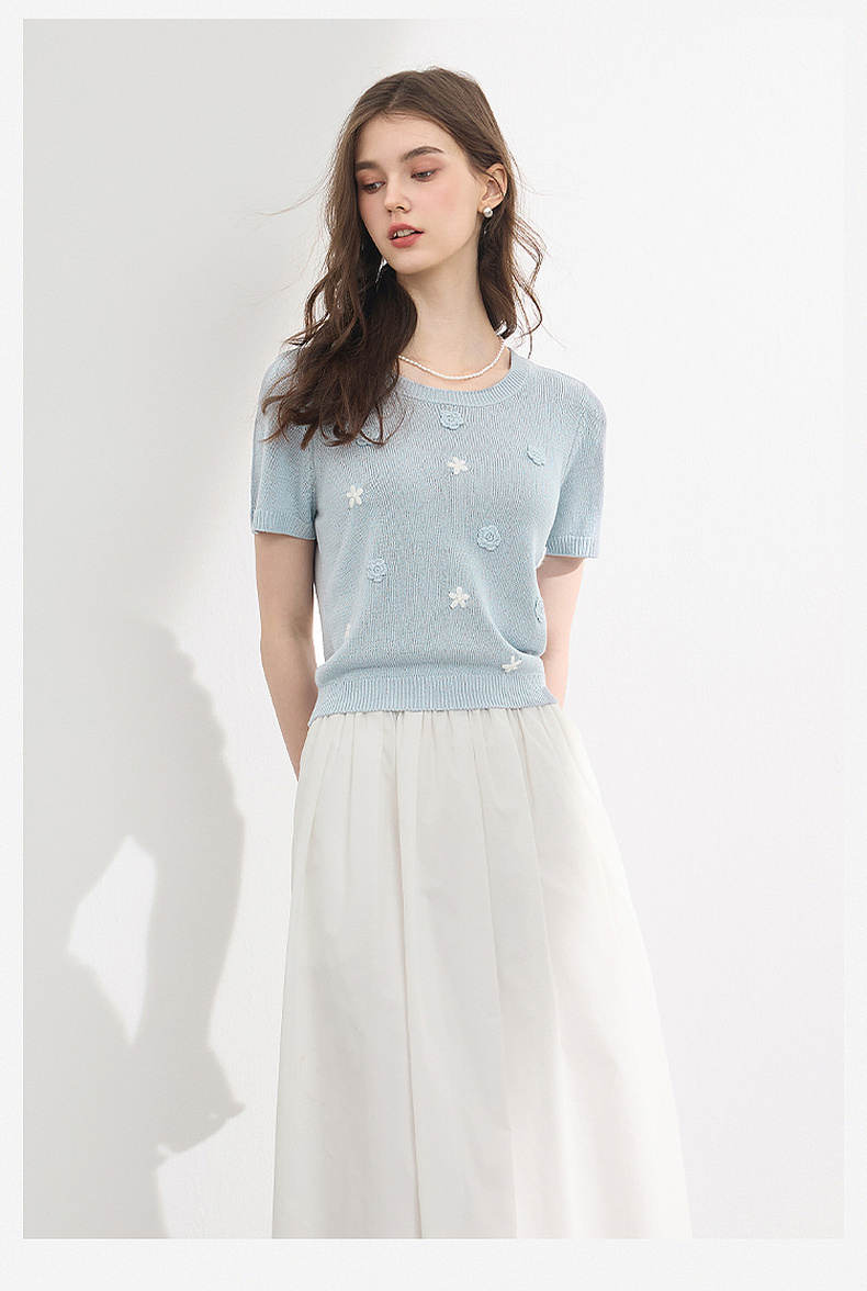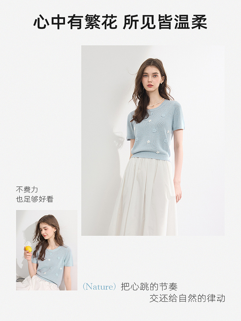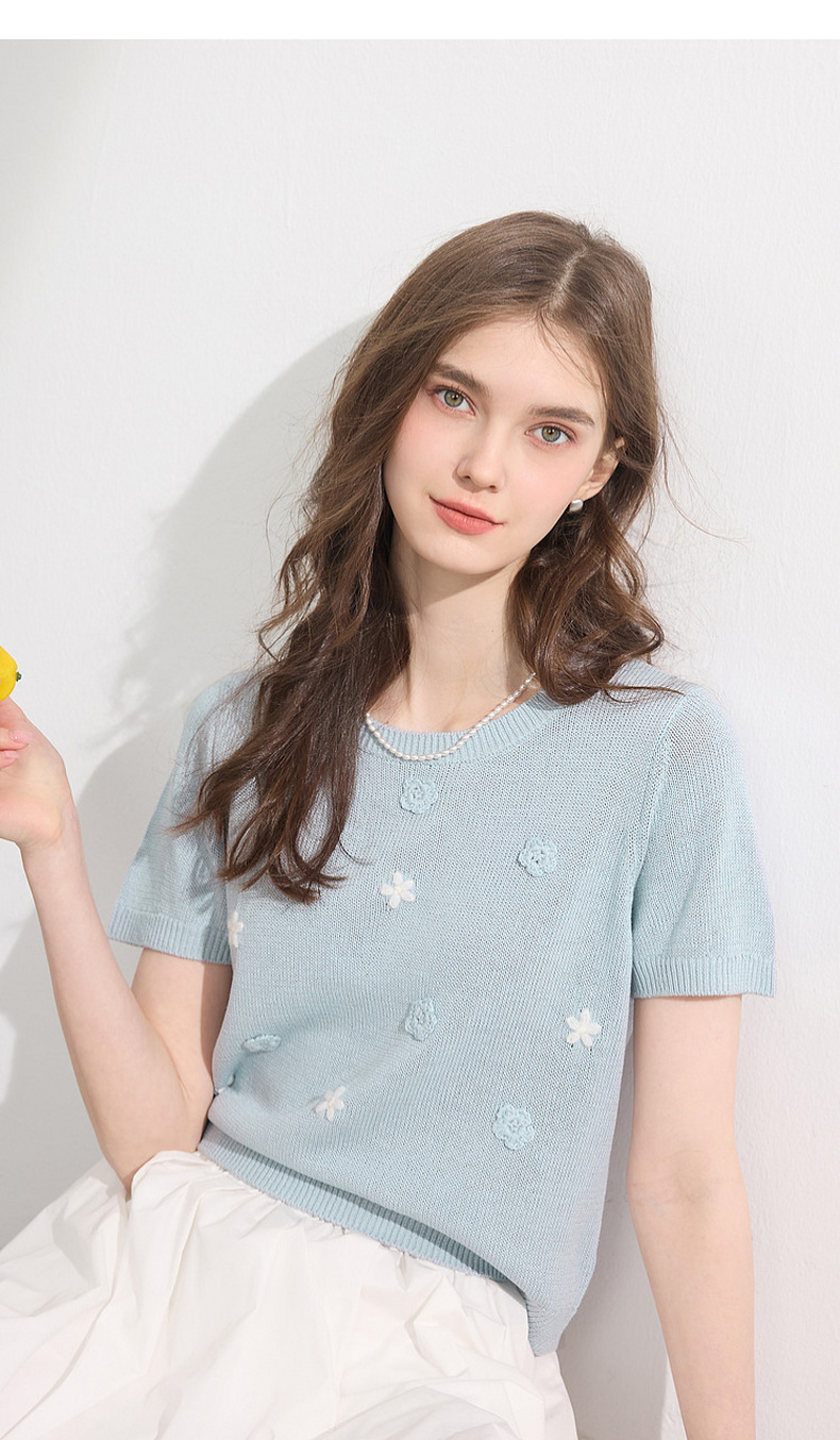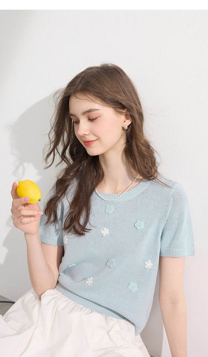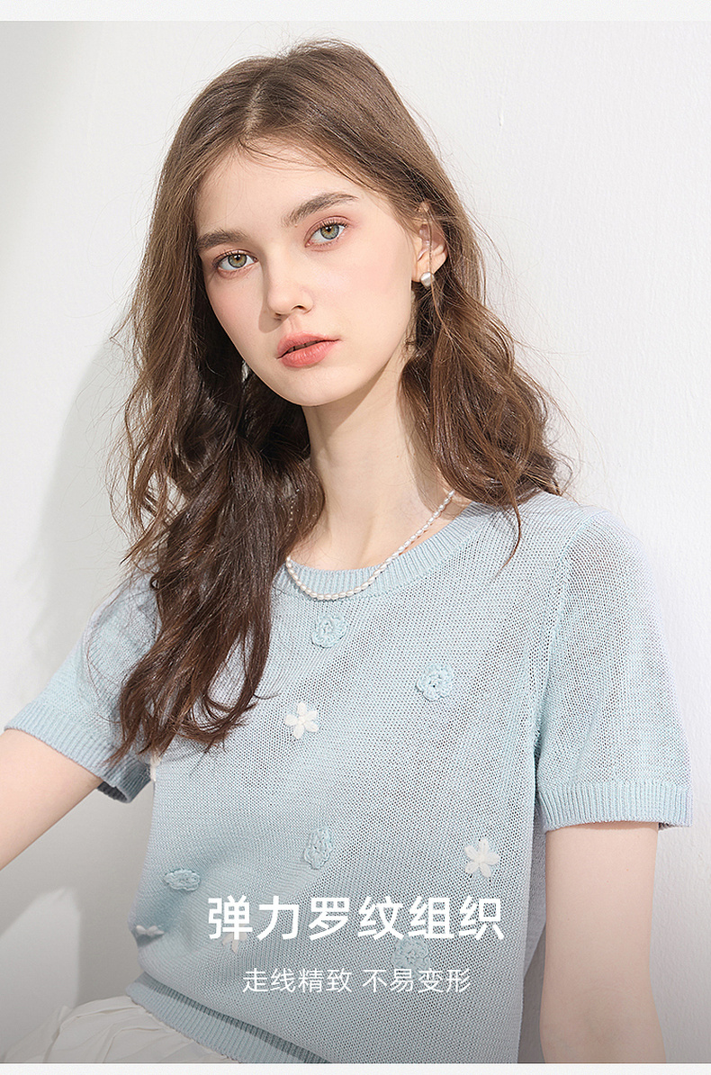 三彩2026夏季新款花朵针织衫圆领短袖正肩毛衫套头衫短款上衣M