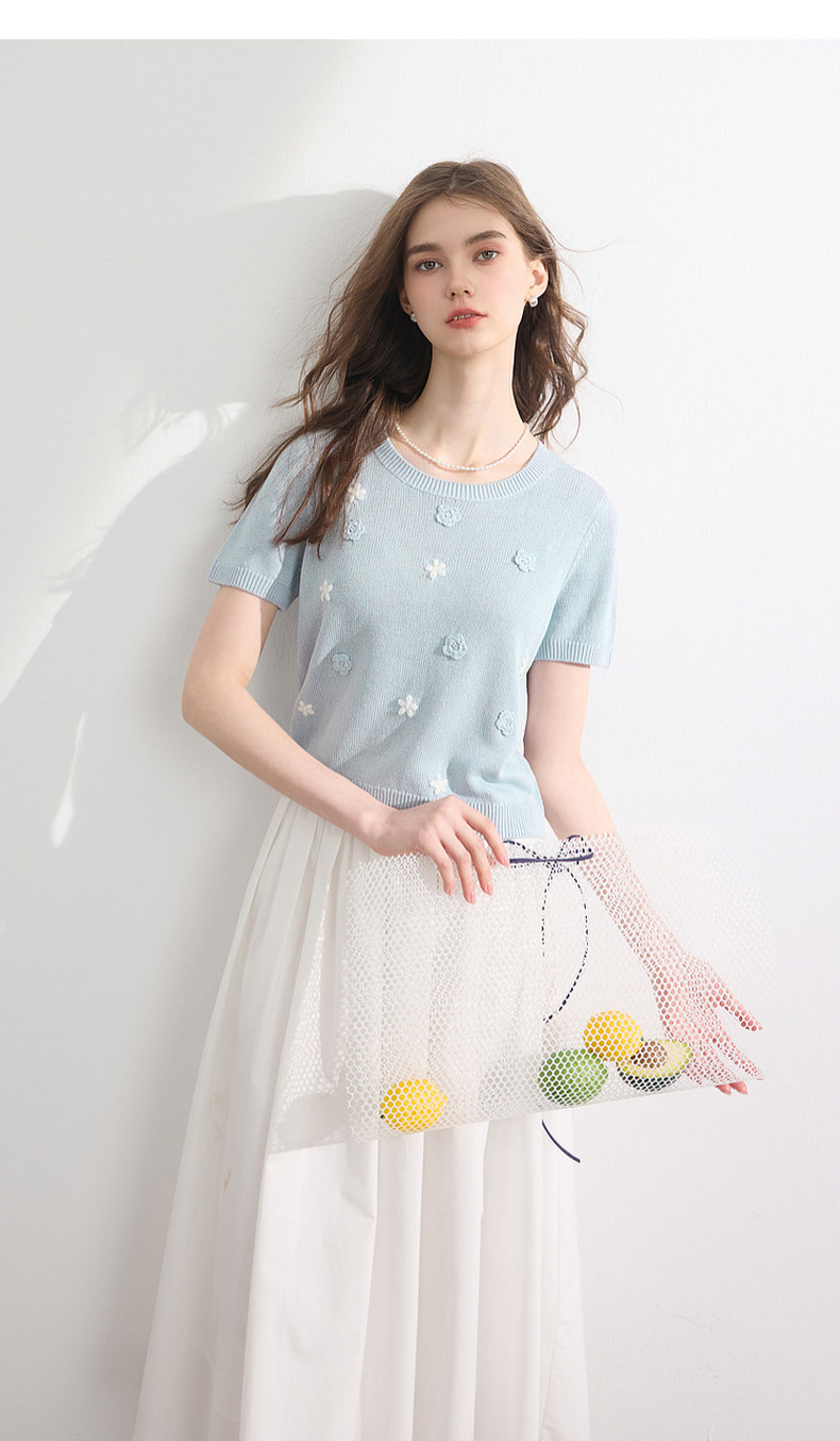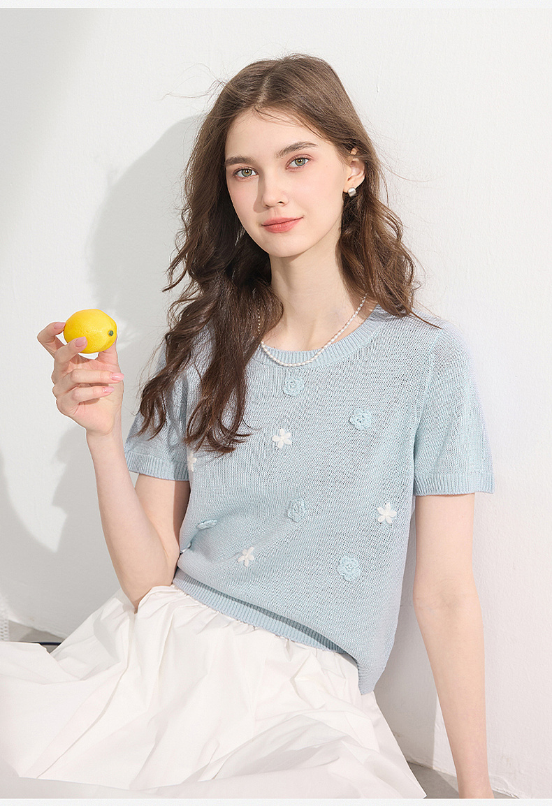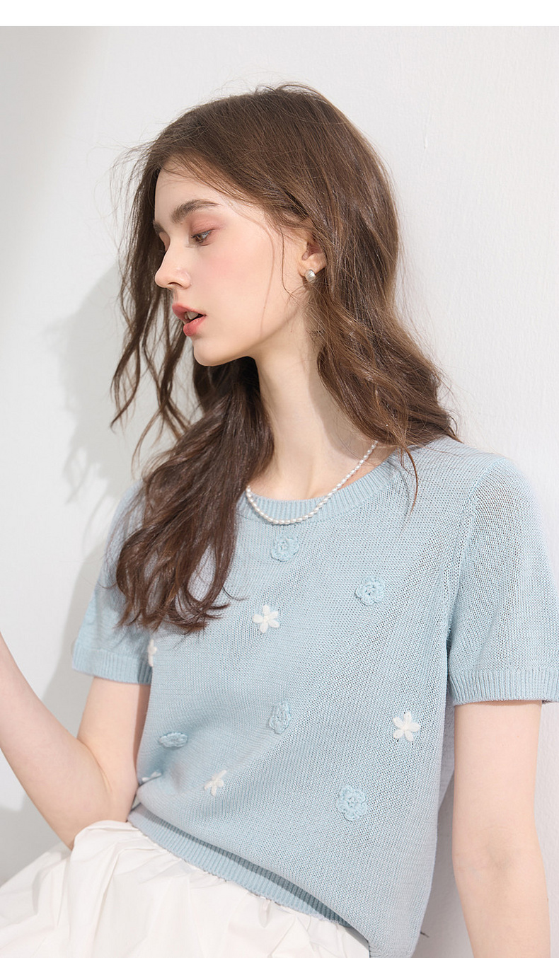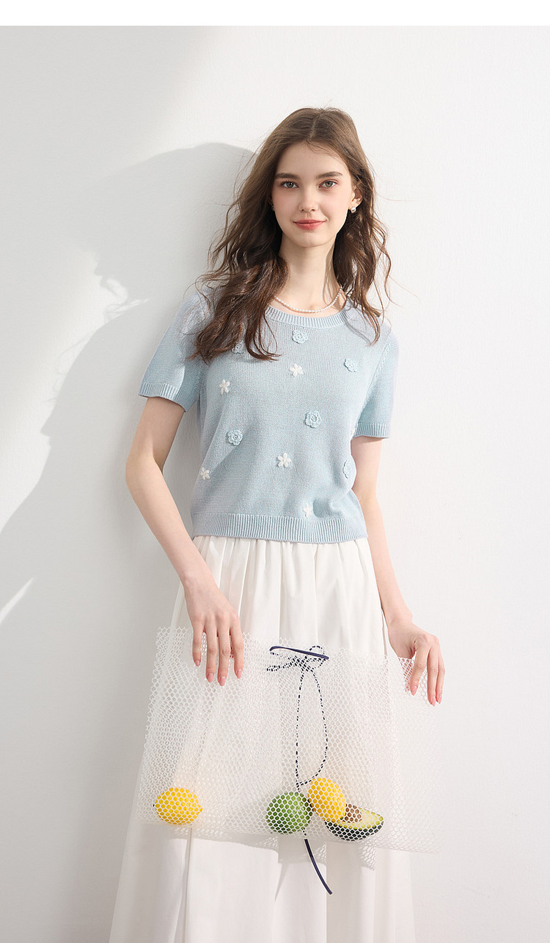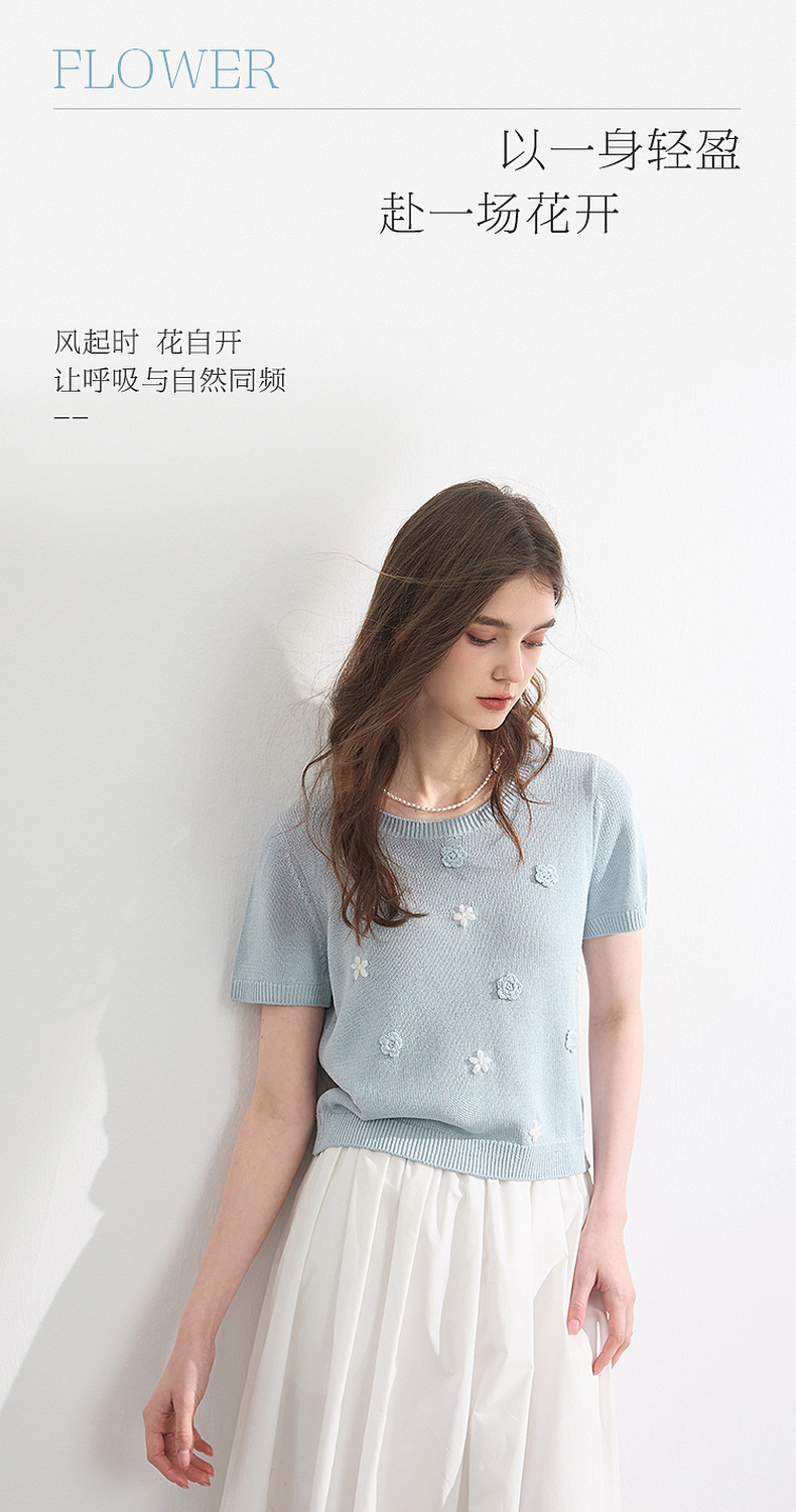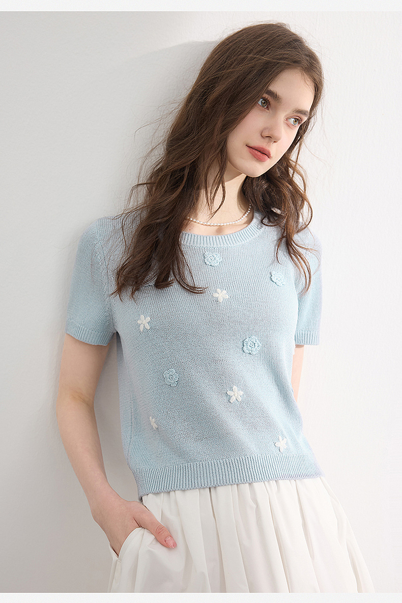 三彩2026夏季新款花朵针织衫圆领短袖正肩毛衫套头衫短款上衣M